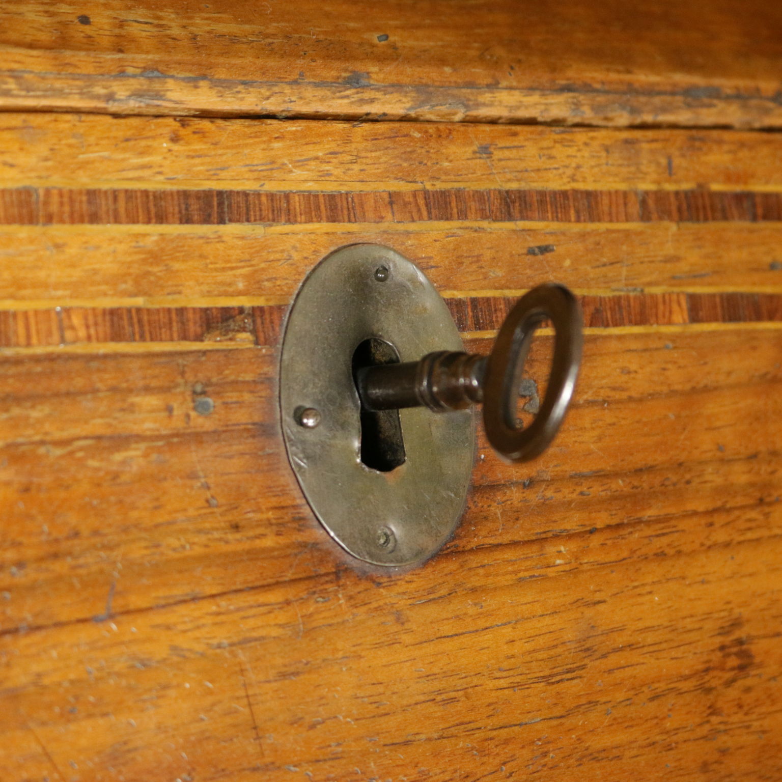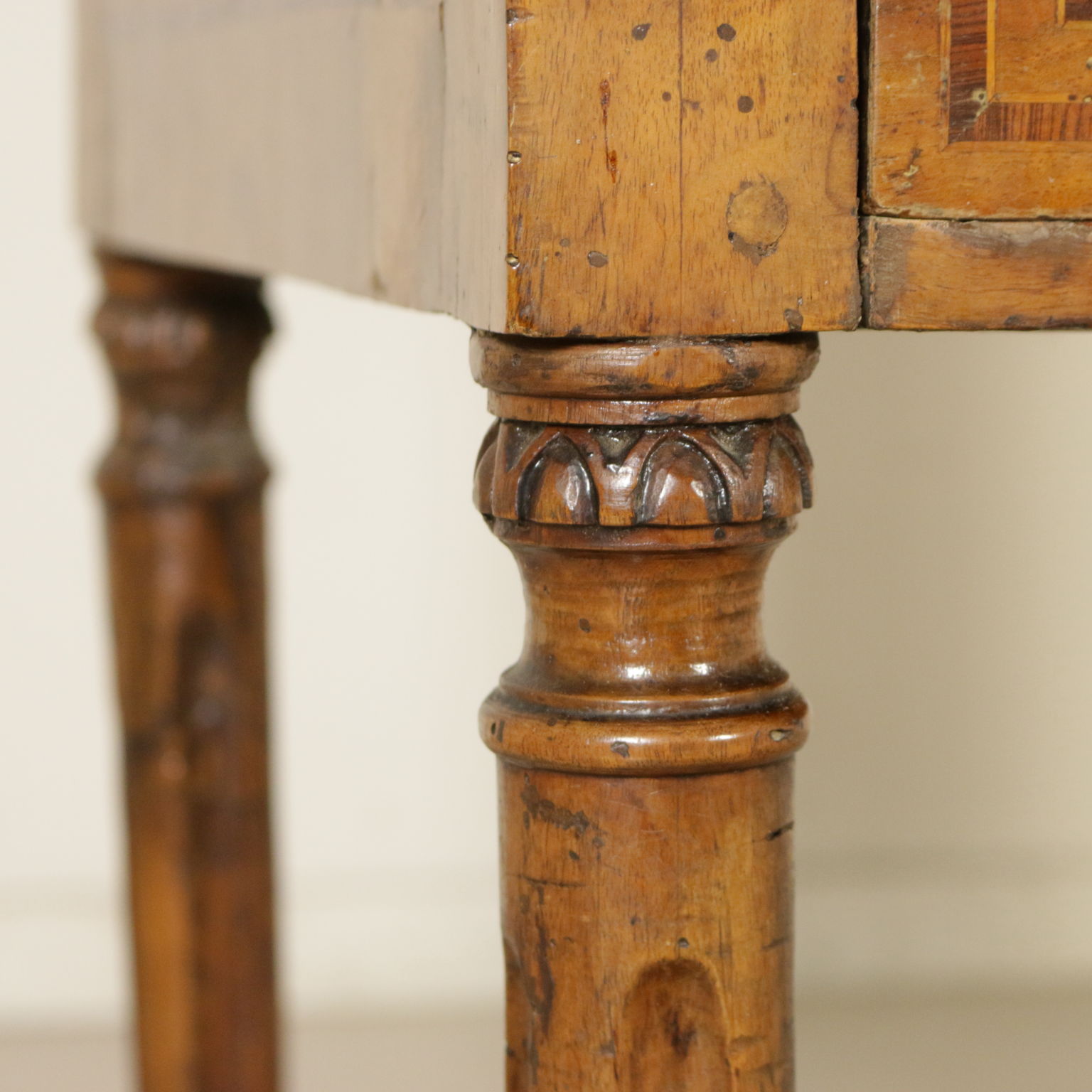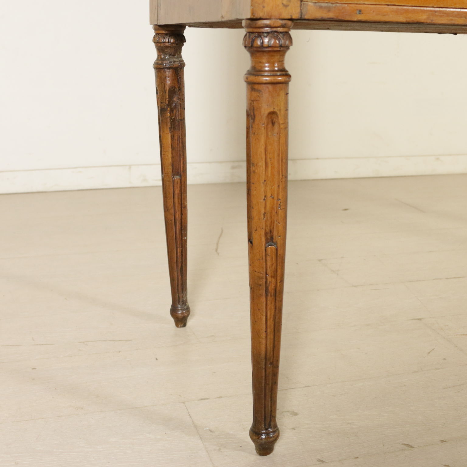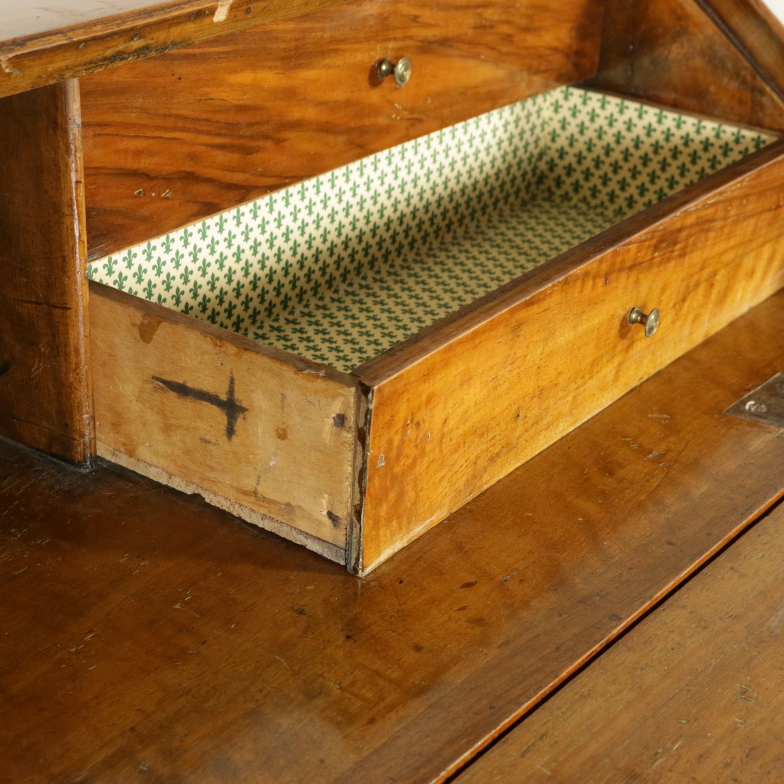 Retta da gambe troncoconiche rudentate con capitelli intagliati presenta coppia di cassetti con anta a ribalta. All'interno scarabattolo con quattro cassetti e vano a giorno. Doppia filettatura intarsiata a tappo con greche.