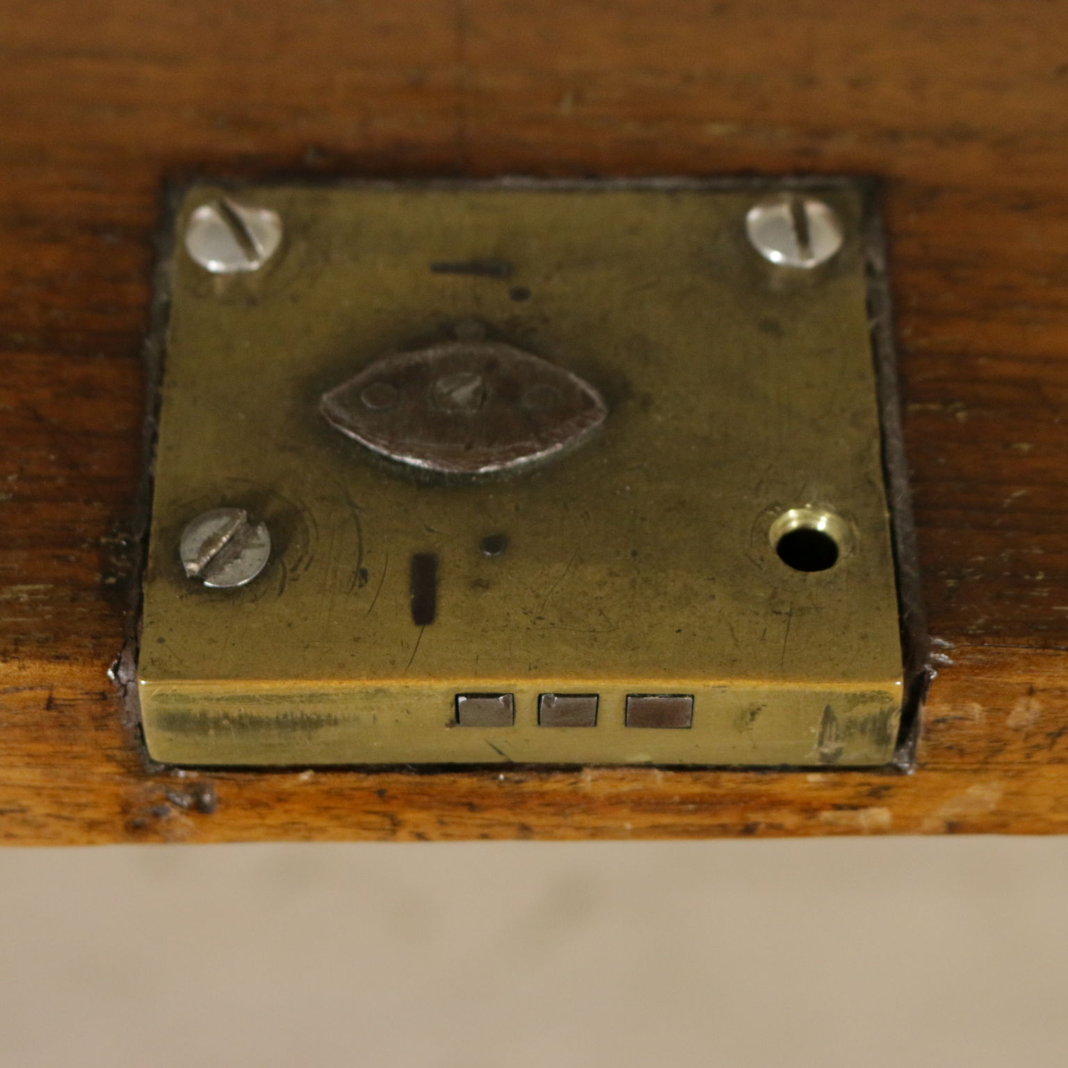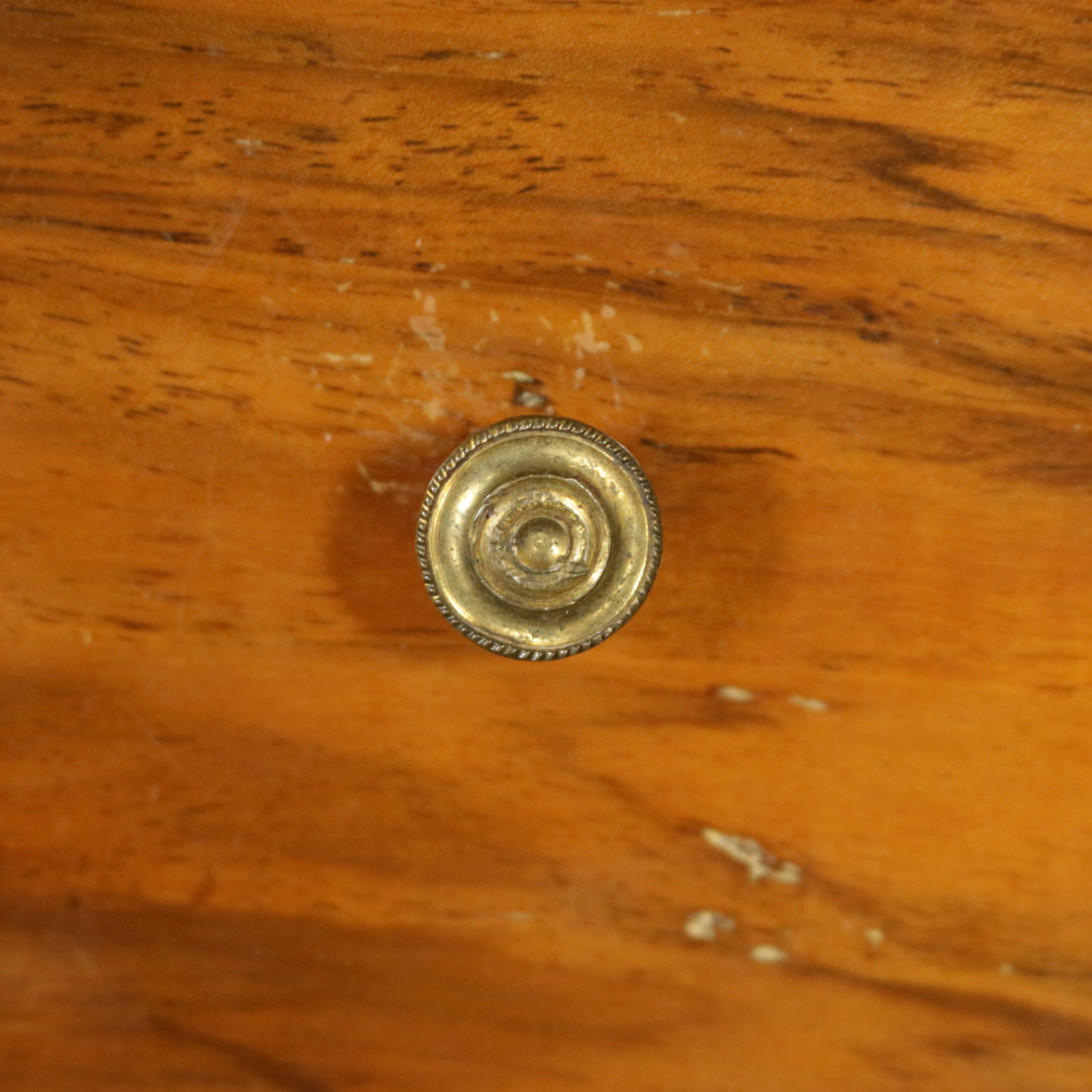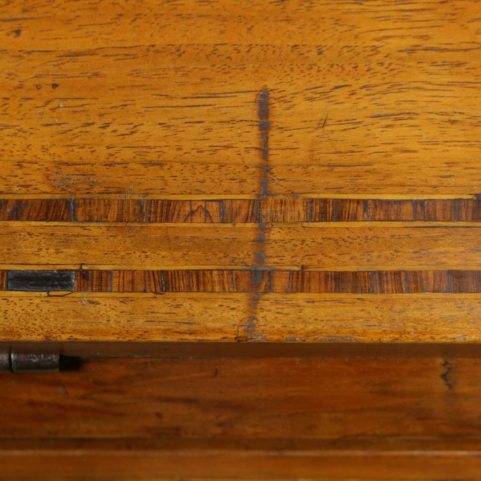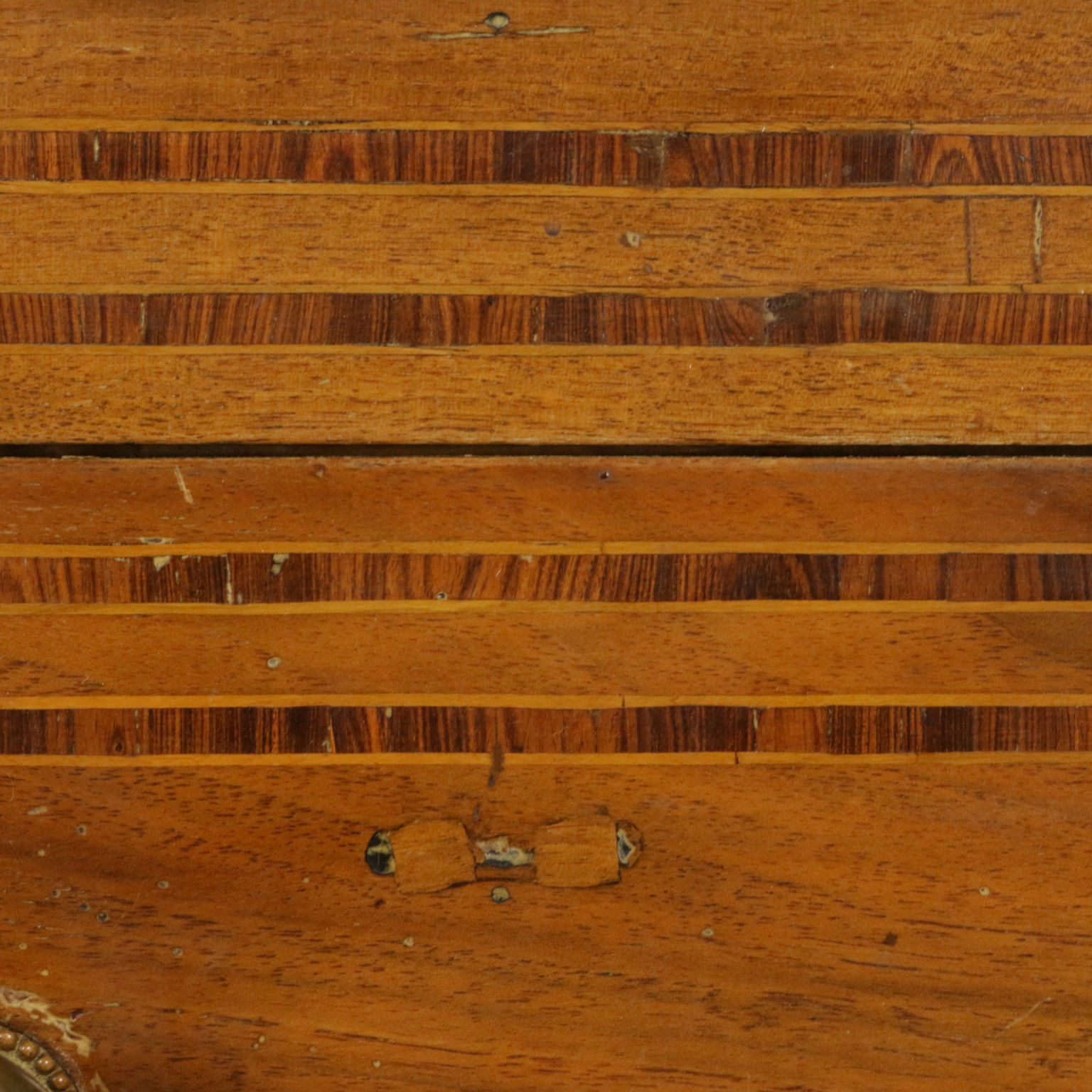 Retta da gambe troncoconiche rudentate con capitelli intagliati presenta coppia di cassetti con anta a ribalta. All'interno scarabattolo con quattro cassetti e vano a giorno. Doppia filettatura intarsiata a tappo con greche.