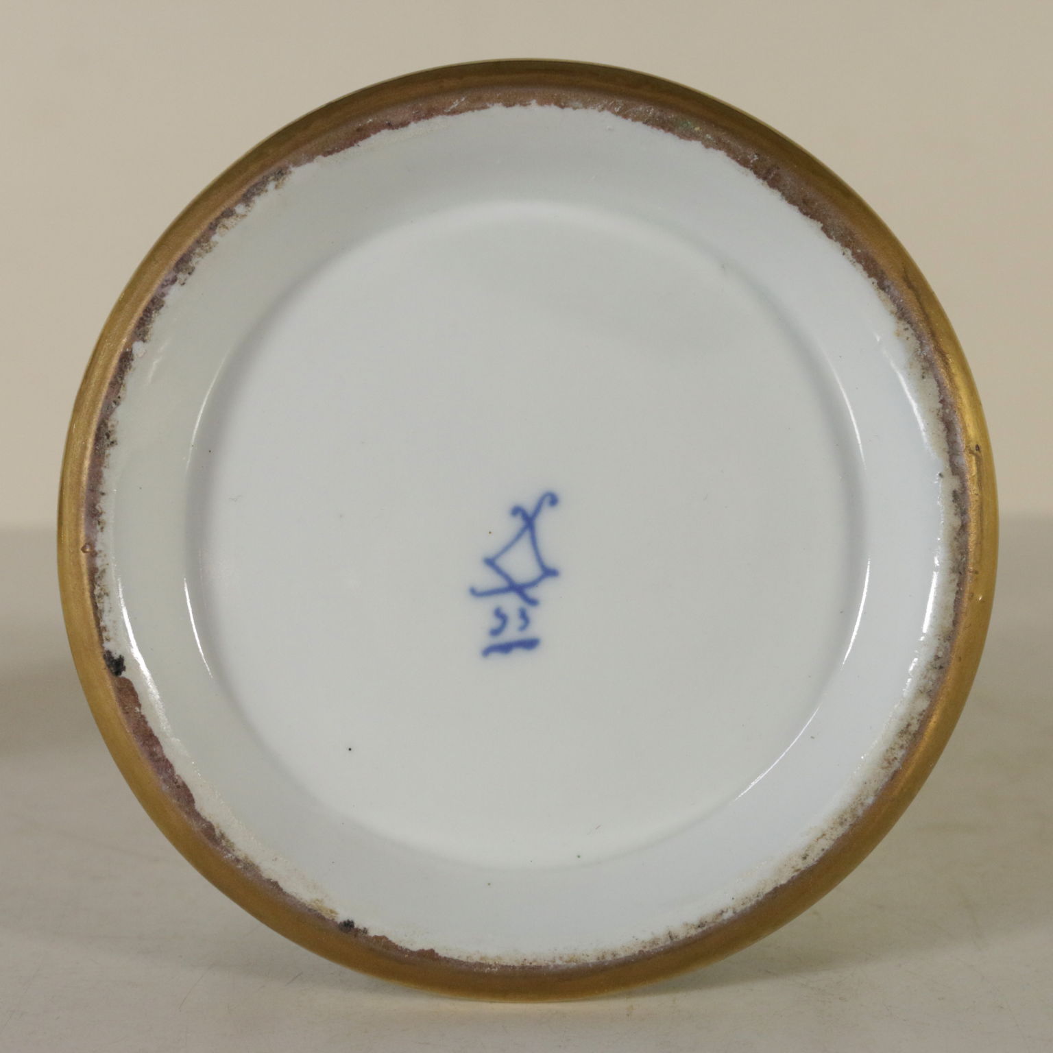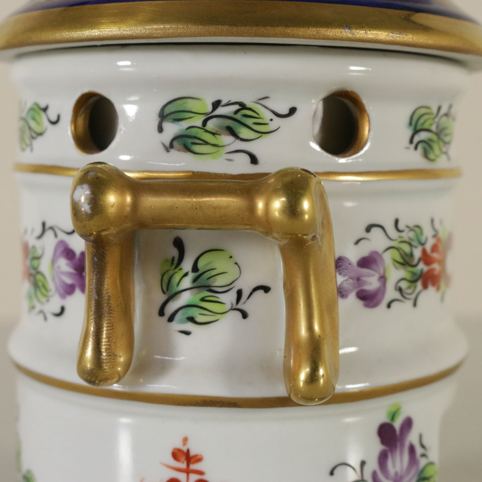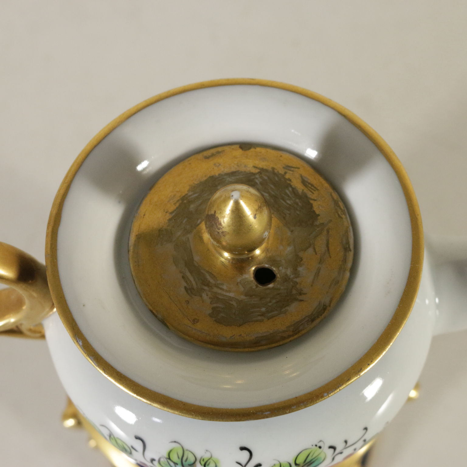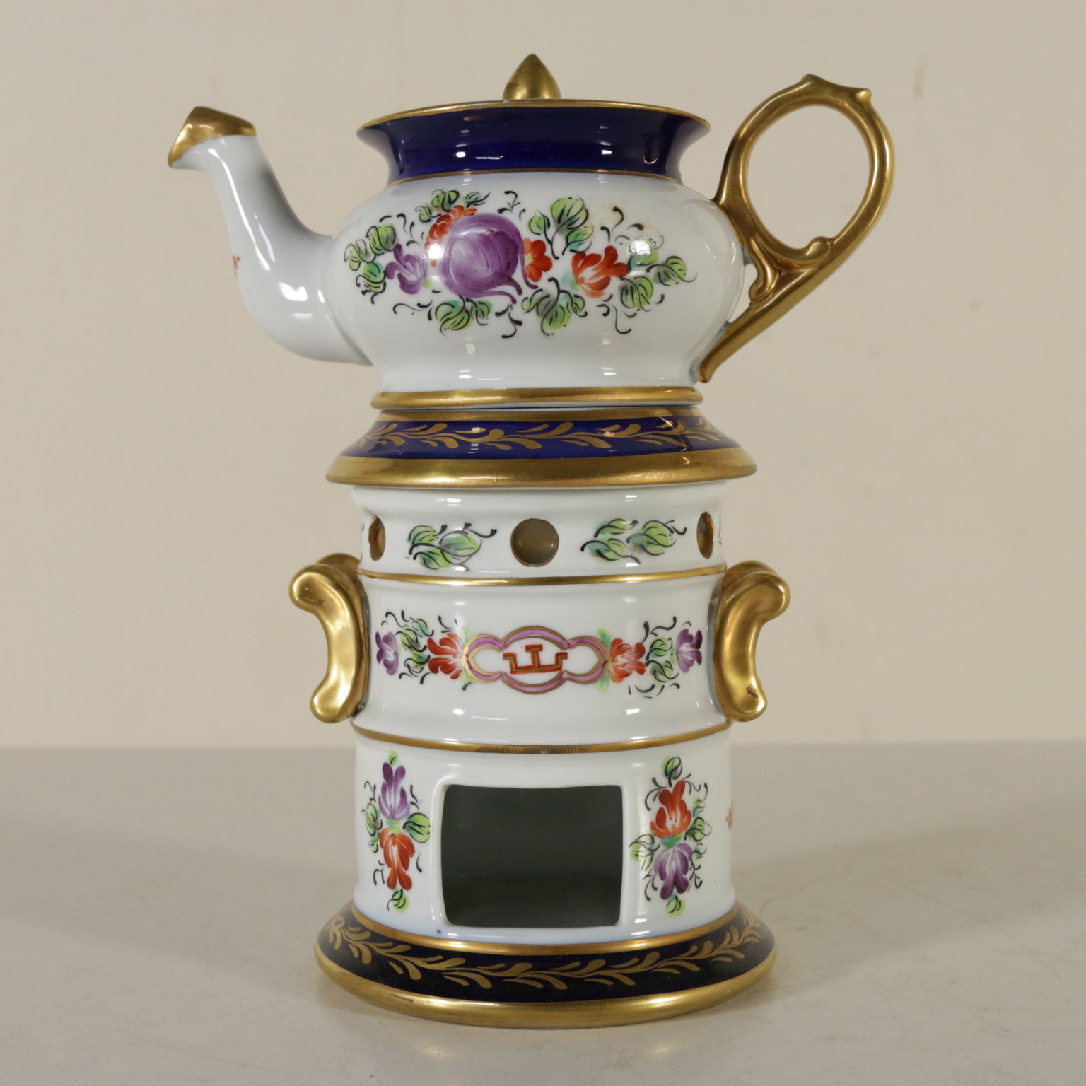 Caffettiera in porcellana con decori in oro zecchino e dipinti a motivo vegetale. Marchio della manifattura sotto la base.