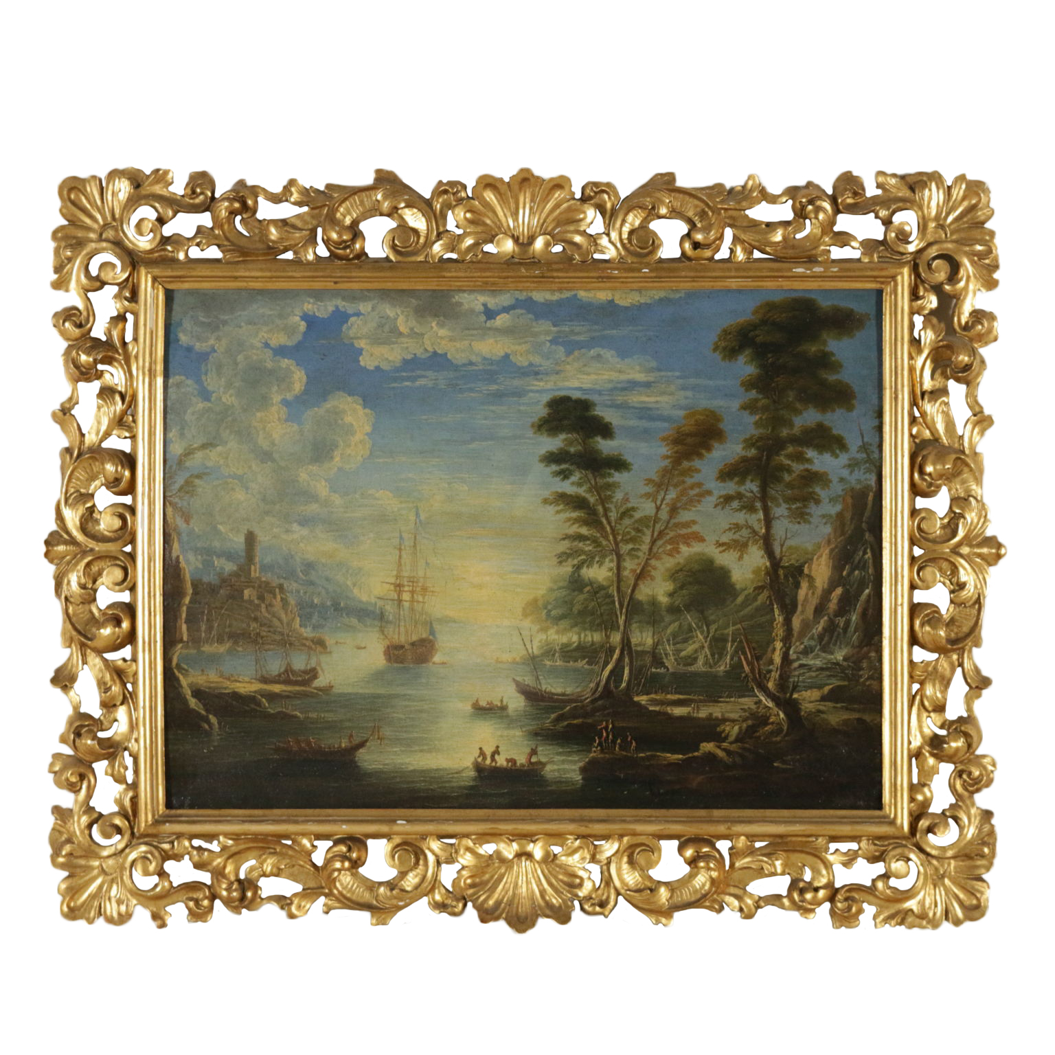 Olio su tela. L'opera, per i suoi caratteri stilistici, richiama il lavoro di Orazio Grevenbroek (c. 1670-1743), pittore di origine olandese attivo però a Roma e poi a Napoli; si giustifica così l'impronta nordica presente nel dipinto, mediata però nel paesaggismo romano e partenopeo. In particolare Grevenbroek predilige nelle sue opere la fantasia compositiva rispetto alla veduta effettiva, coniugando elementi paesaggistici, architettonici e di figure. Restaurato e ritelato, il dipinto conserva il telaio originale; è presentato in cornice in stile.