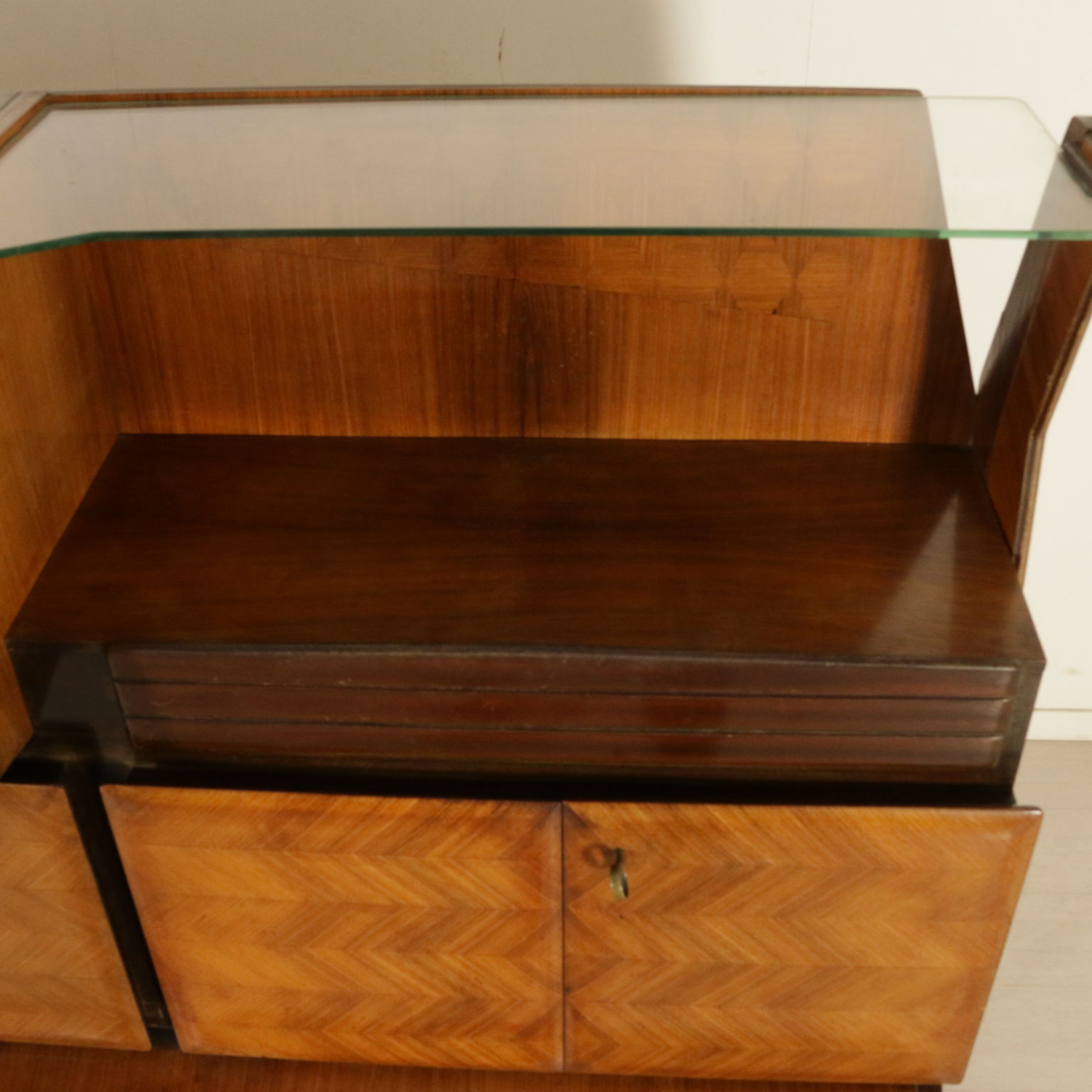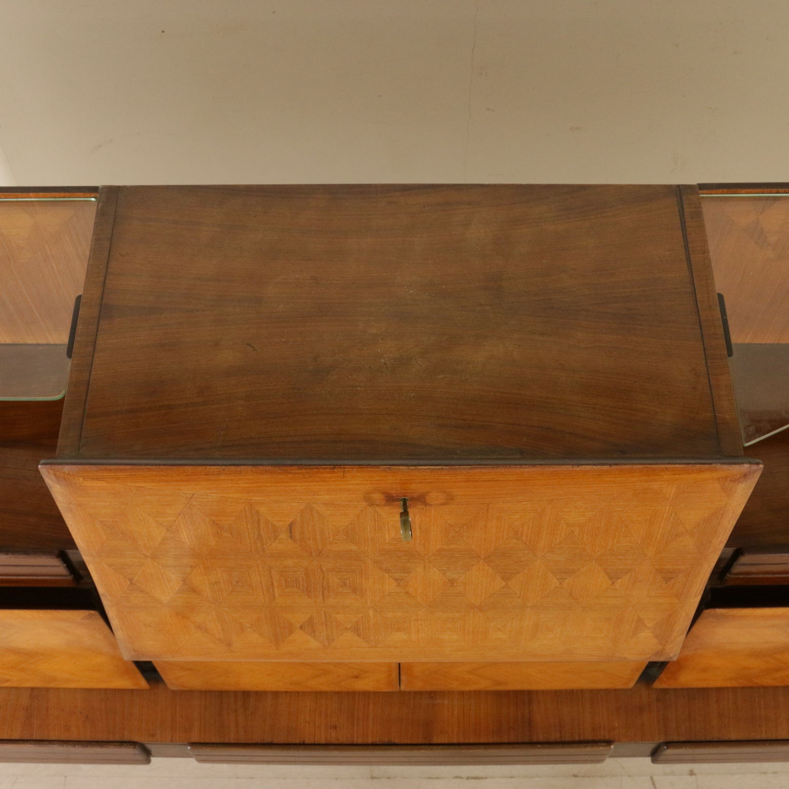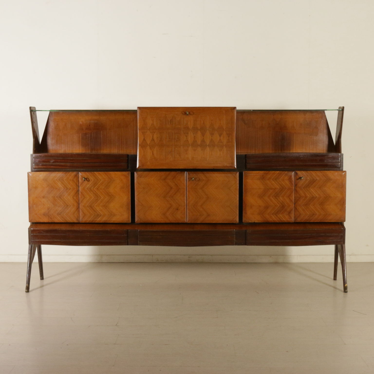 Mobile credenza nello stile di Ico Parisi con anta a ribalta, ante battenti e cassetti. Legno impiallacciato palissandro, mensole in vetro.