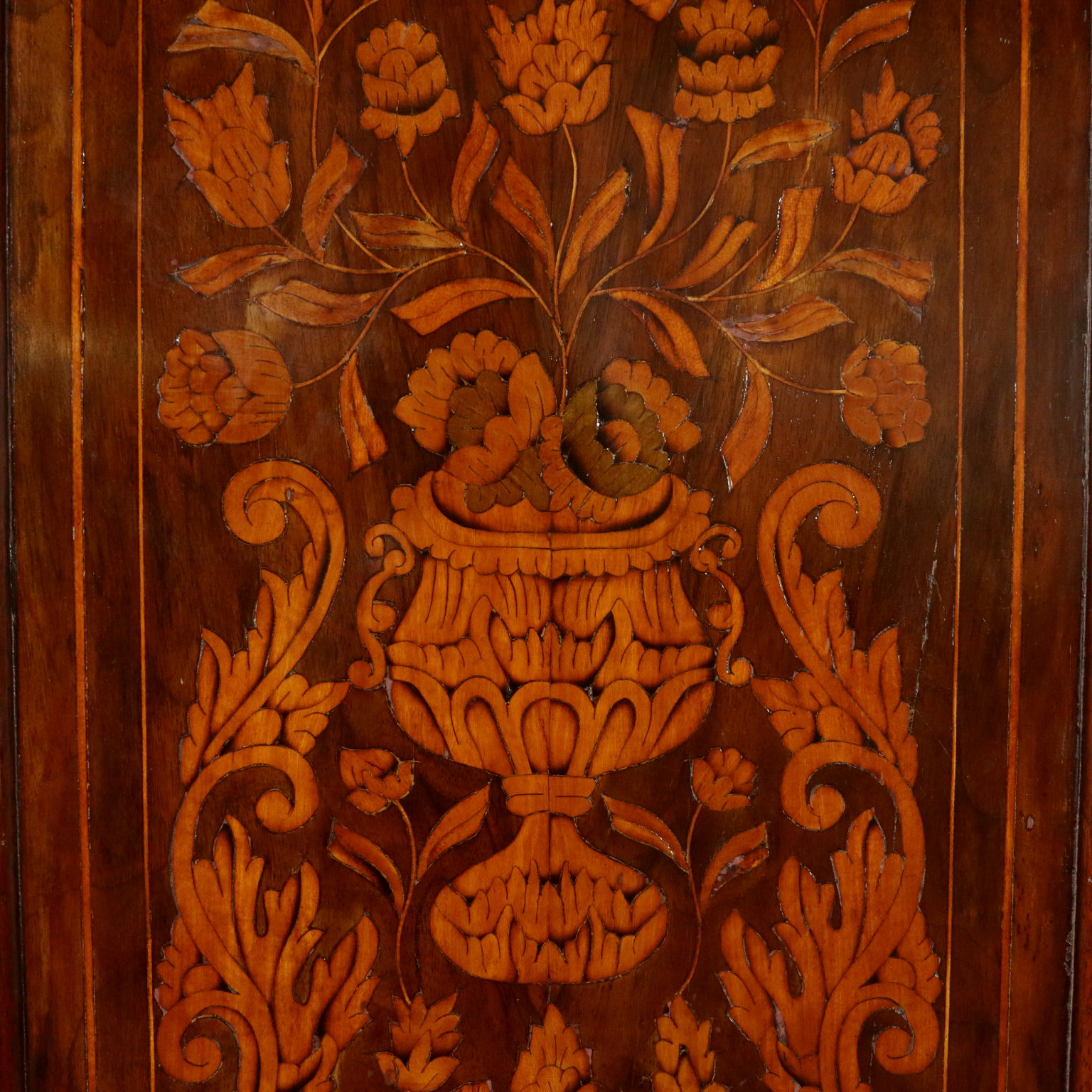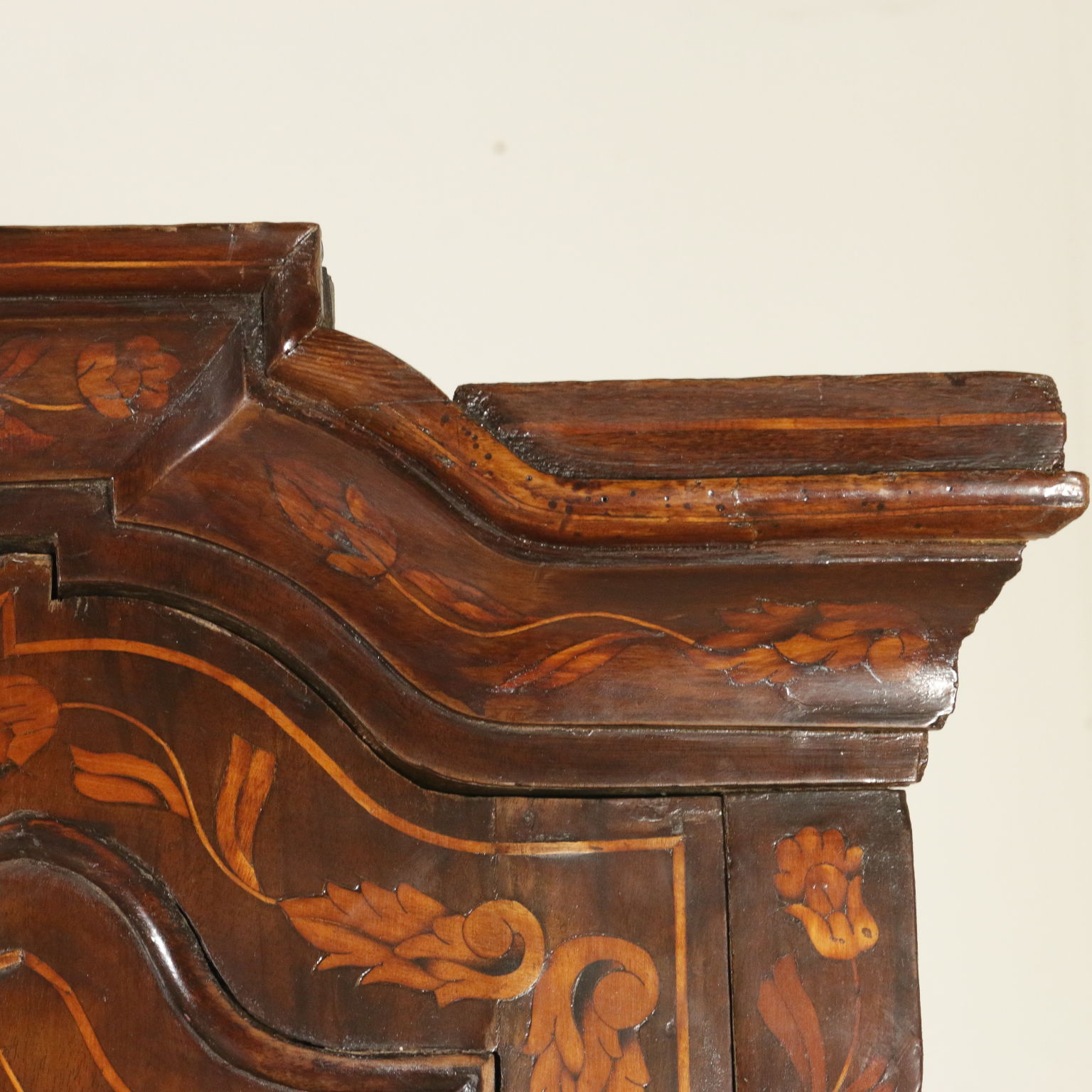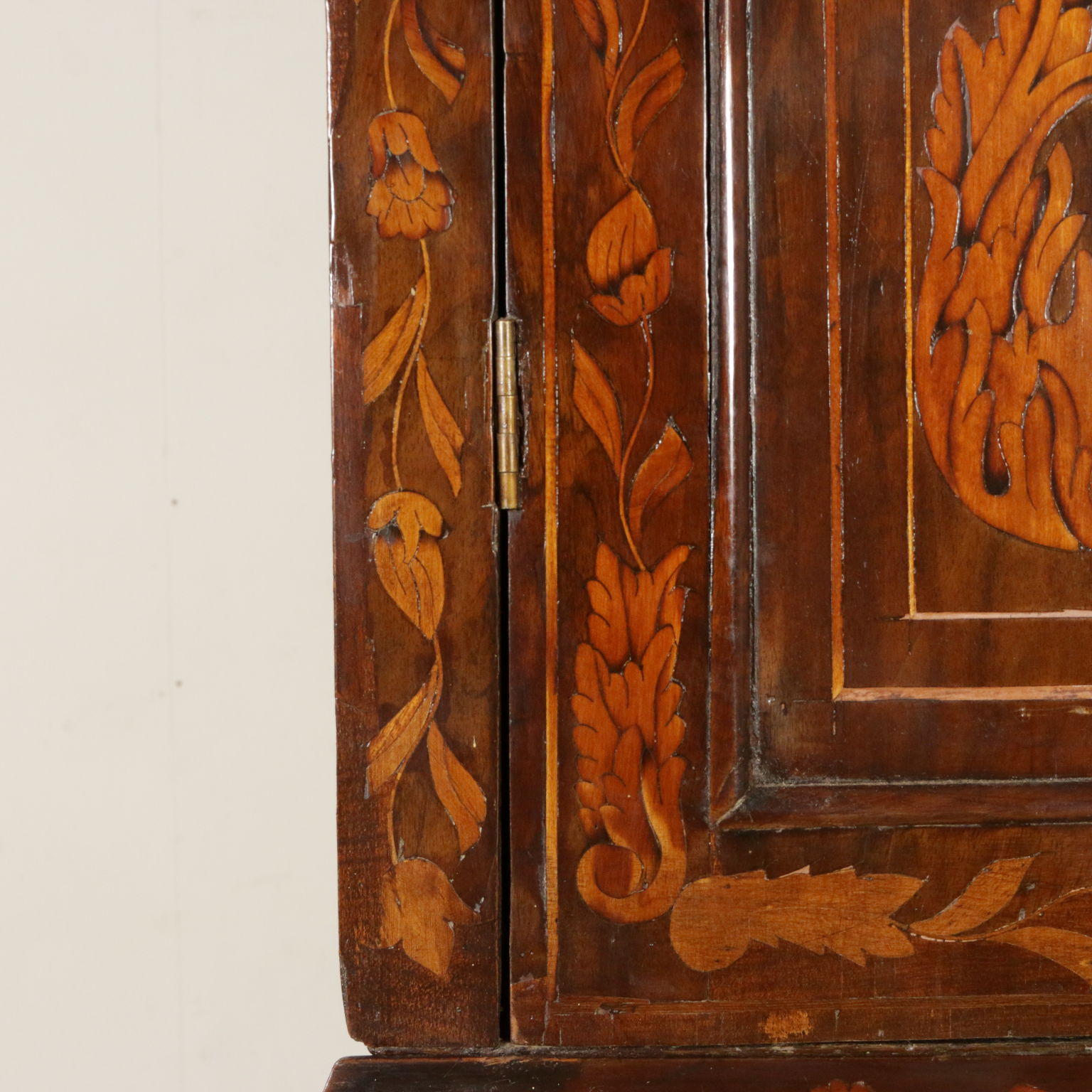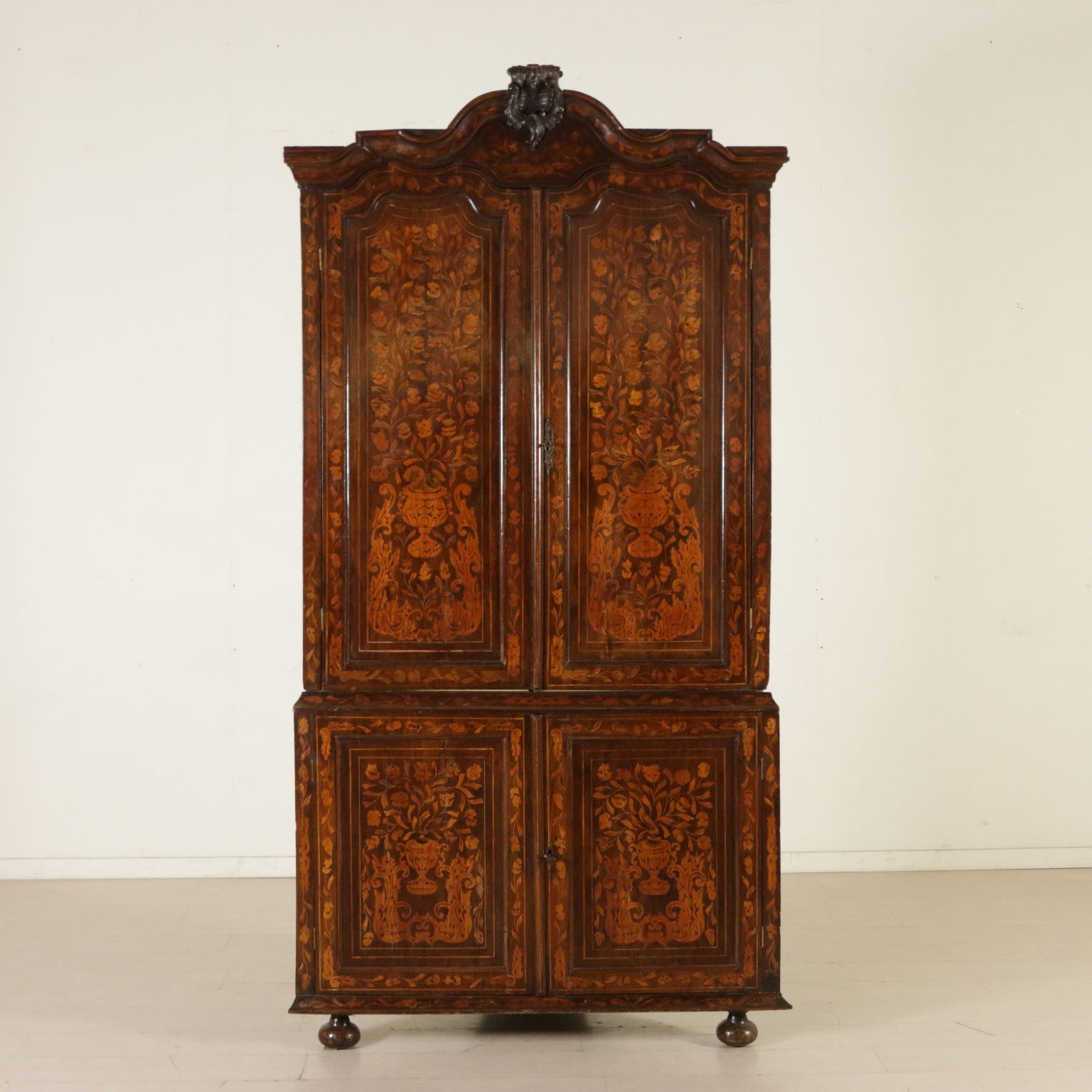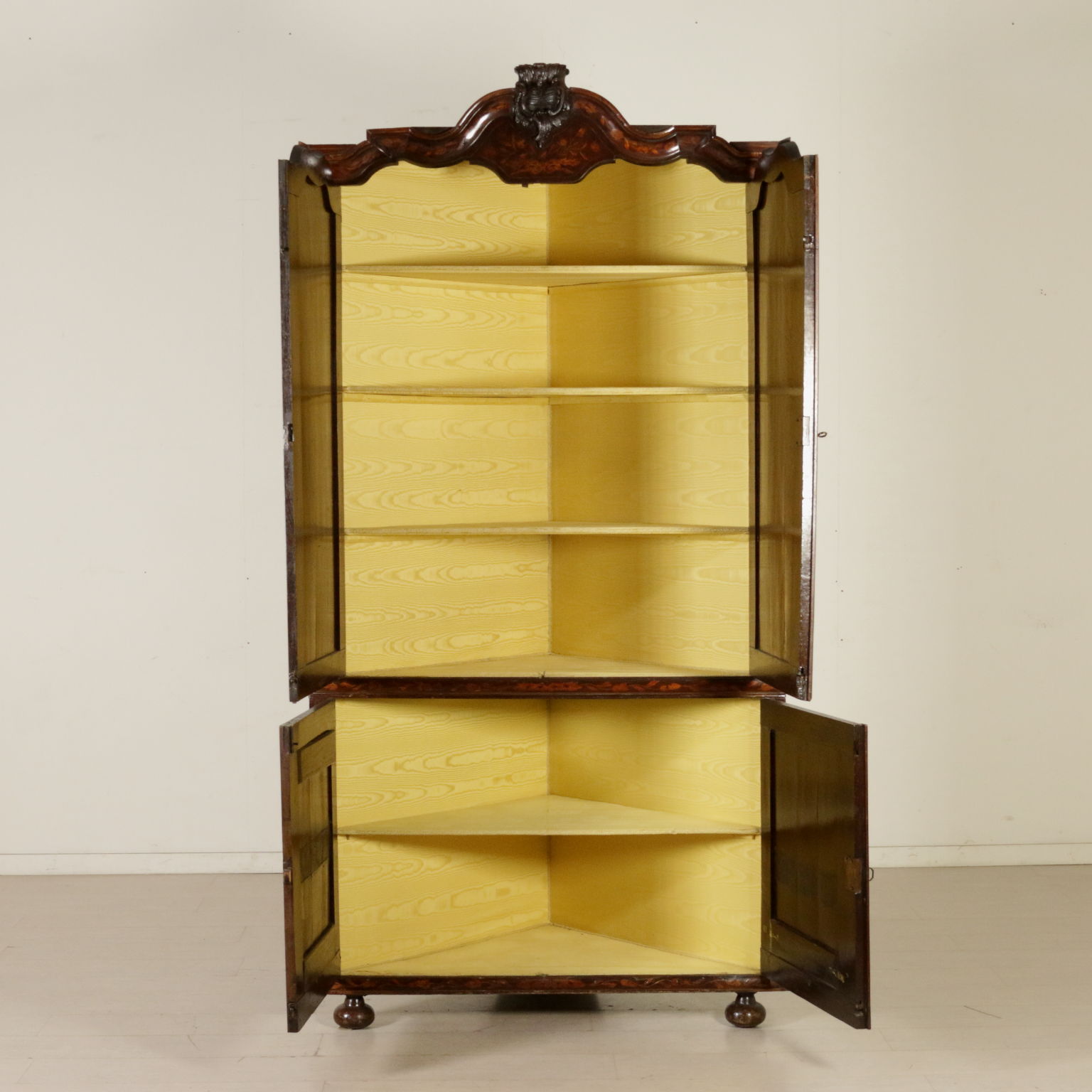 Elegante angoliera a due corpi, presenta quattro ante di cui le superiori sagomate. Riccamente intarsiata in acero con anfore centrali, motivi fogliacei, fiori e "tulipano mania". Cimasa sagomata con intaglio centrale. Retta da piedi torniti.