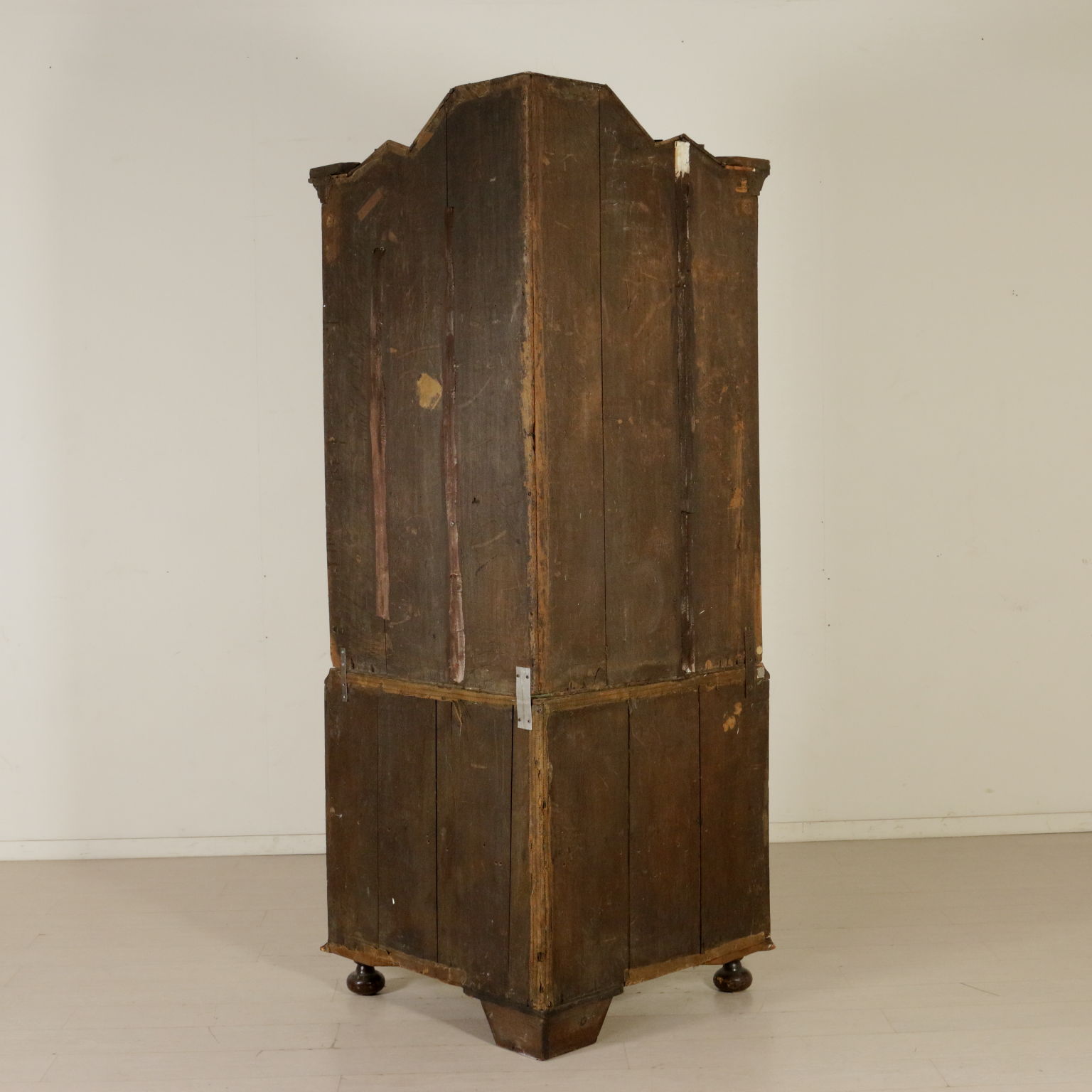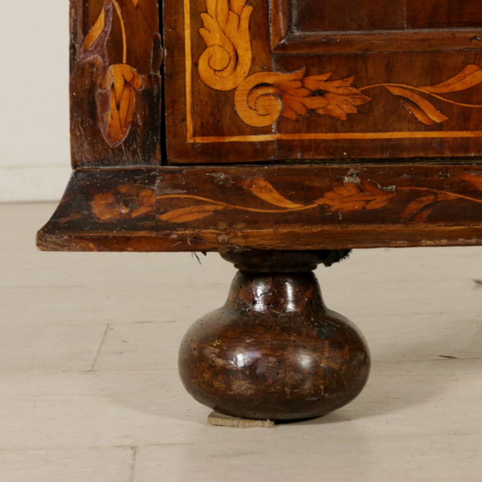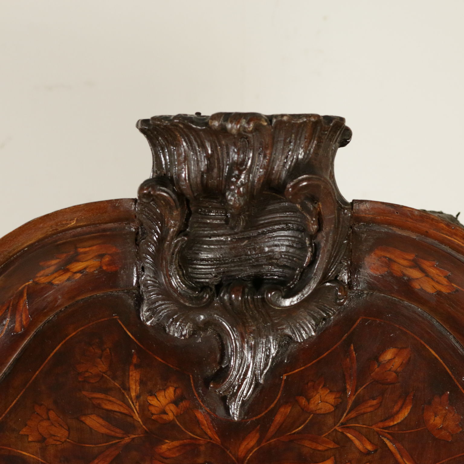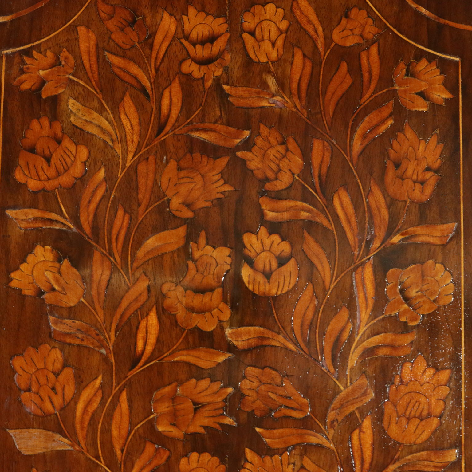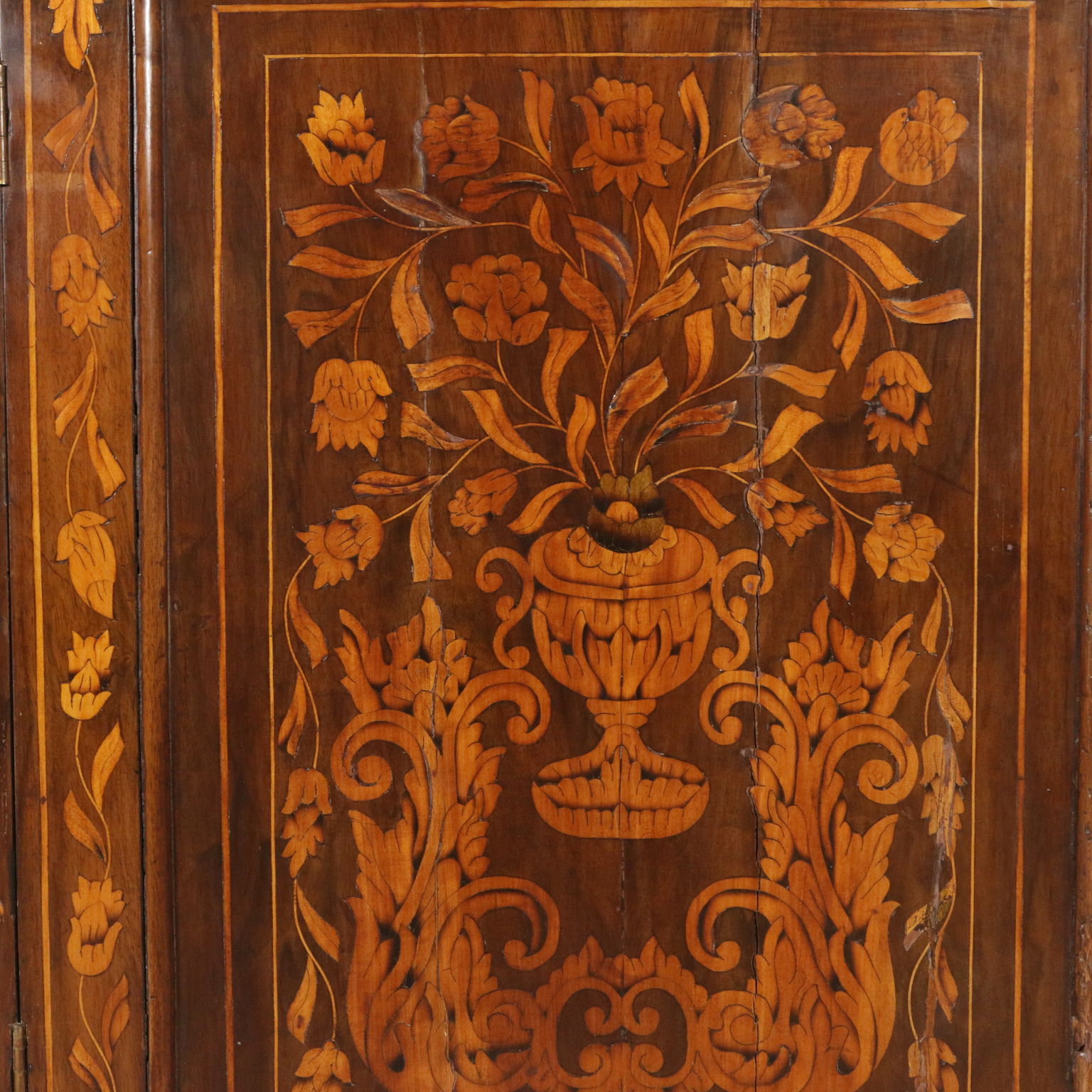 Elegante angoliera a due corpi, presenta quattro ante di cui le superiori sagomate. Riccamente intarsiata in acero con anfore centrali, motivi fogliacei, fiori e "tulipano mania". Cimasa sagomata con intaglio centrale. Retta da piedi torniti.