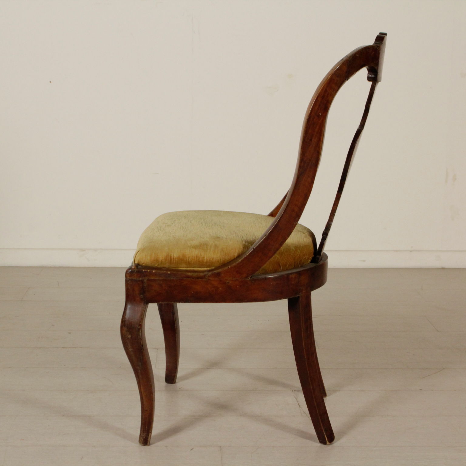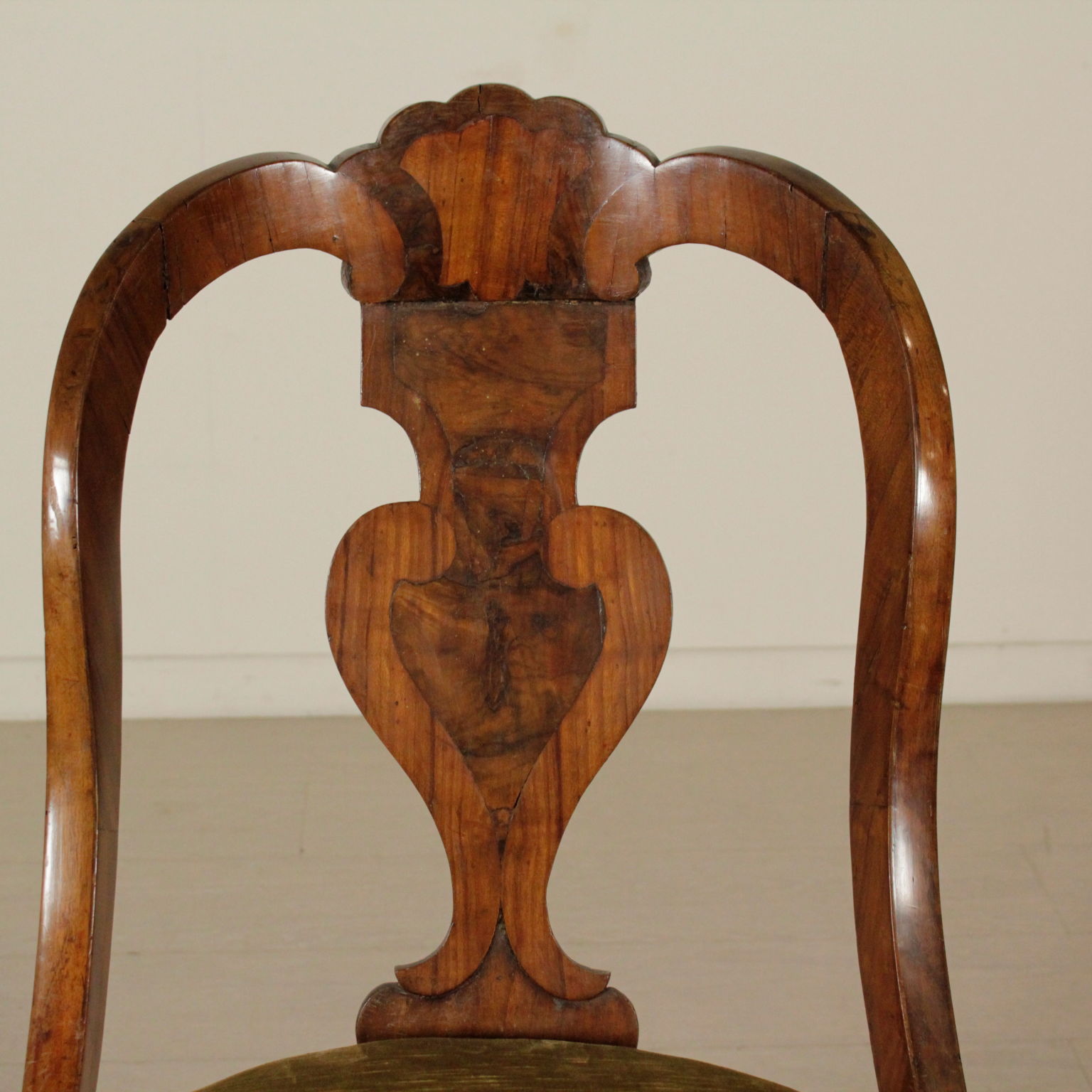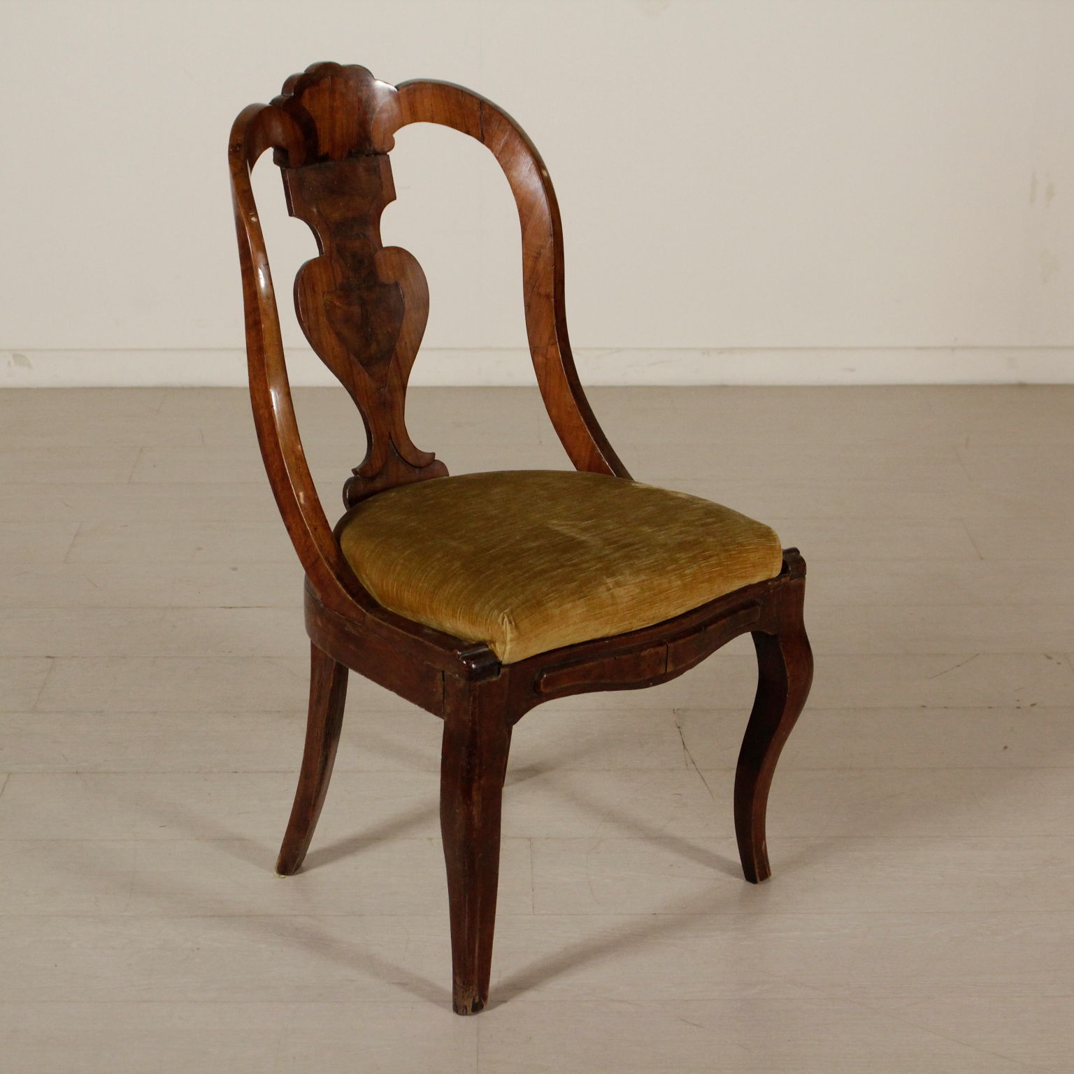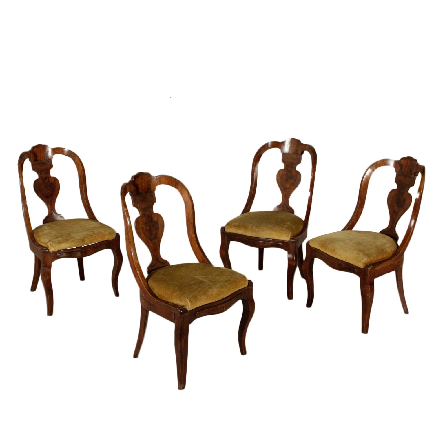 Elegante gruppo di sedie rette da gambe mosse presentano schienale a gondola con cartella sagomata con riserva in radica. Fascia con formelle in radica.