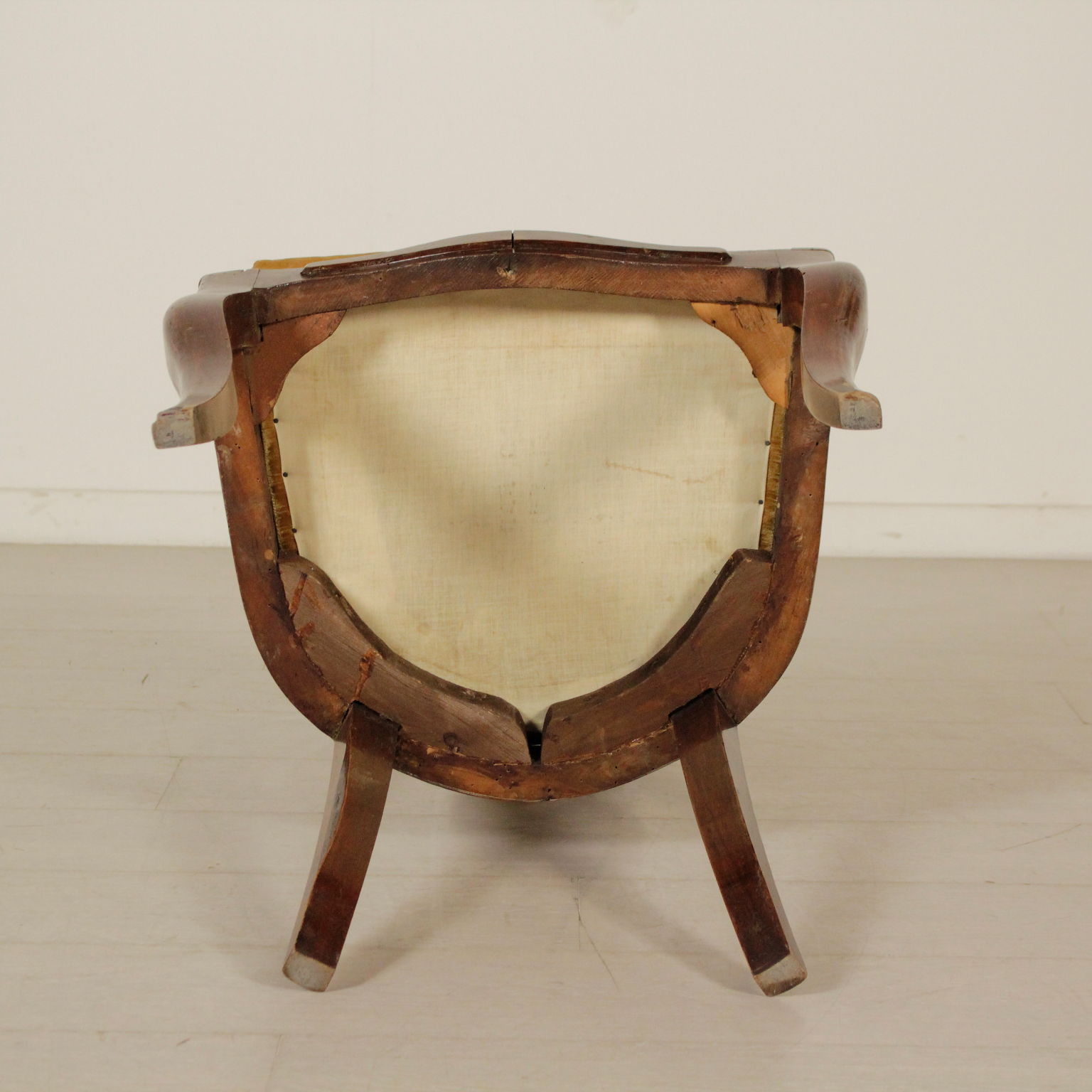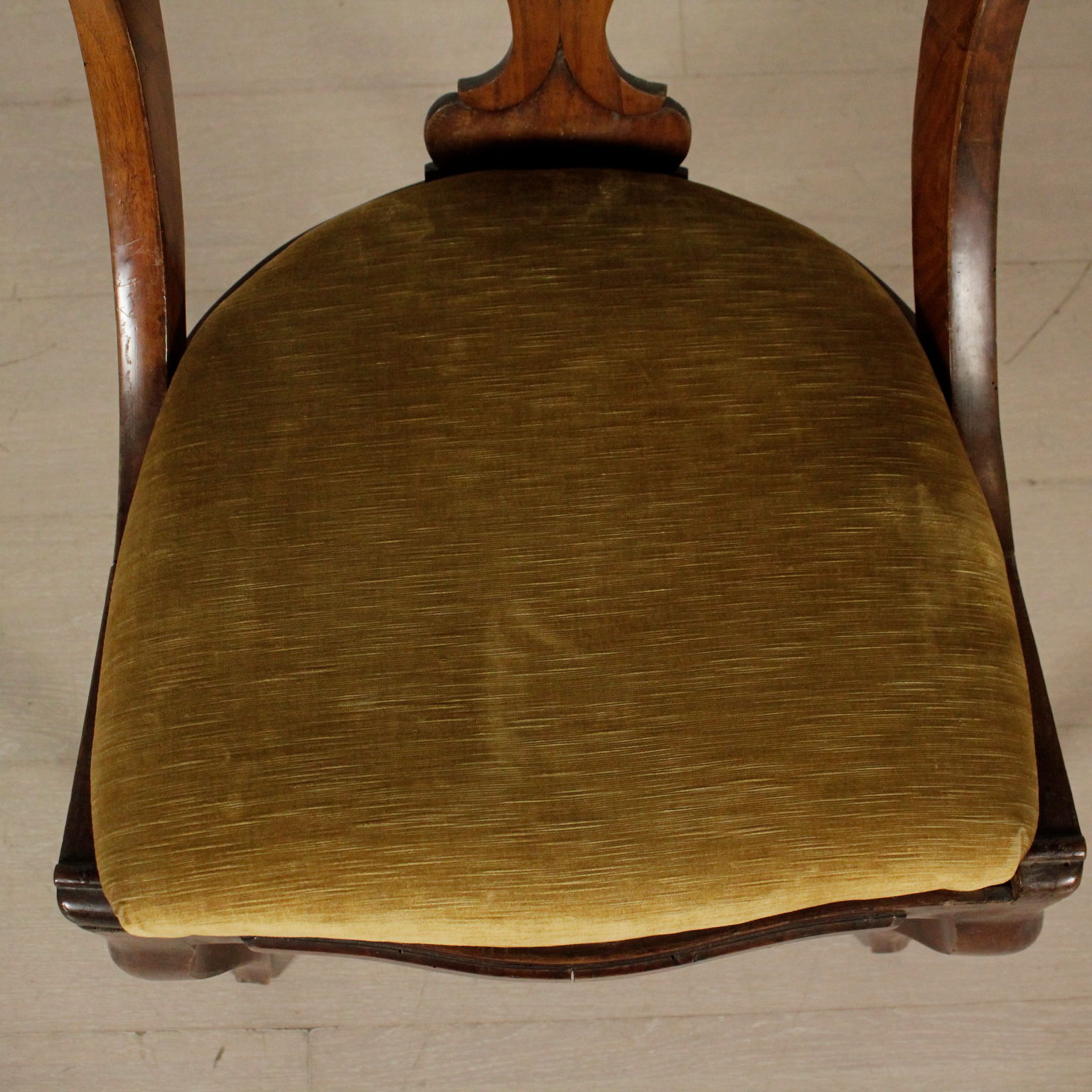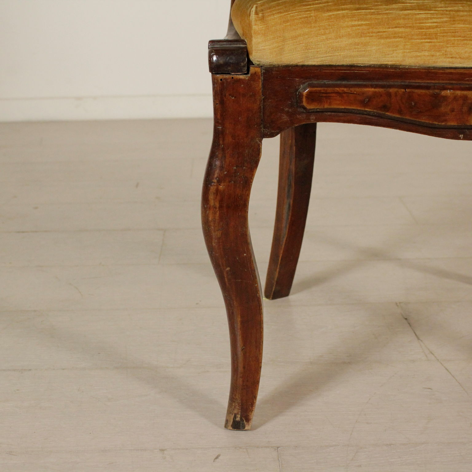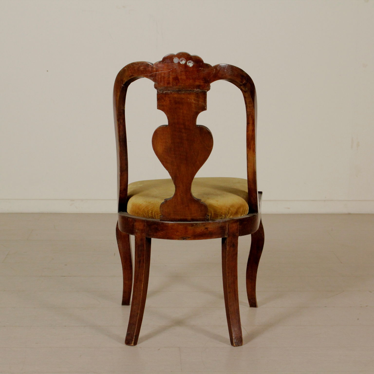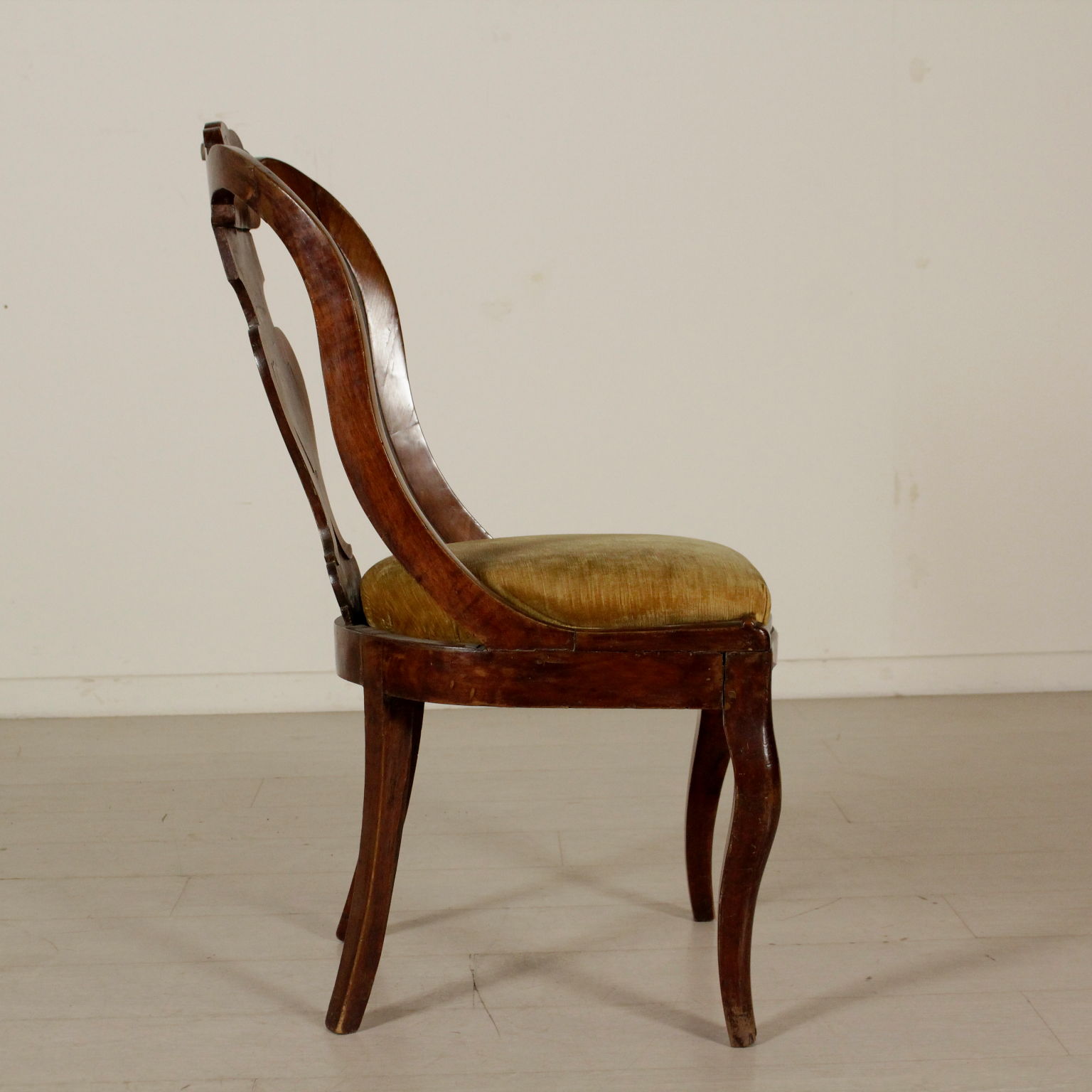 Elegante gruppo di sedie rette da gambe mosse presentano schienale a gondola con cartella sagomata con riserva in radica. Fascia con formelle in radica.