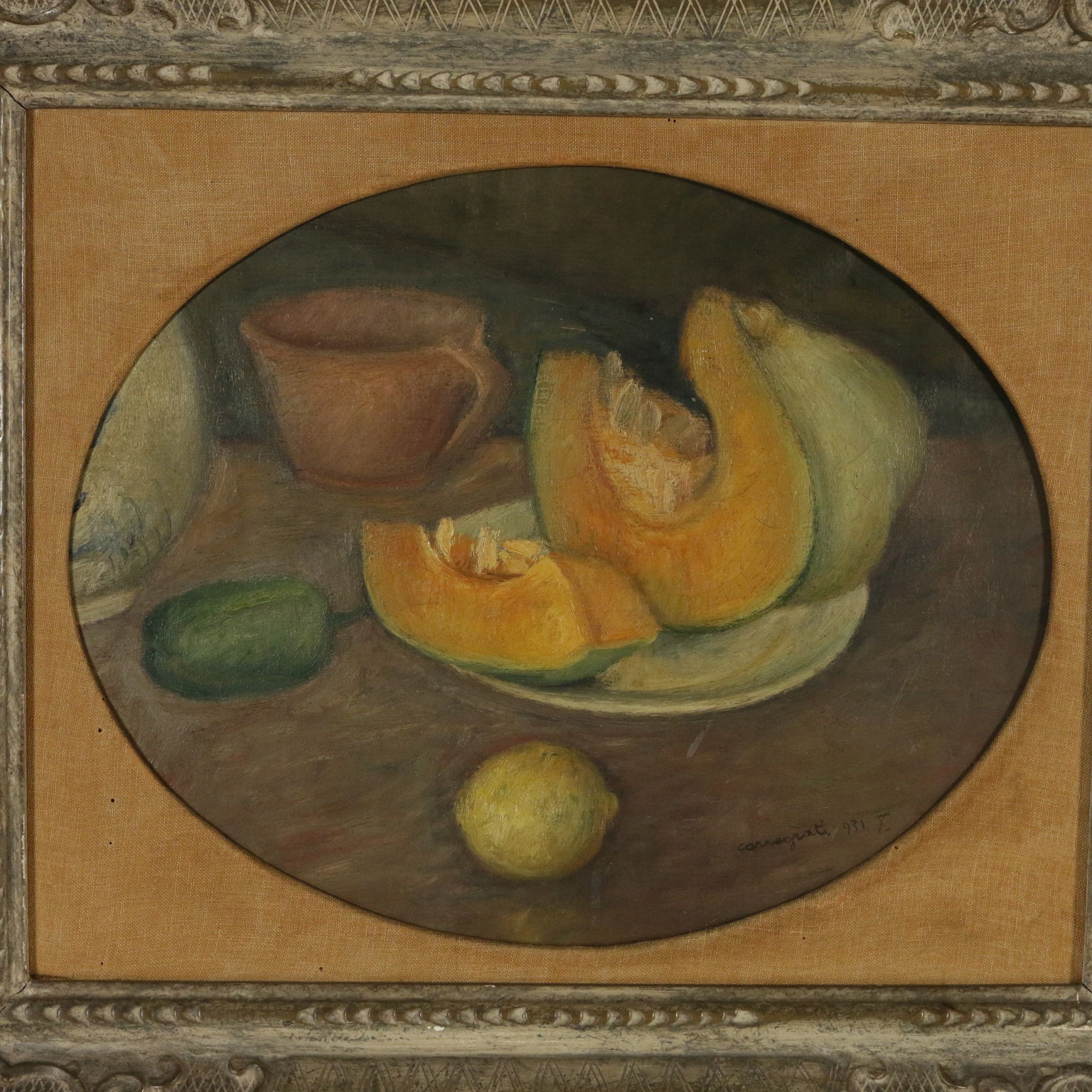 Olio su tela ovale. Firmato e datato '931 (e anno dell'era fascista X) in basso a destra. Il giovane artista milanese, che ha goduto di larga notorietà negli anni Trenta, è considerato tra i rappresentanti delle tendenze pittoriche lombarde del Novecento italiano; la sua pittura esprime profonde qualità coloristiche sia nei quadri di paesaggio che nelle composizioni e nelle figure. In cornice.
