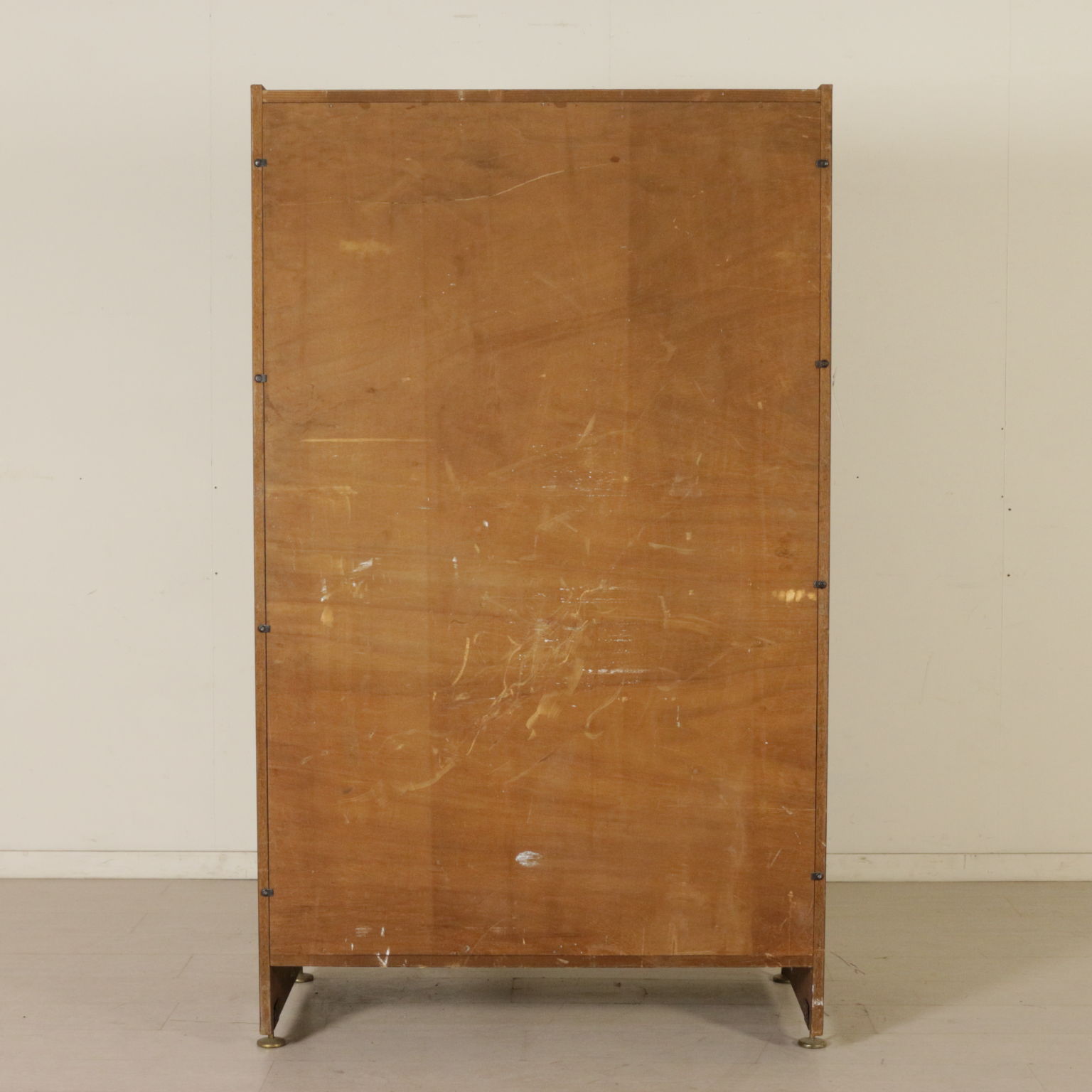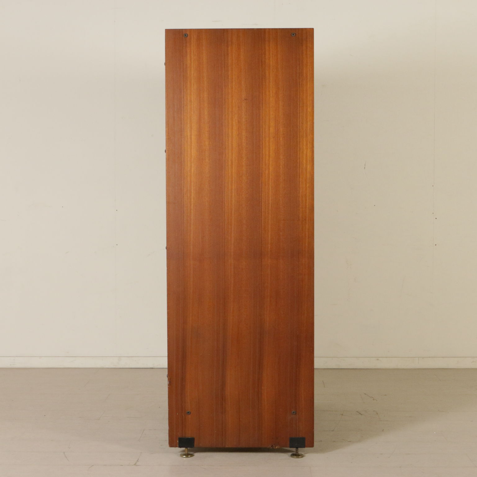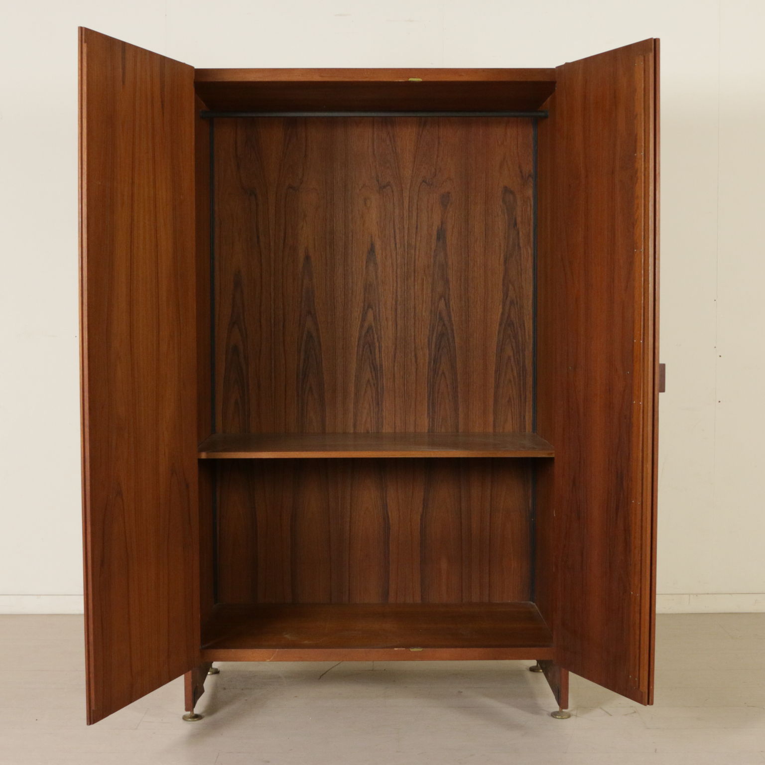 Mobile armadio a due ante battenti; legno impiallacciato teak, rivestimento in tessuto, piedi in metallo ed ottone.