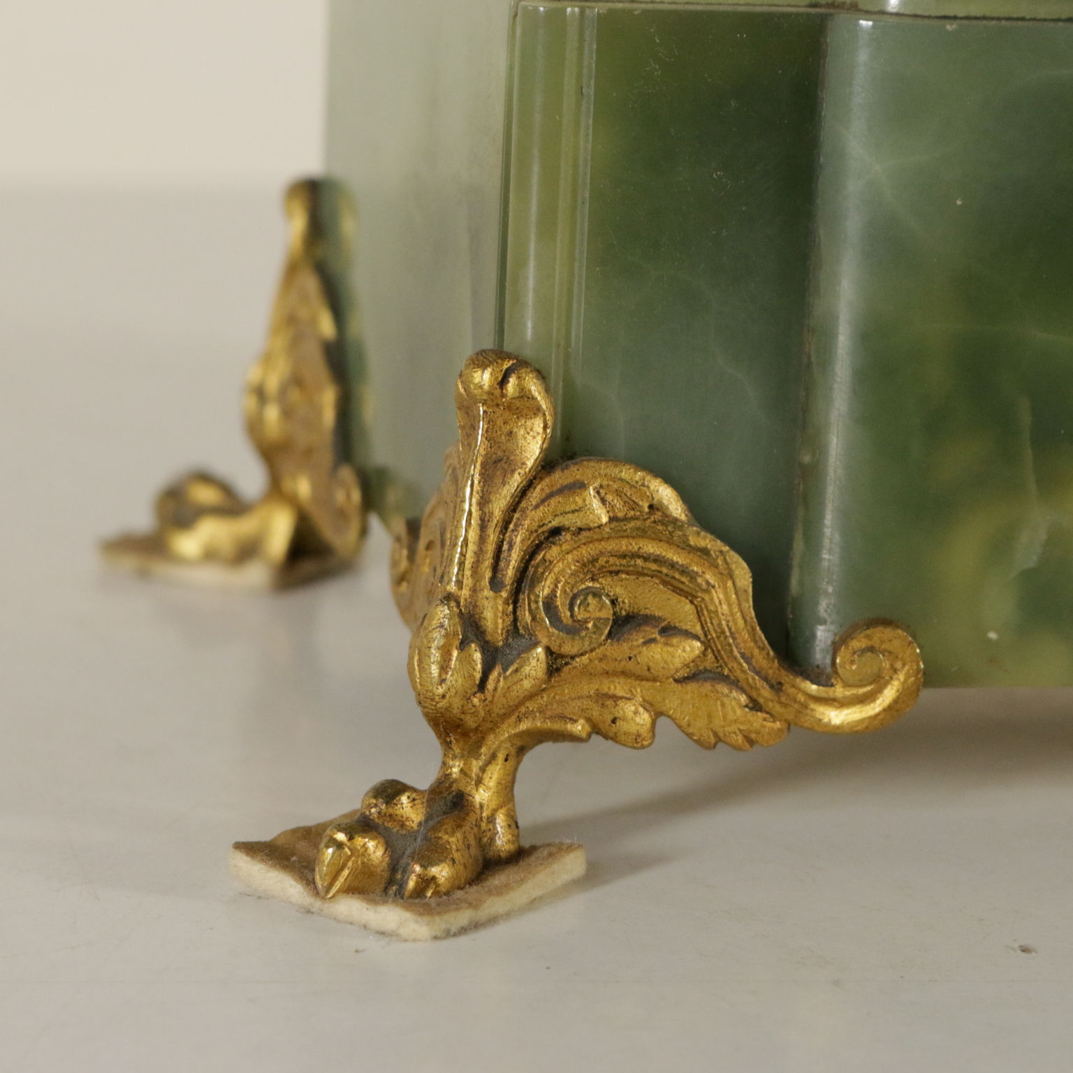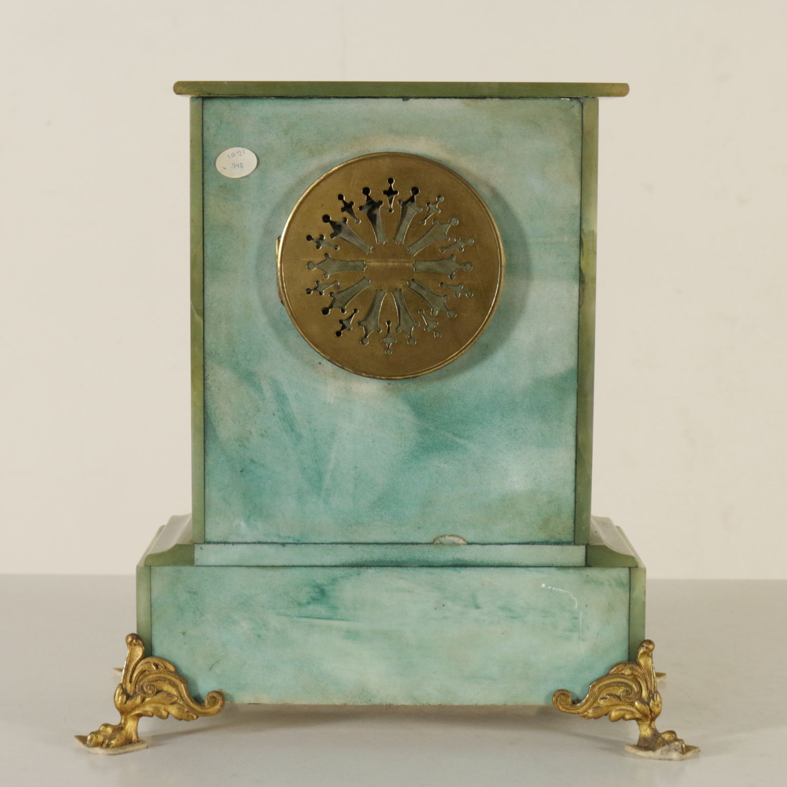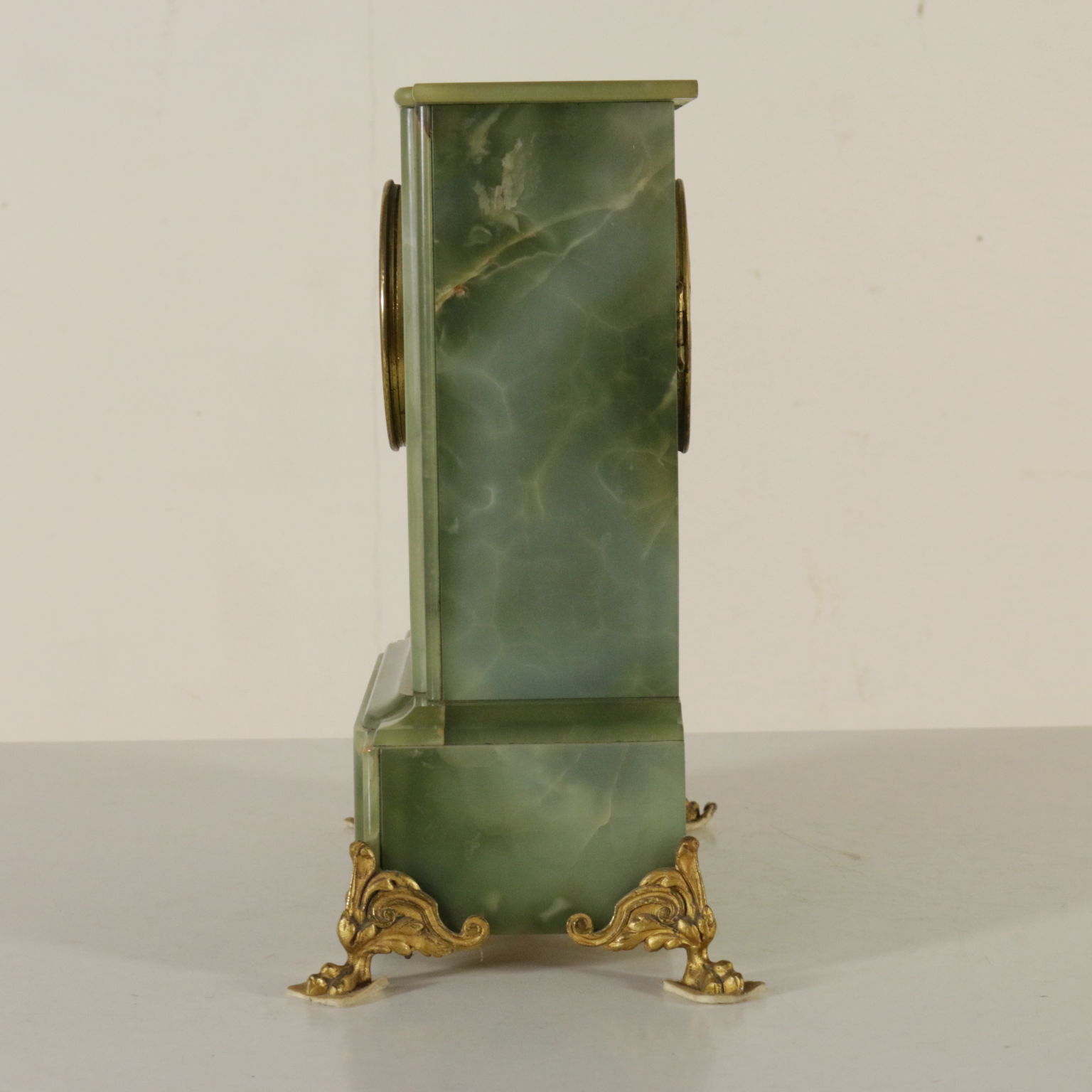 Orologio in onice sorretto da piedini in bronzo. Mostra firmata A.te Mugnier con parte del meccanismo a vista e ore disegnate a numeri romani su metallo smaltato. Meccanica firmata F. Benard a Paris.