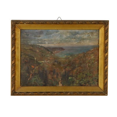 Olio su compensato. Firmato in basso a sinistra. L'artista ligure è noto per i suoi paesaggi che raffigurano prevalentemente scorci della costa ligure o angoli della campagna piemontese; in essi la bellezza del paesaggio e della natura, ripresi dal vero, è interpretata con profonda partecipazione e spontaneità. Il dipinto è presentato in cornice coeva.