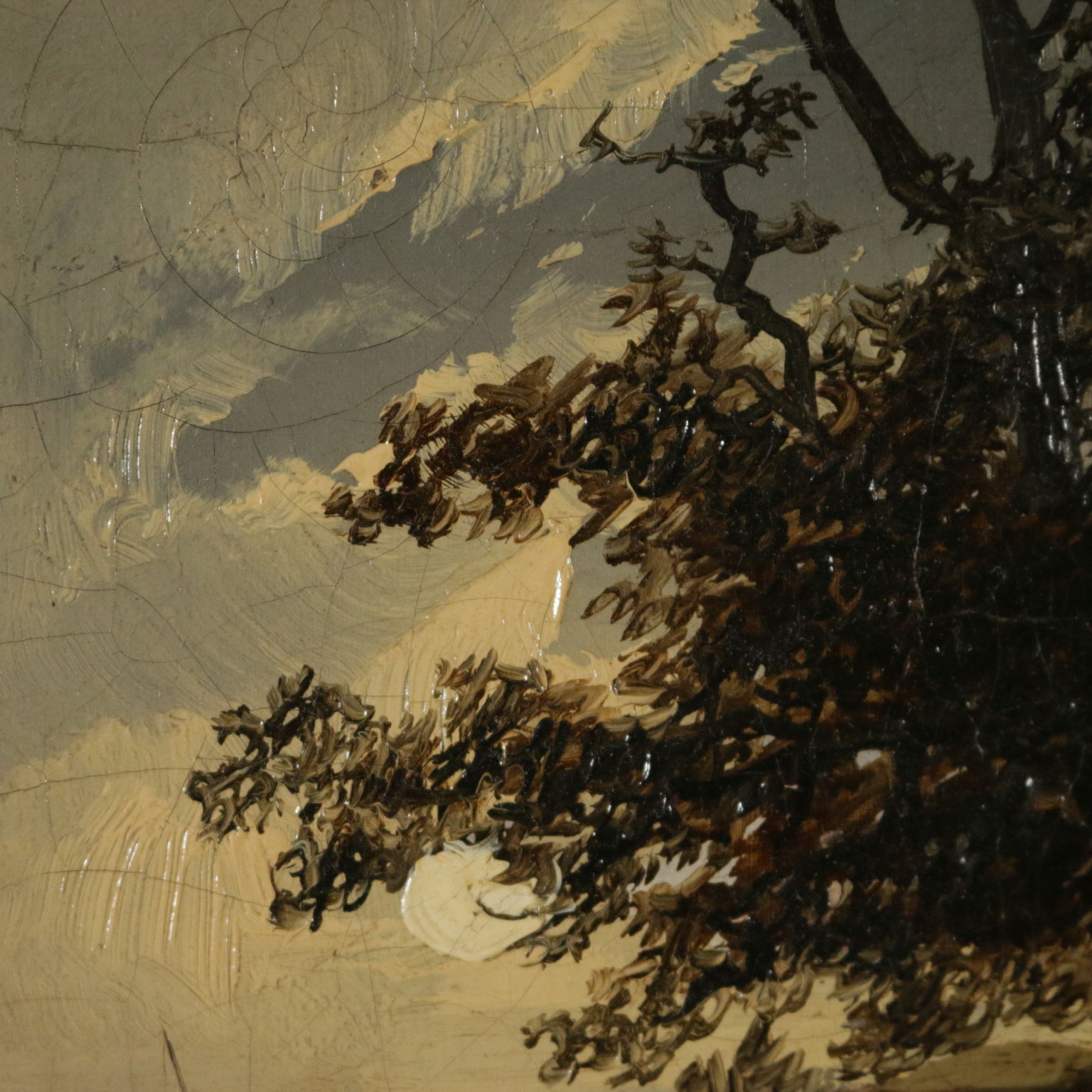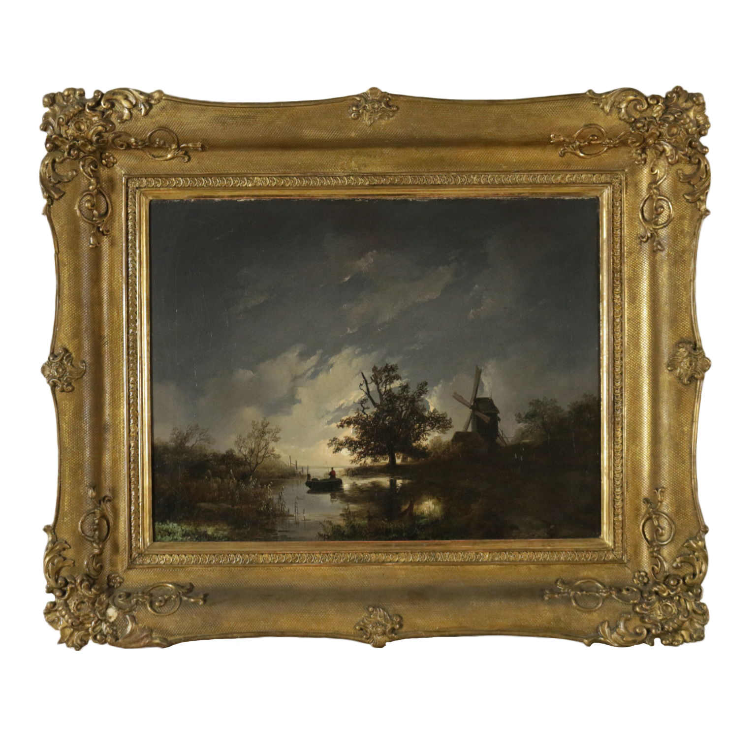 Olio su tela. Suggestivo paesaggio notturno, con le prime pallide luci dell'alba che illuminano una barchetta in transito sul rivo, poco lontano da un mulino a vento. Restaurato e ritelato, è presentato in cornice coeva ridorata.