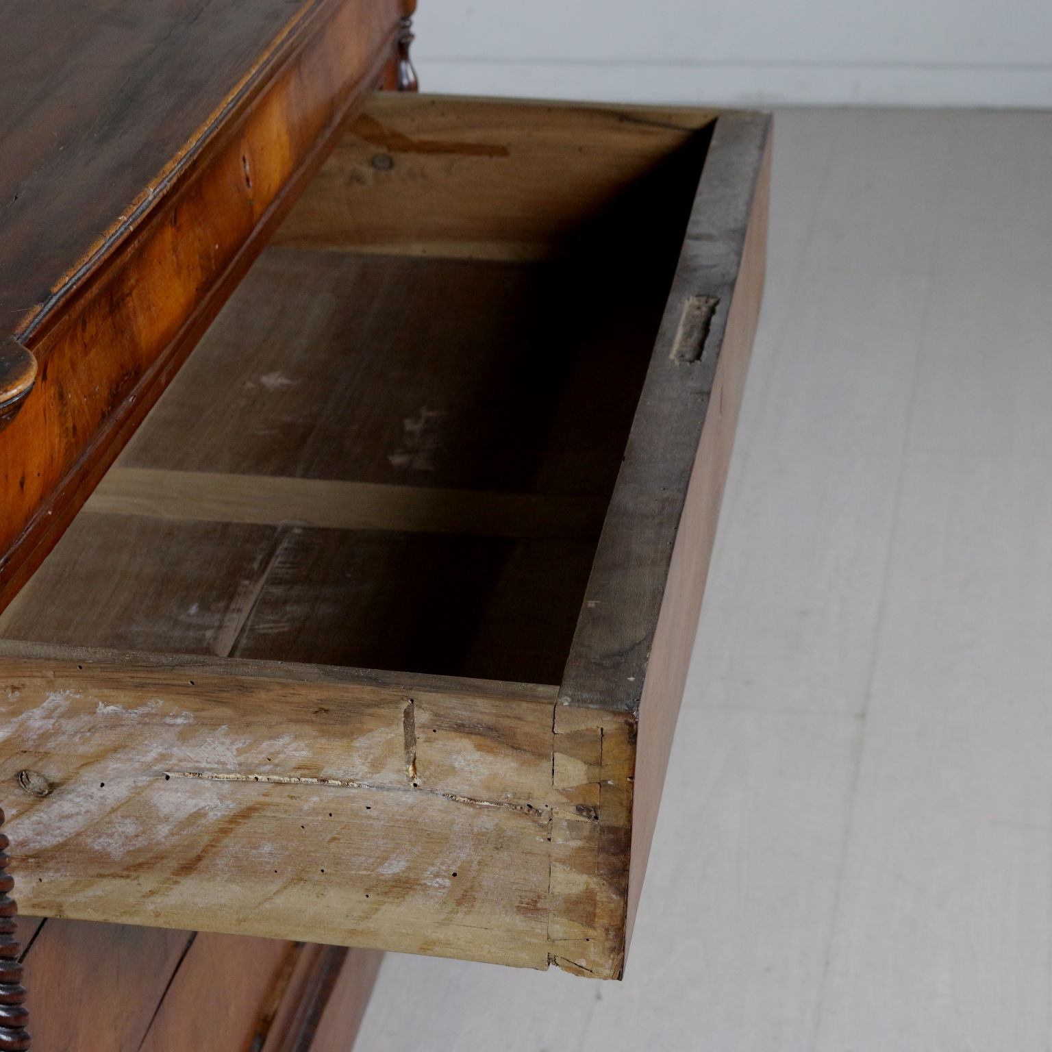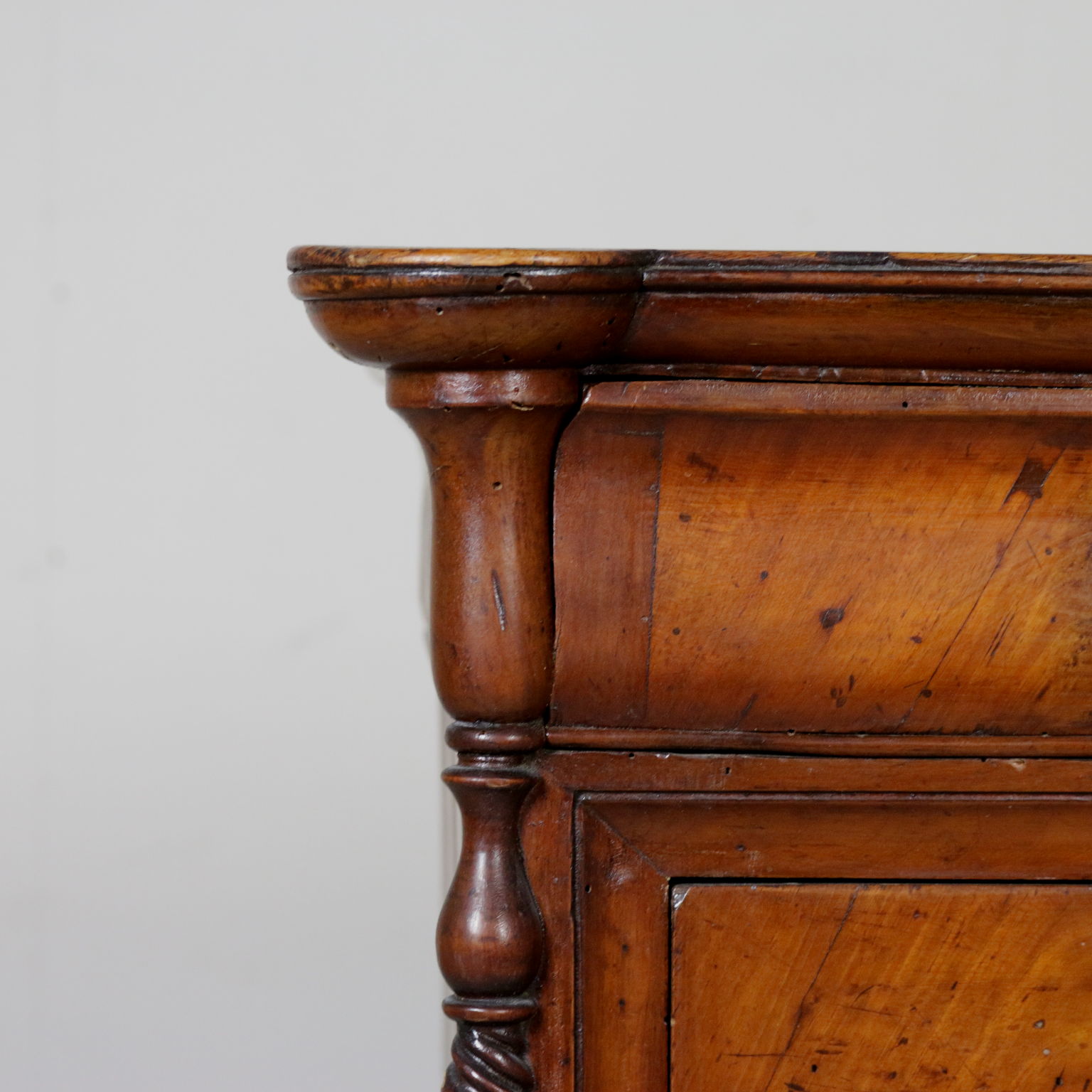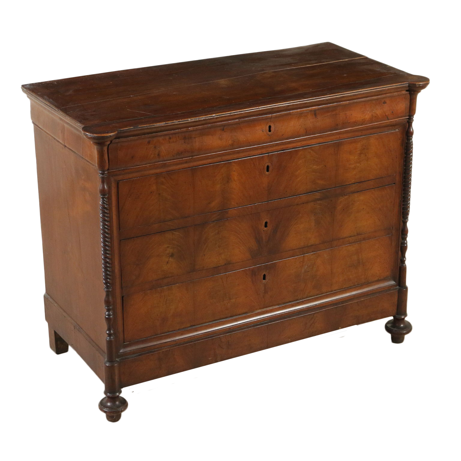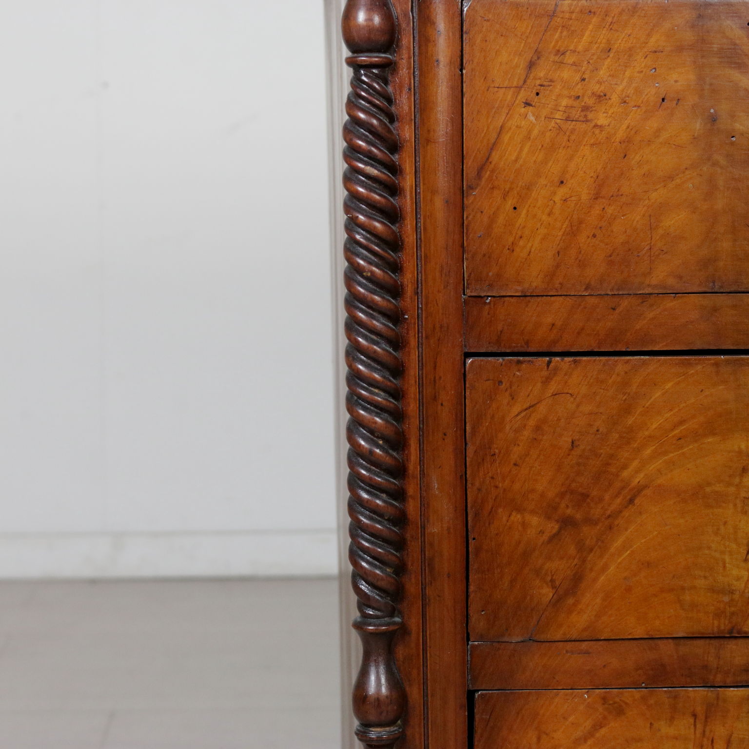 Comò a tre cassetti più uno sottopiano nella fascia a gole di tulipano. Montanti con colonne tornite e a torciglione applicate. Fronte lastronato in piuma.