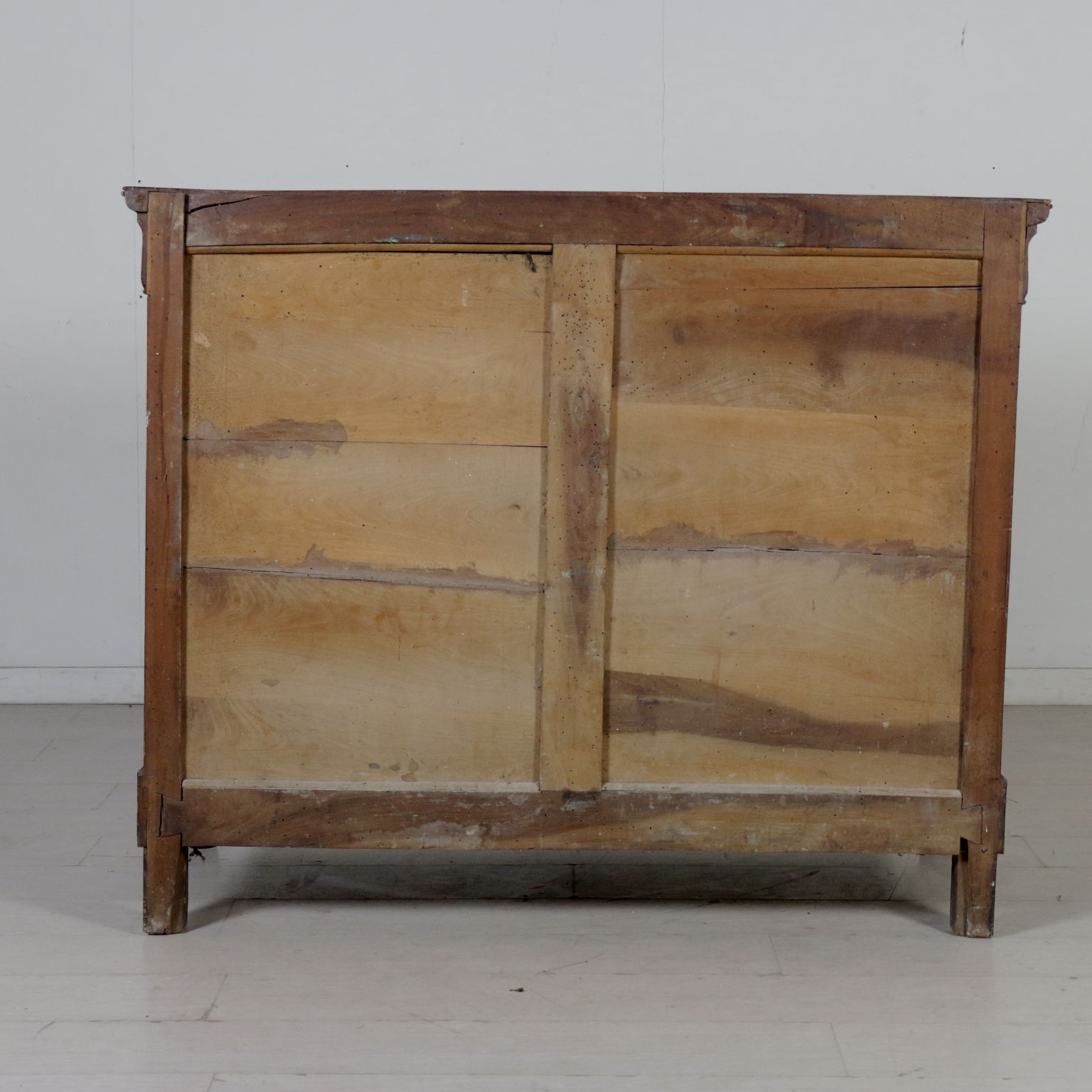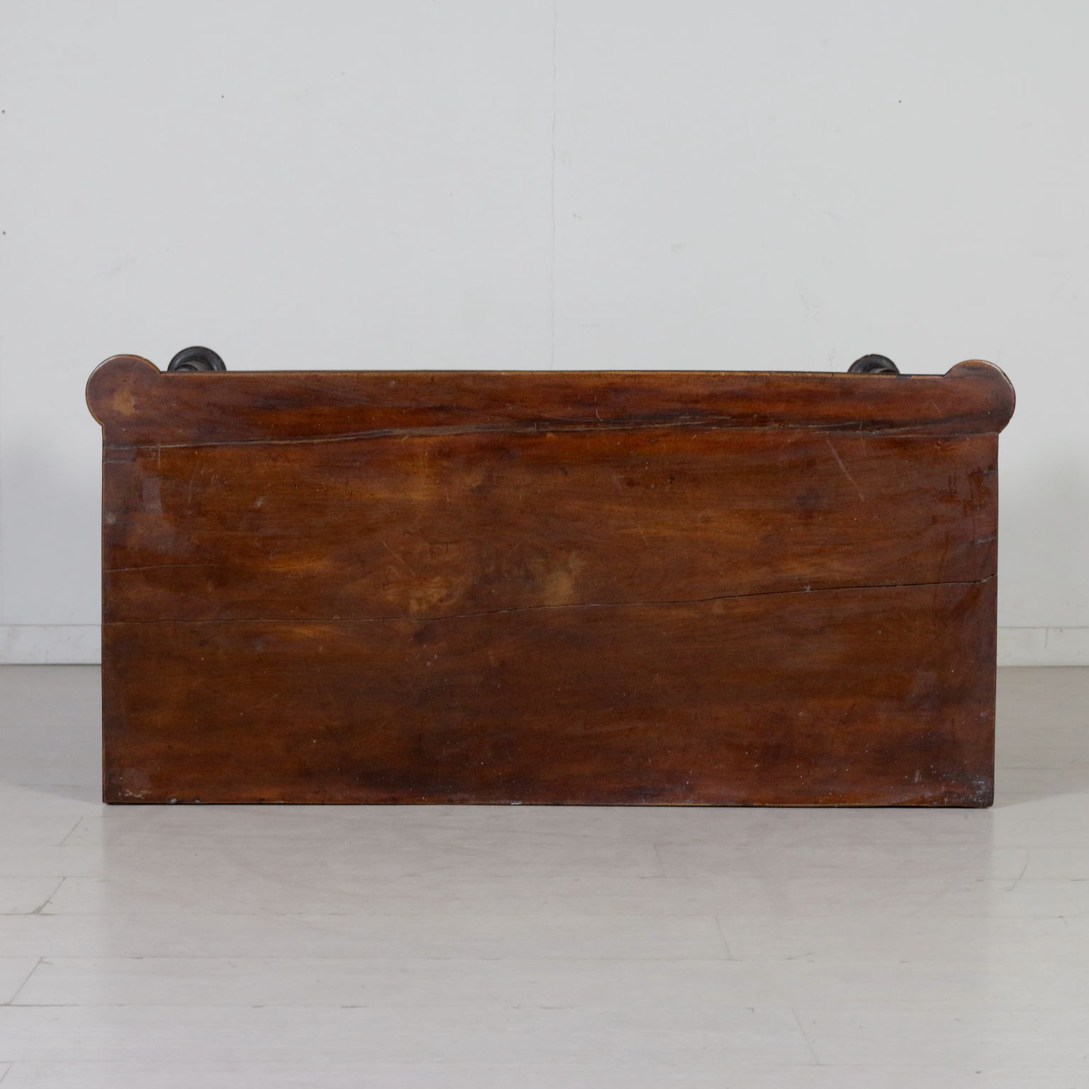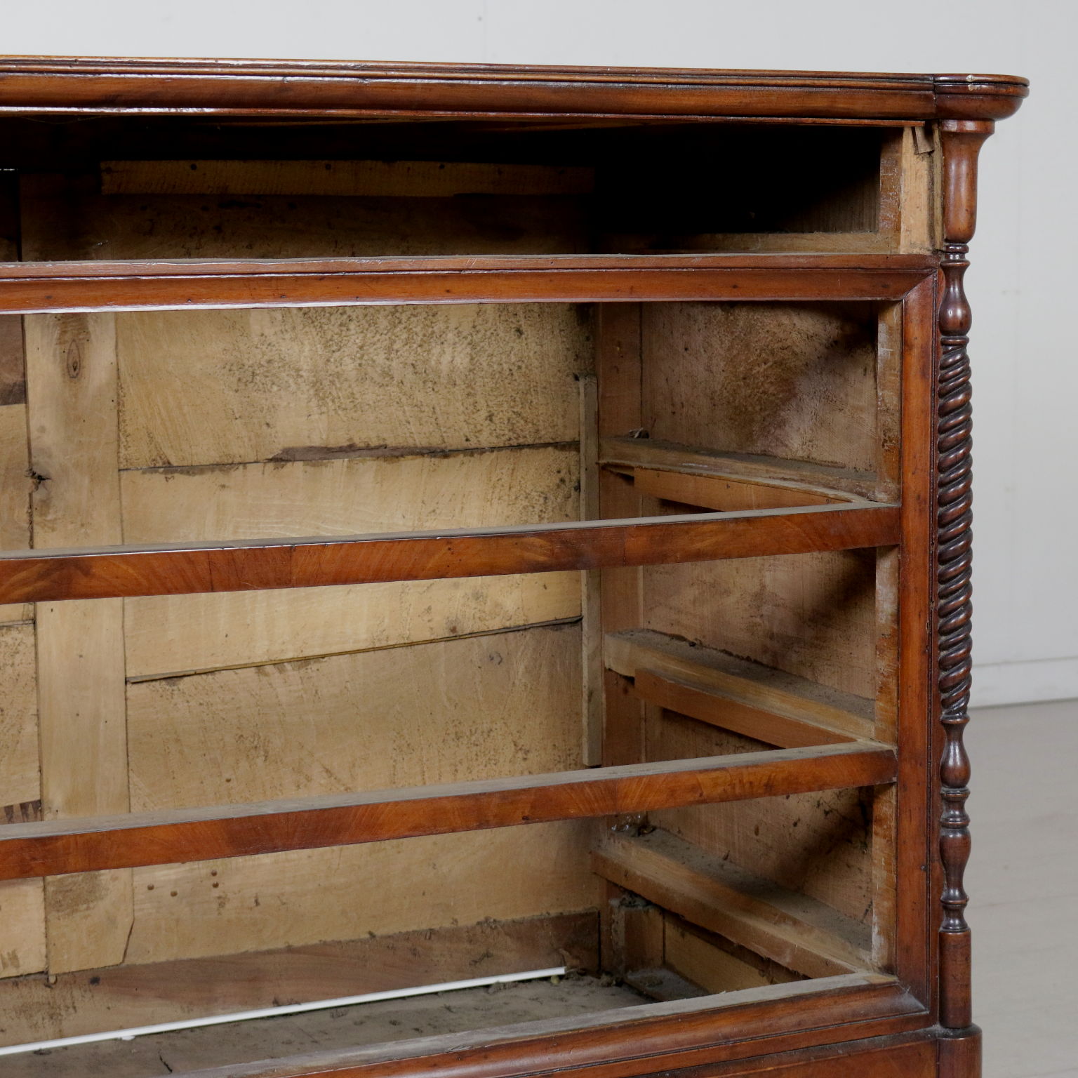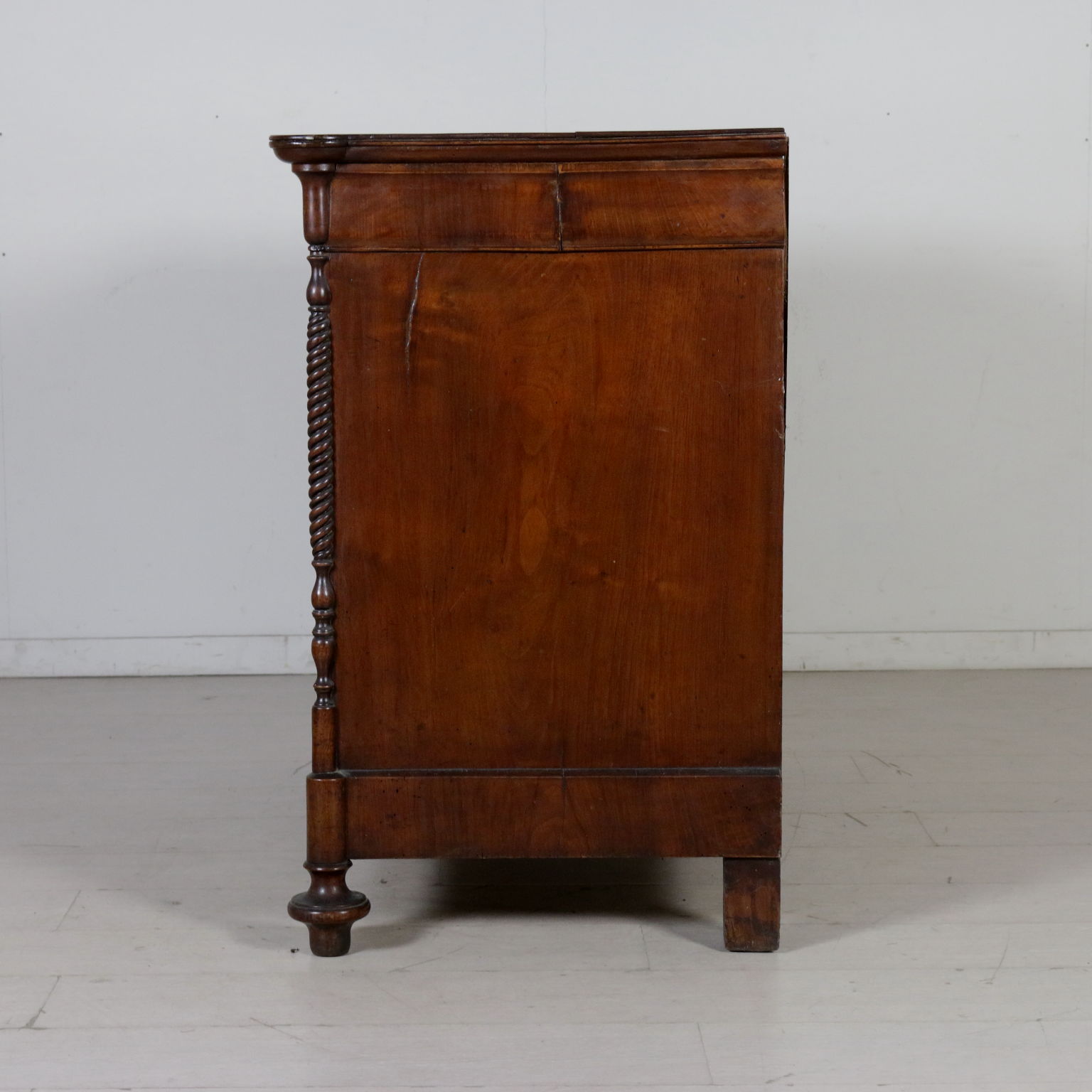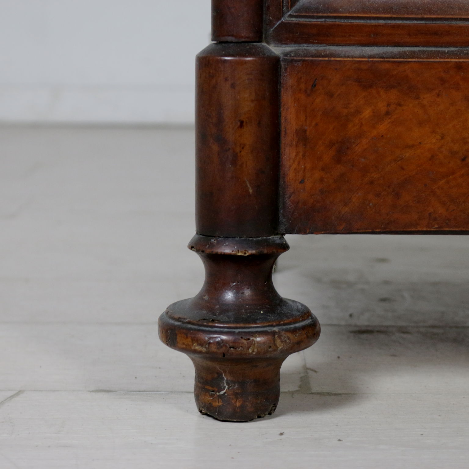 Comò a tre cassetti più uno sottopiano nella fascia a gole di tulipano. Montanti con colonne tornite e a torciglione applicate. Fronte lastronato in piuma.