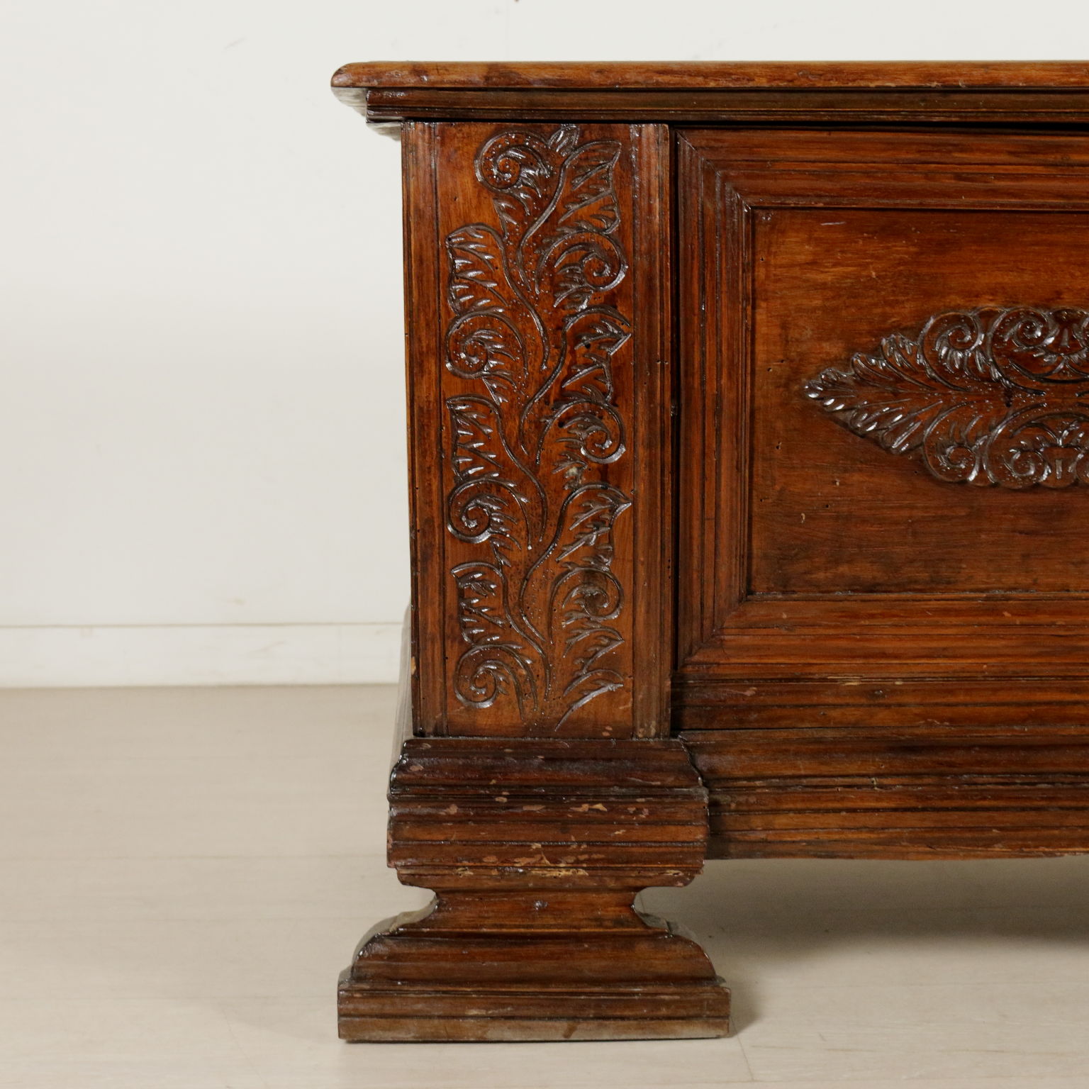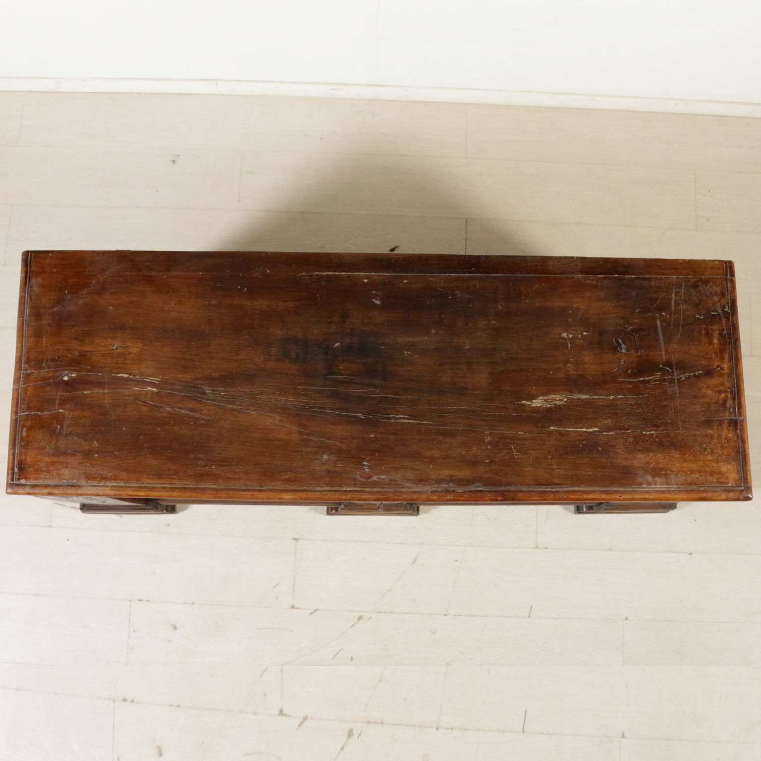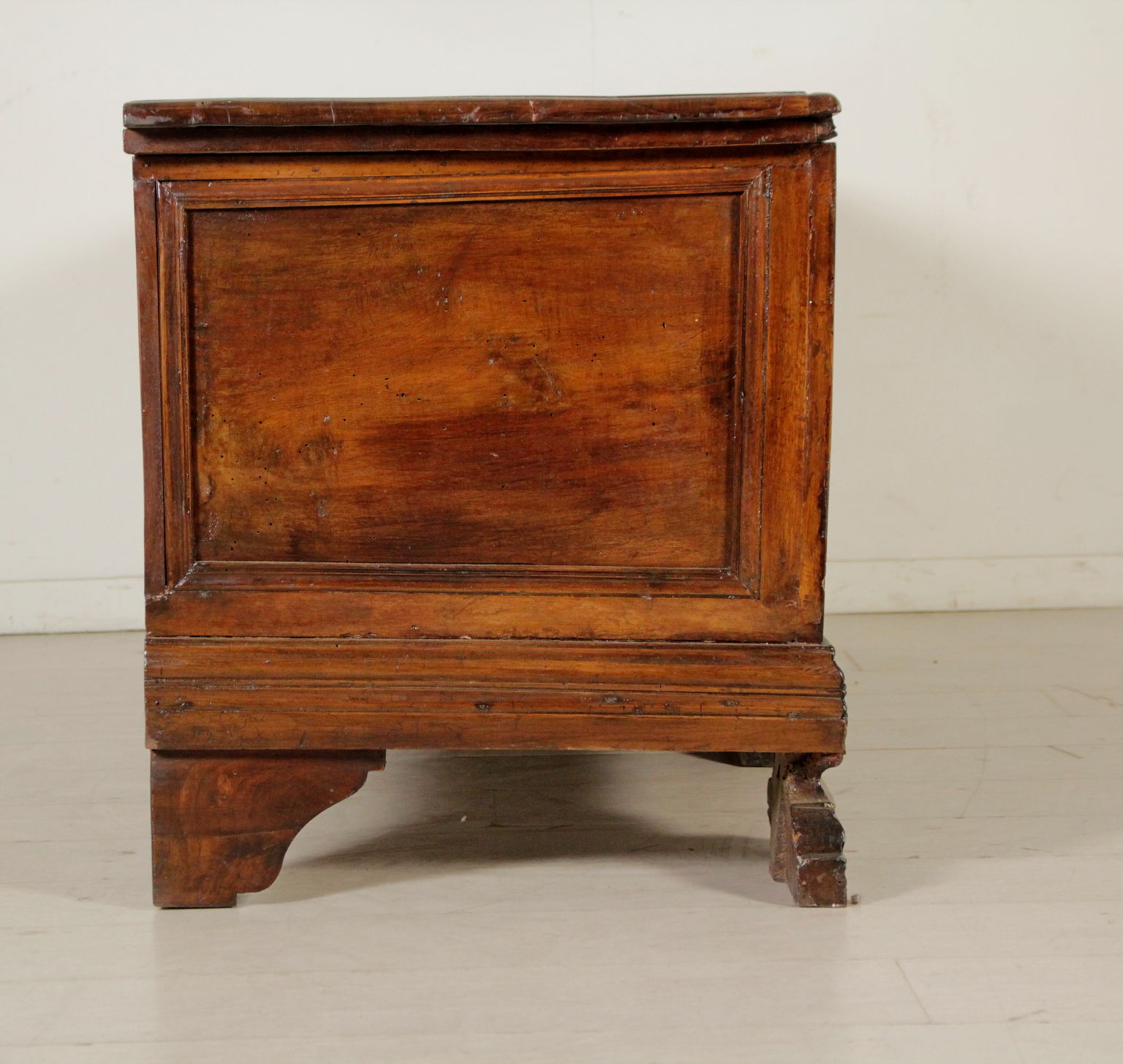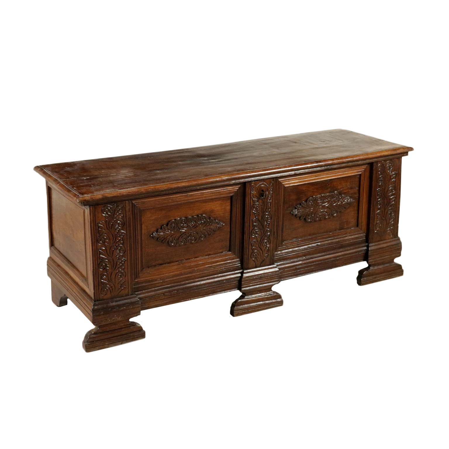 Retta da piedi a doppia mensola, presenta montanti e formelle intagliate. Piano apribile.
