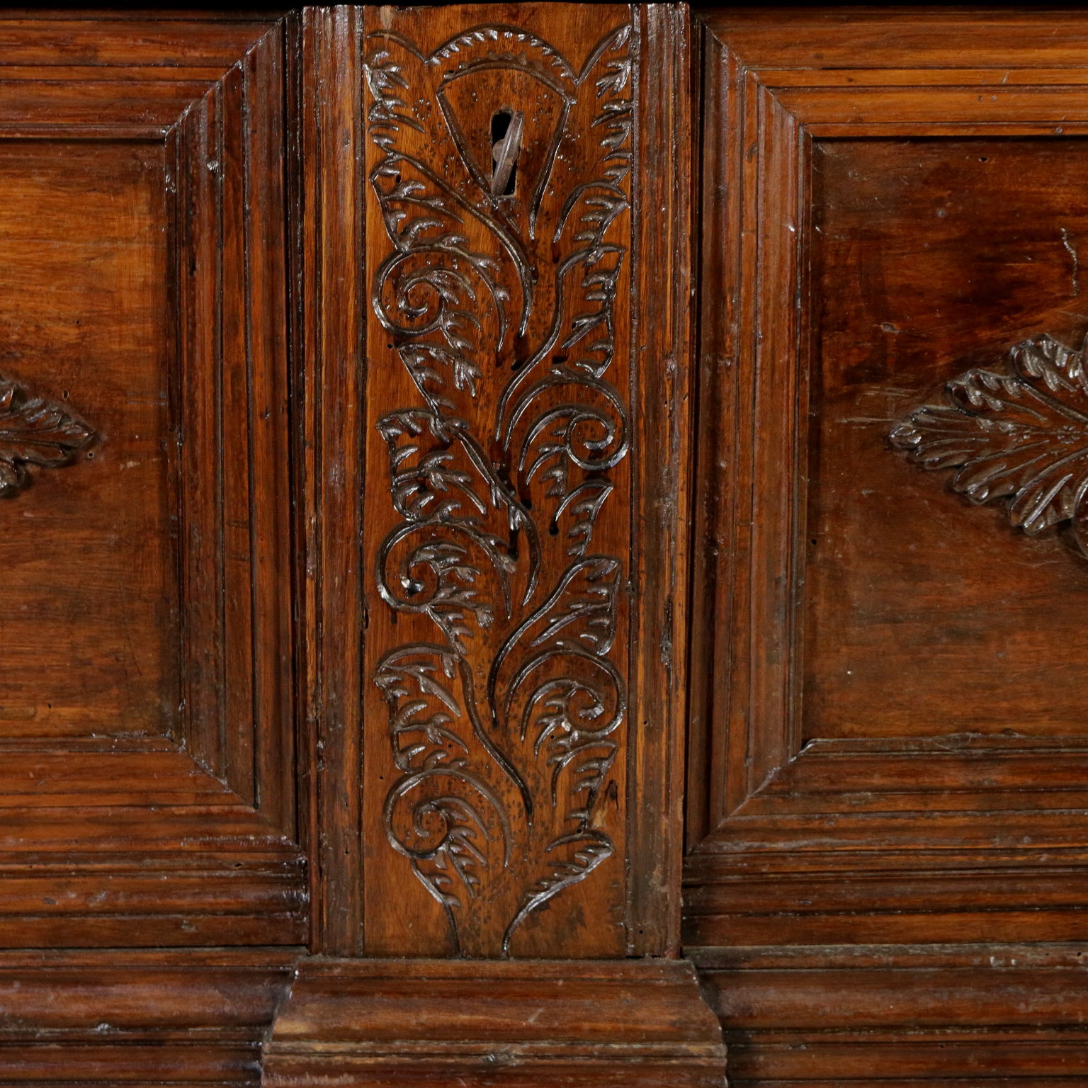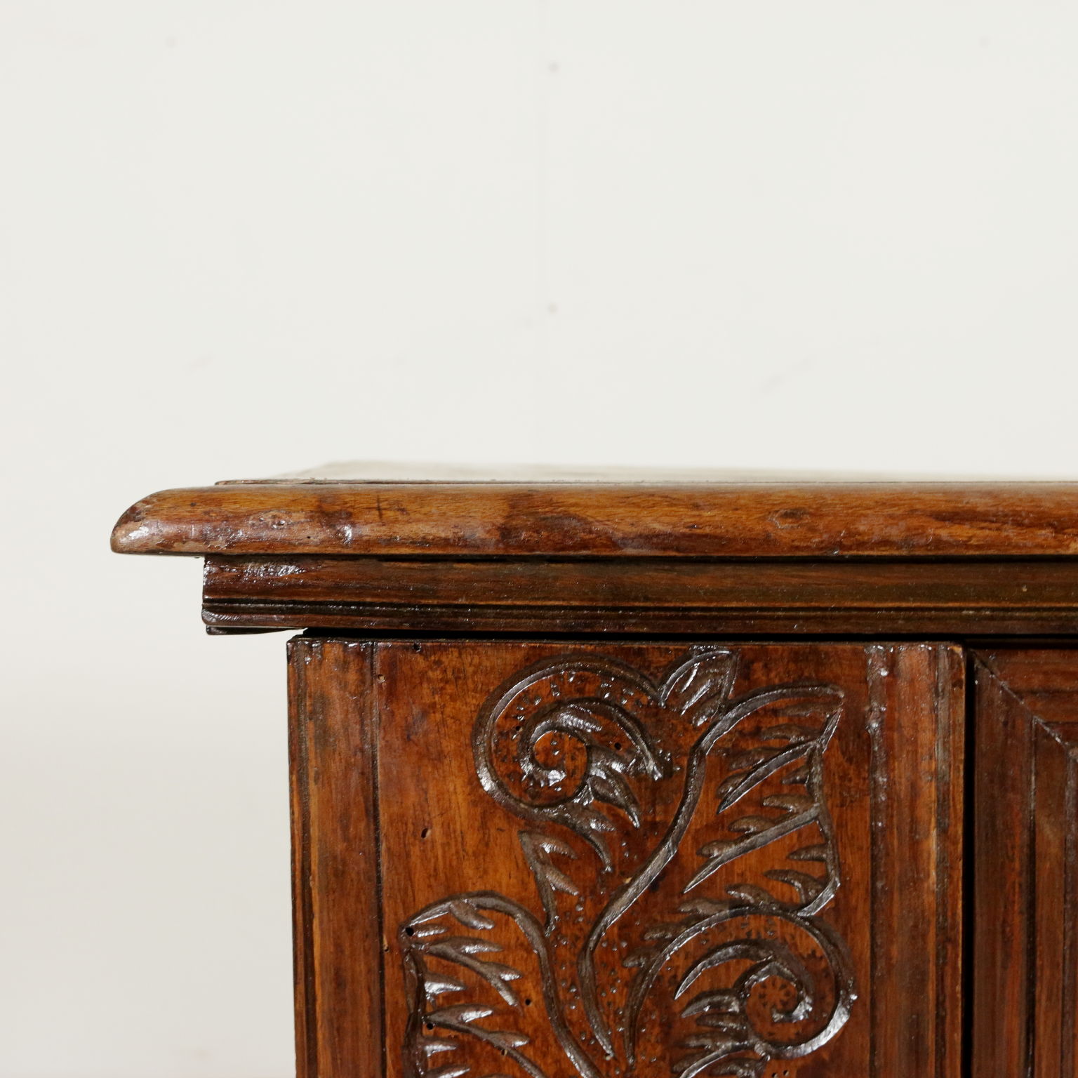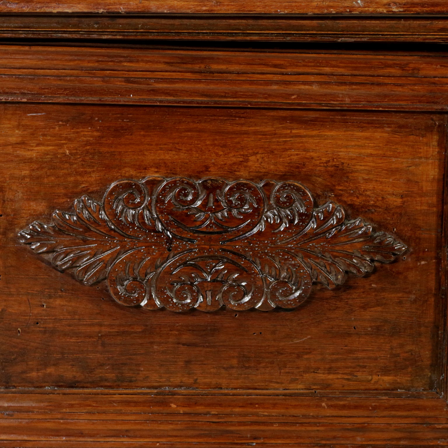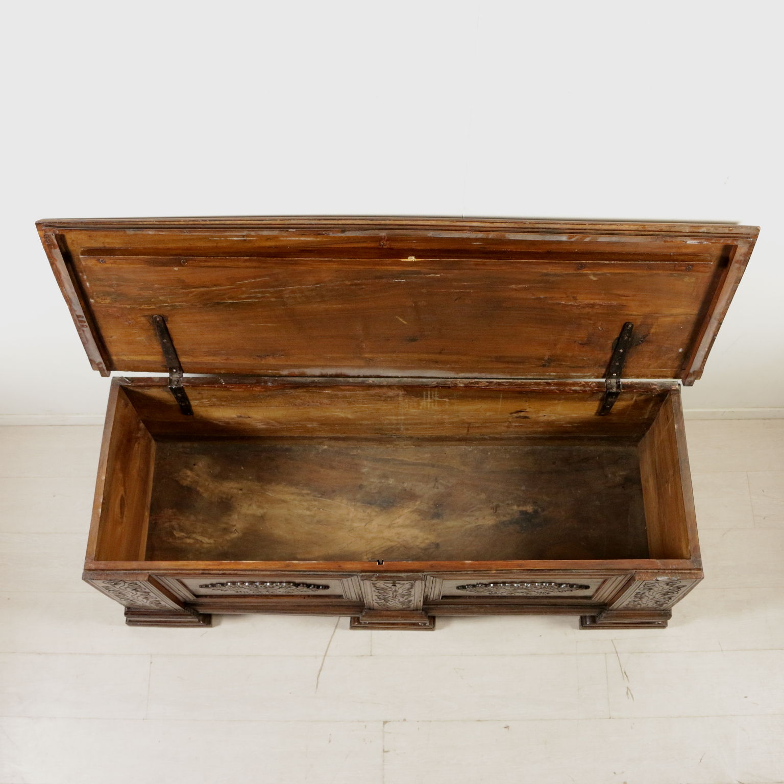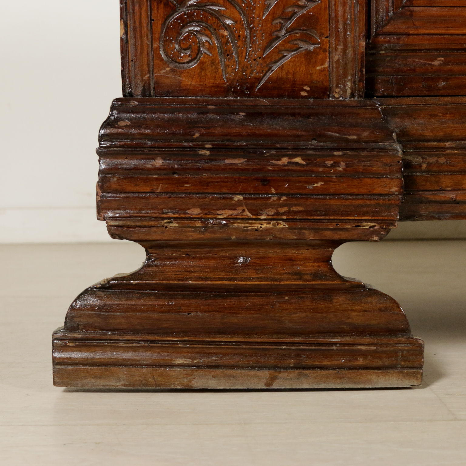 Retta da piedi a doppia mensola, presenta montanti e formelle intagliate. Piano apribile.