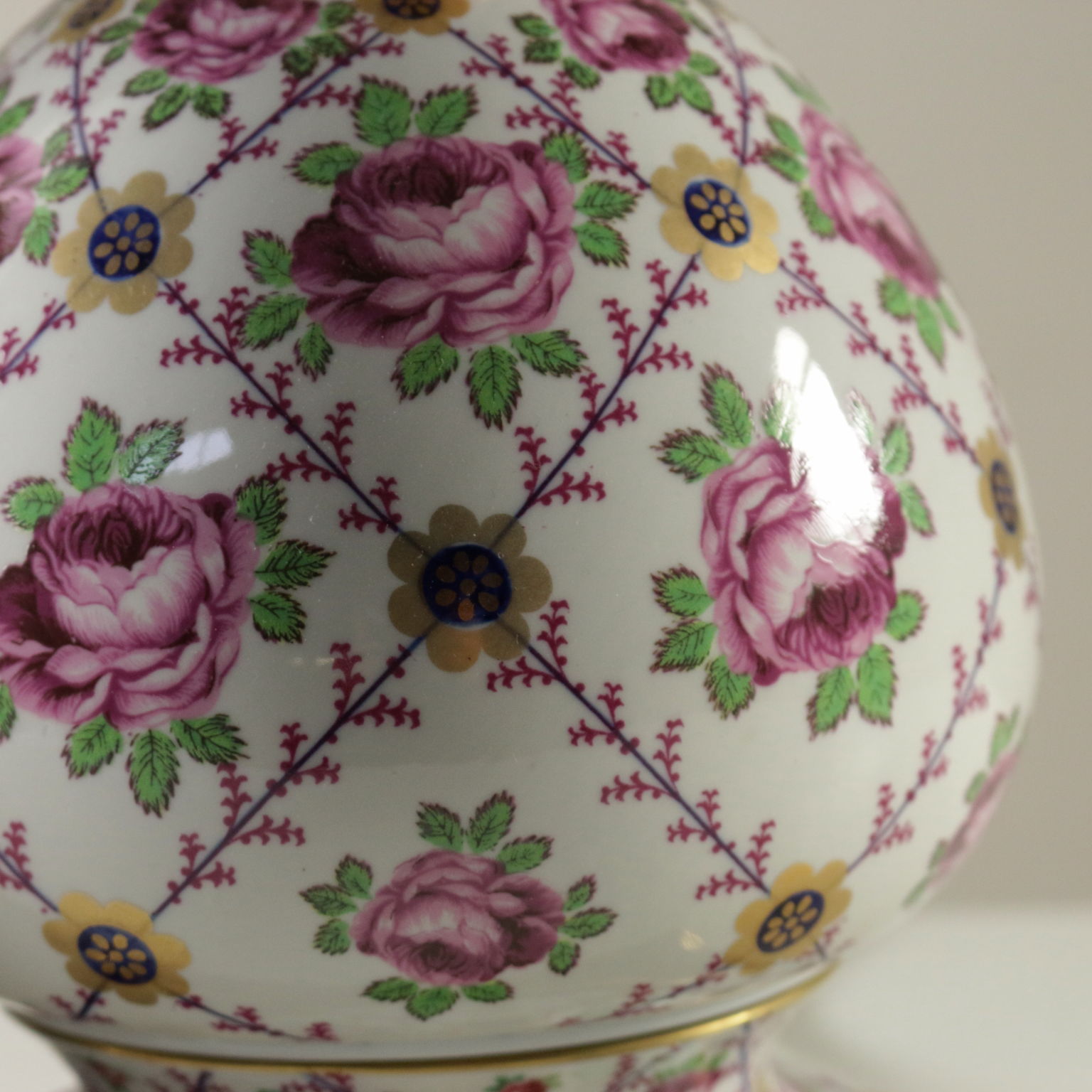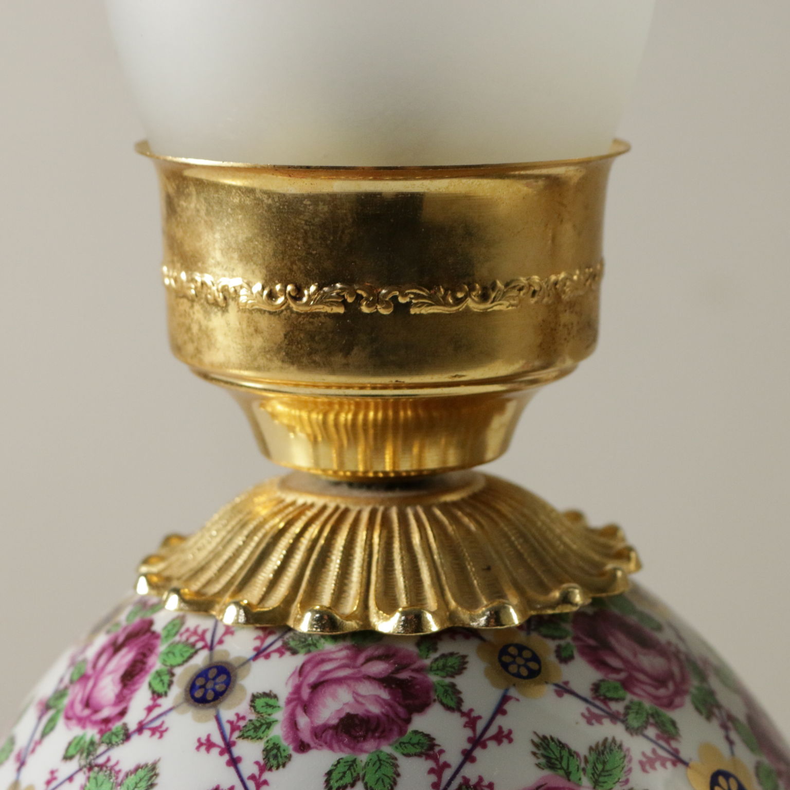 Coppia di lampade in porcellana e ottone dorato. Decoro a motivo vegetale e diffusore in vetro satinato. Marchio della manifattura sotto la base.