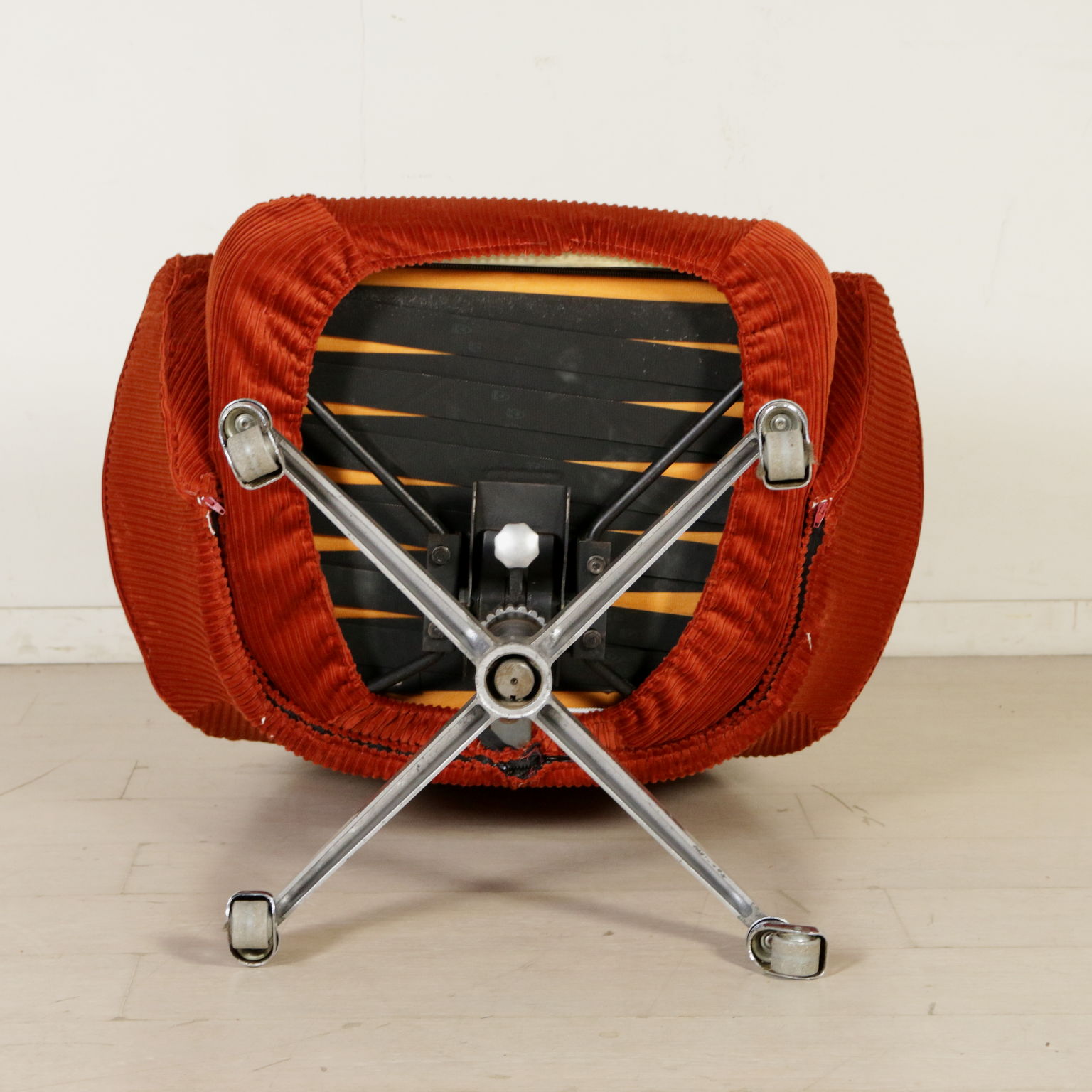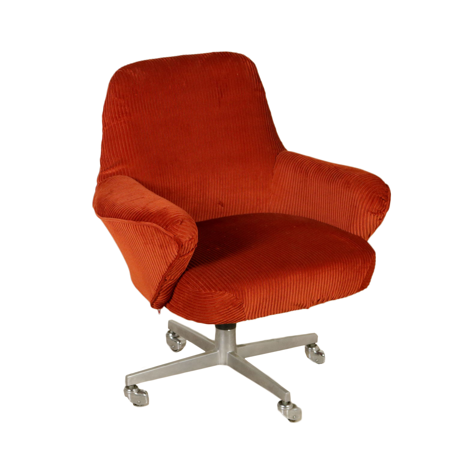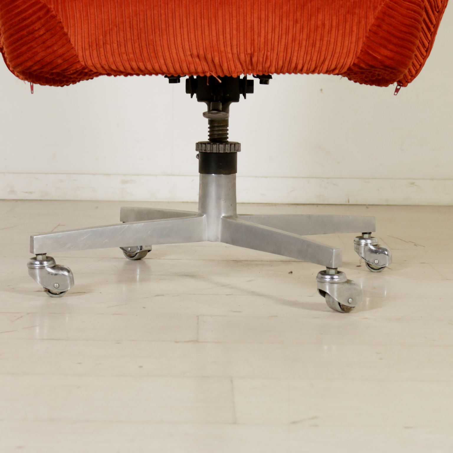 Poltrona girevole ad altezza e inclinazione regolabile; base in alluminio, imbottitura in espanso, rivestimento in velluto.