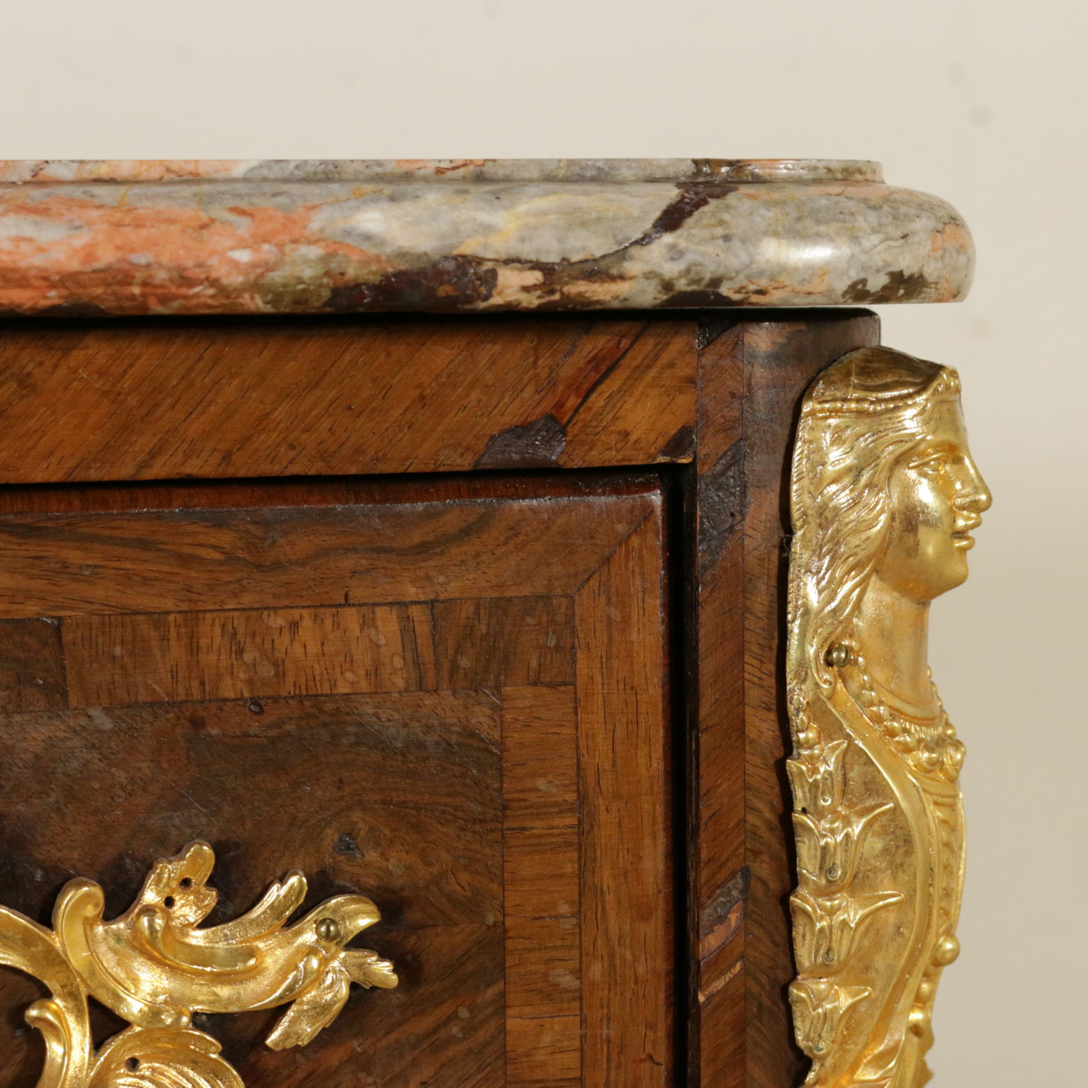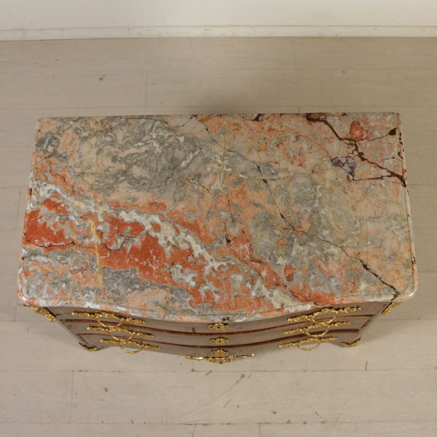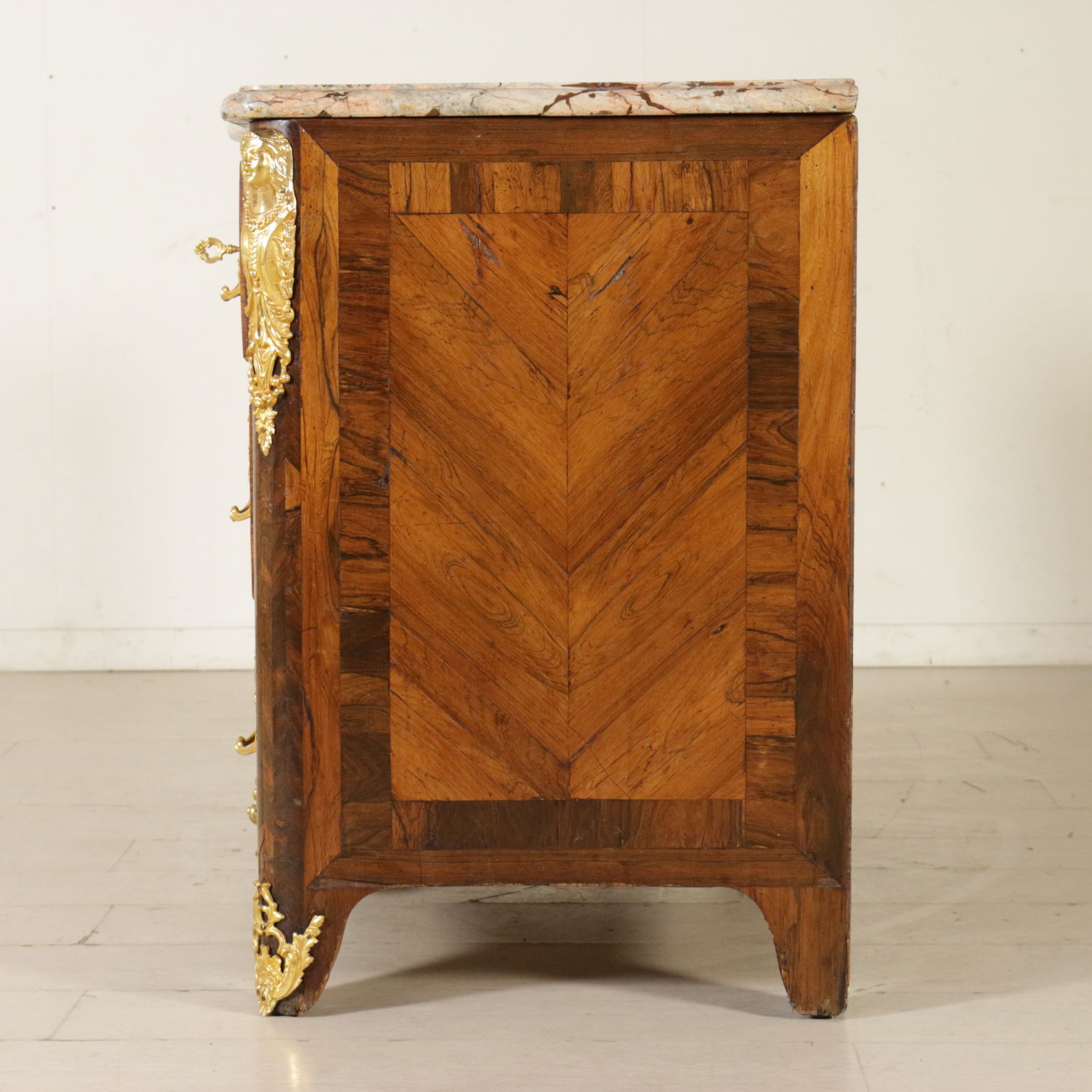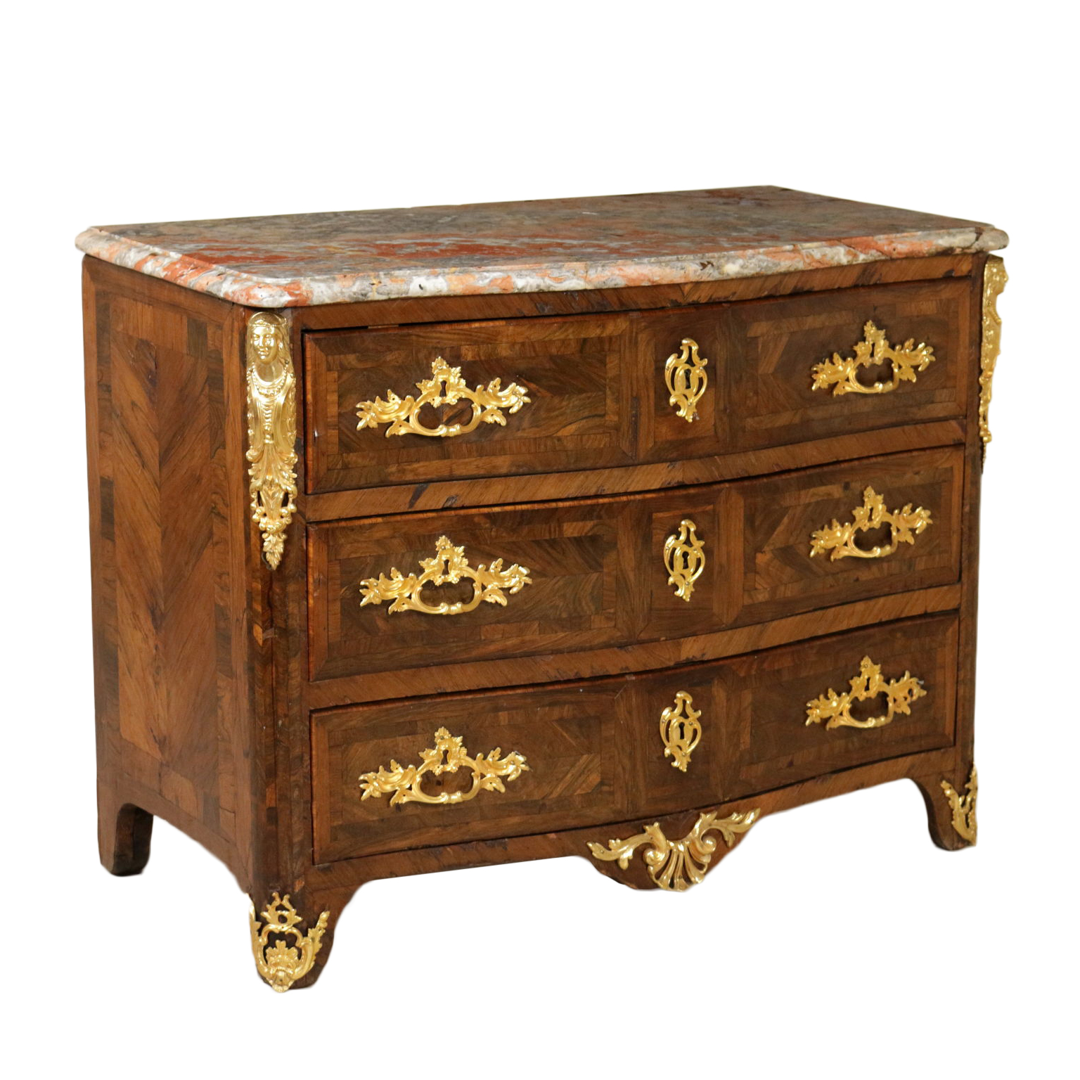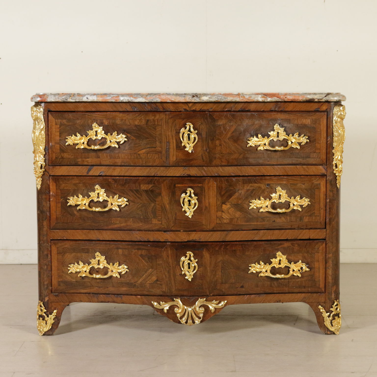 Elegante comò Reggenza mosso sul fronte. Presenta tre cassetti e ampio grembiale. Riserve e bordure in palissandro bi e quadripartito. Arricchito da fregi e manigliera in bronzo dorato in parte sostituita. Piano in marmo sagomato.