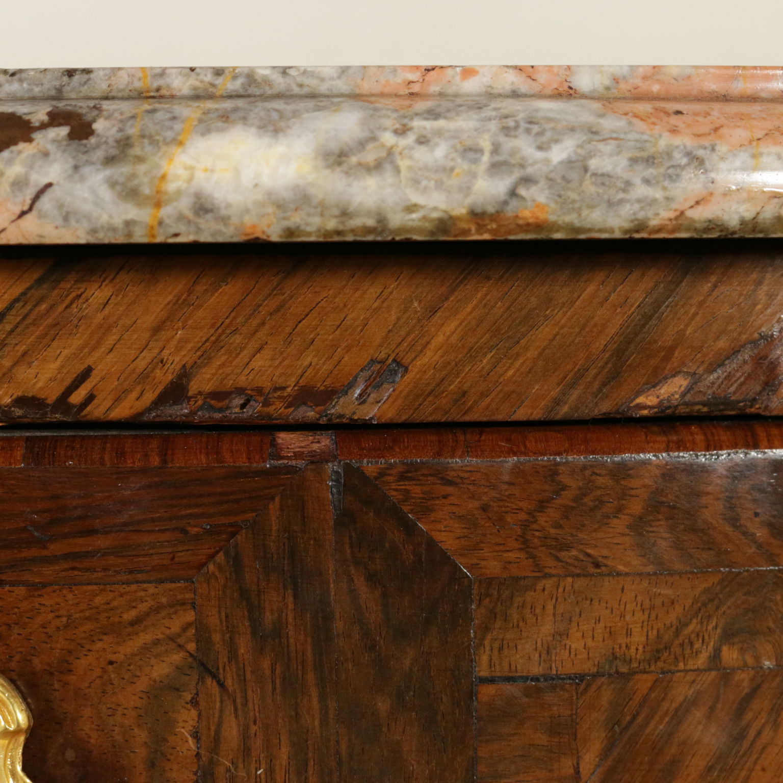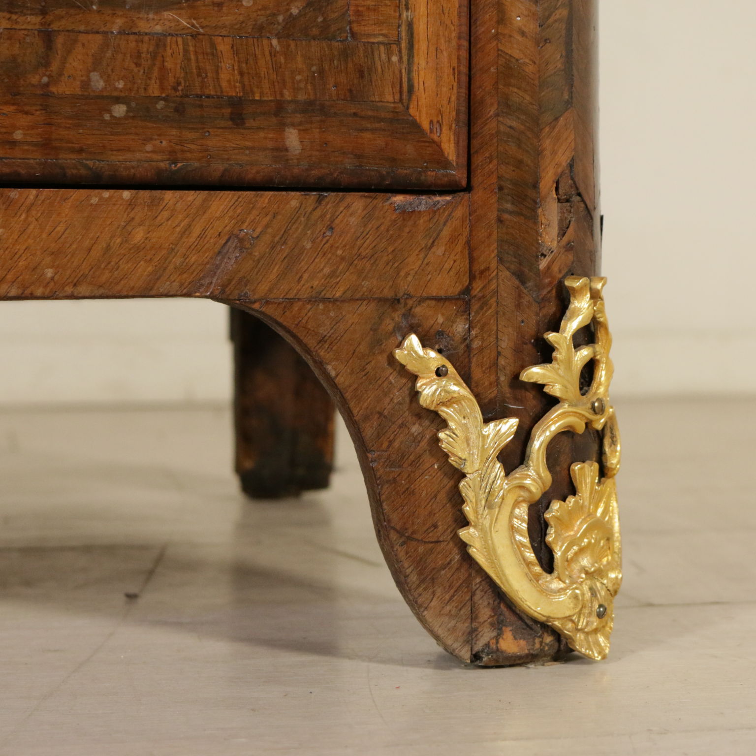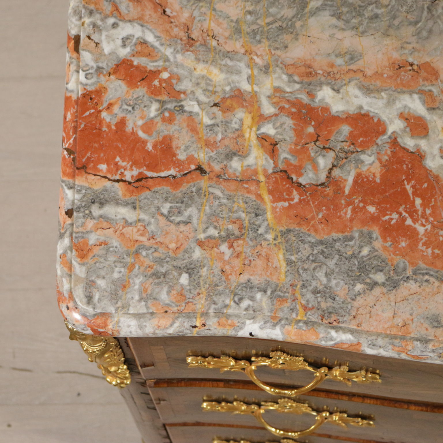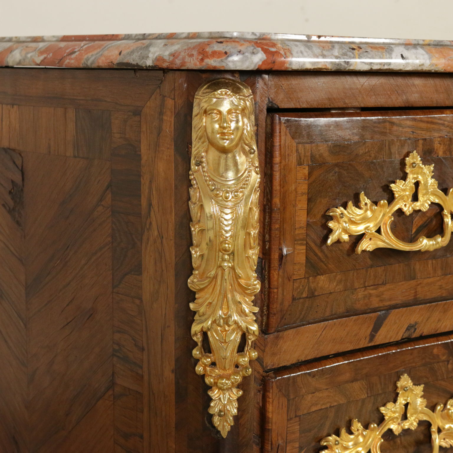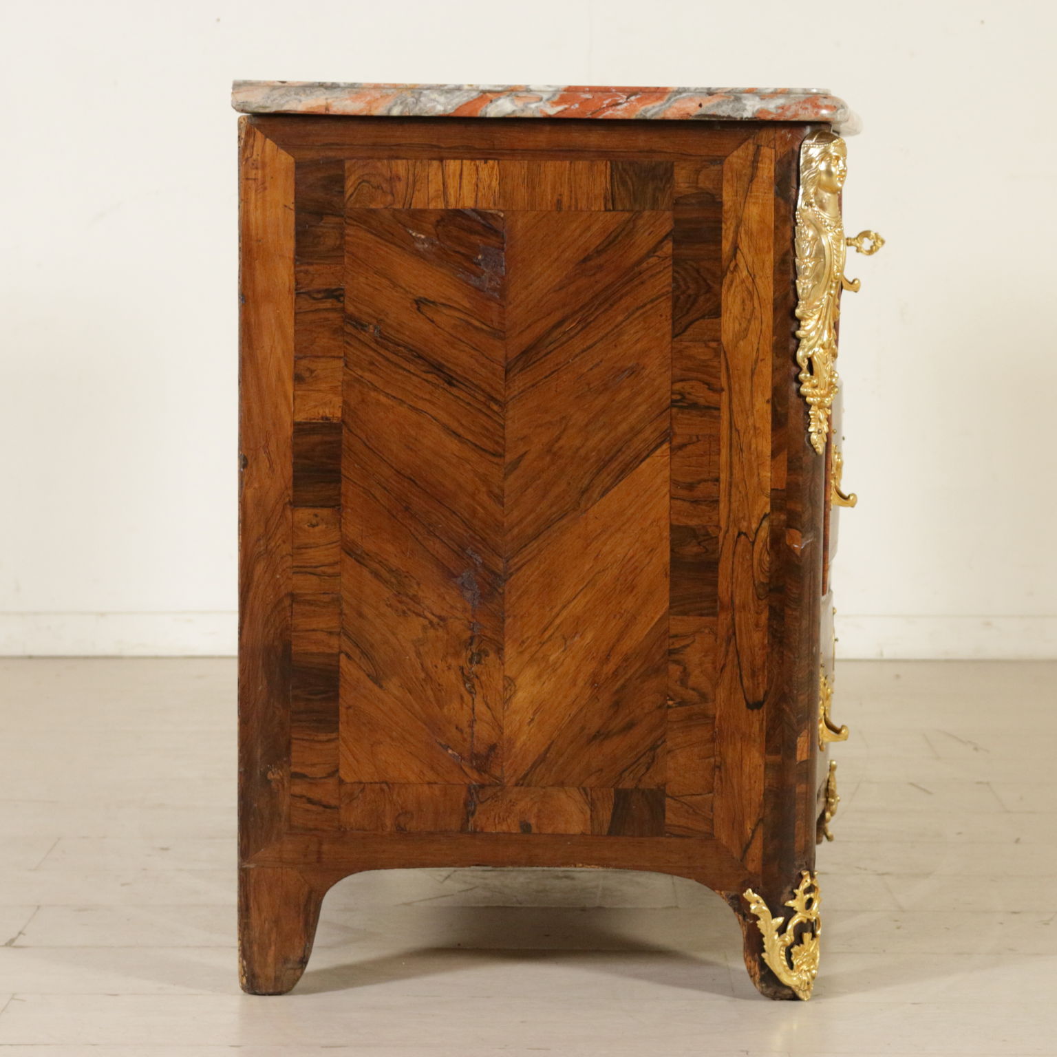 Elegante comò Reggenza mosso sul fronte. Presenta tre cassetti e ampio grembiale. Riserve e bordure in palissandro bi e quadripartito. Arricchito da fregi e manigliera in bronzo dorato in parte sostituita. Piano in marmo sagomato.