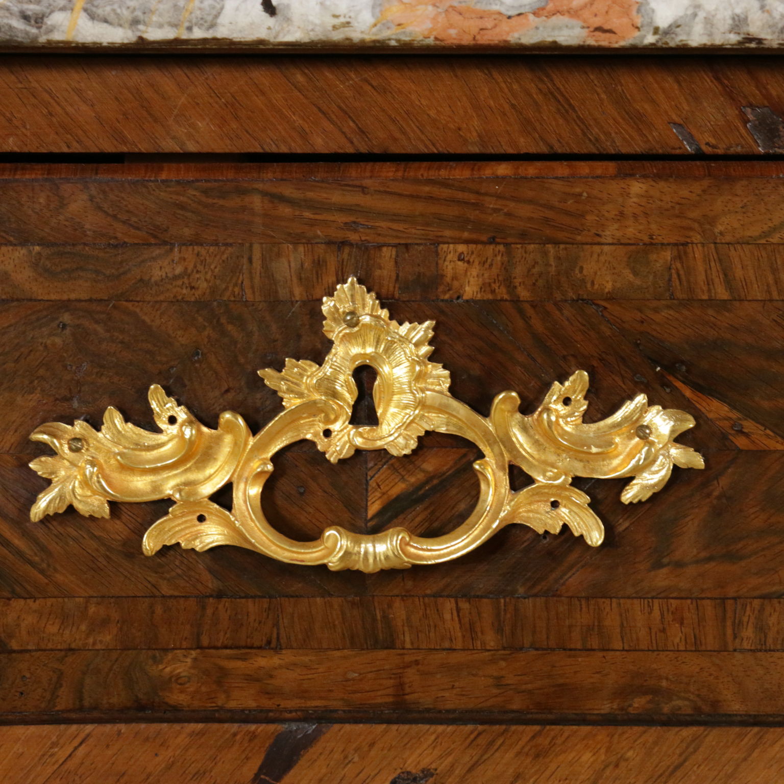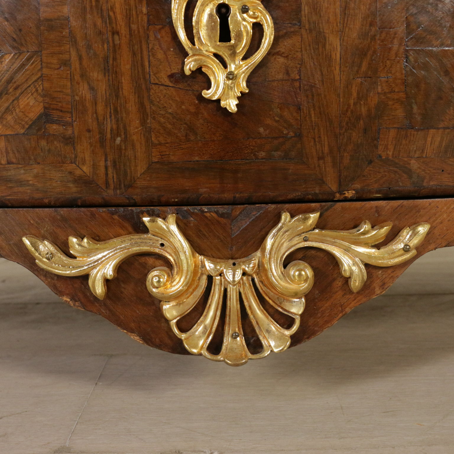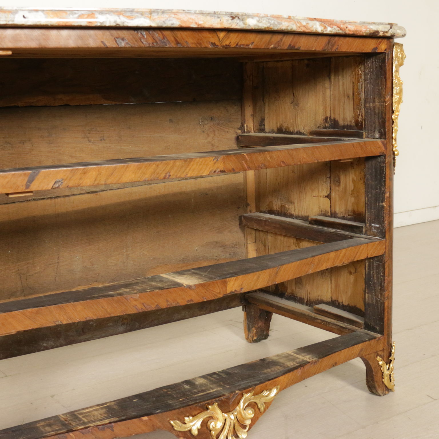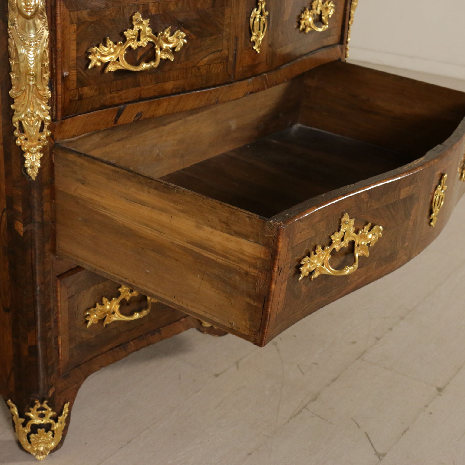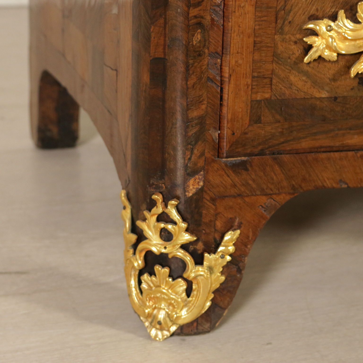 Elegante comò Reggenza mosso sul fronte. Presenta tre cassetti e ampio grembiale. Riserve e bordure in palissandro bi e quadripartito. Arricchito da fregi e manigliera in bronzo dorato in parte sostituita. Piano in marmo sagomato.