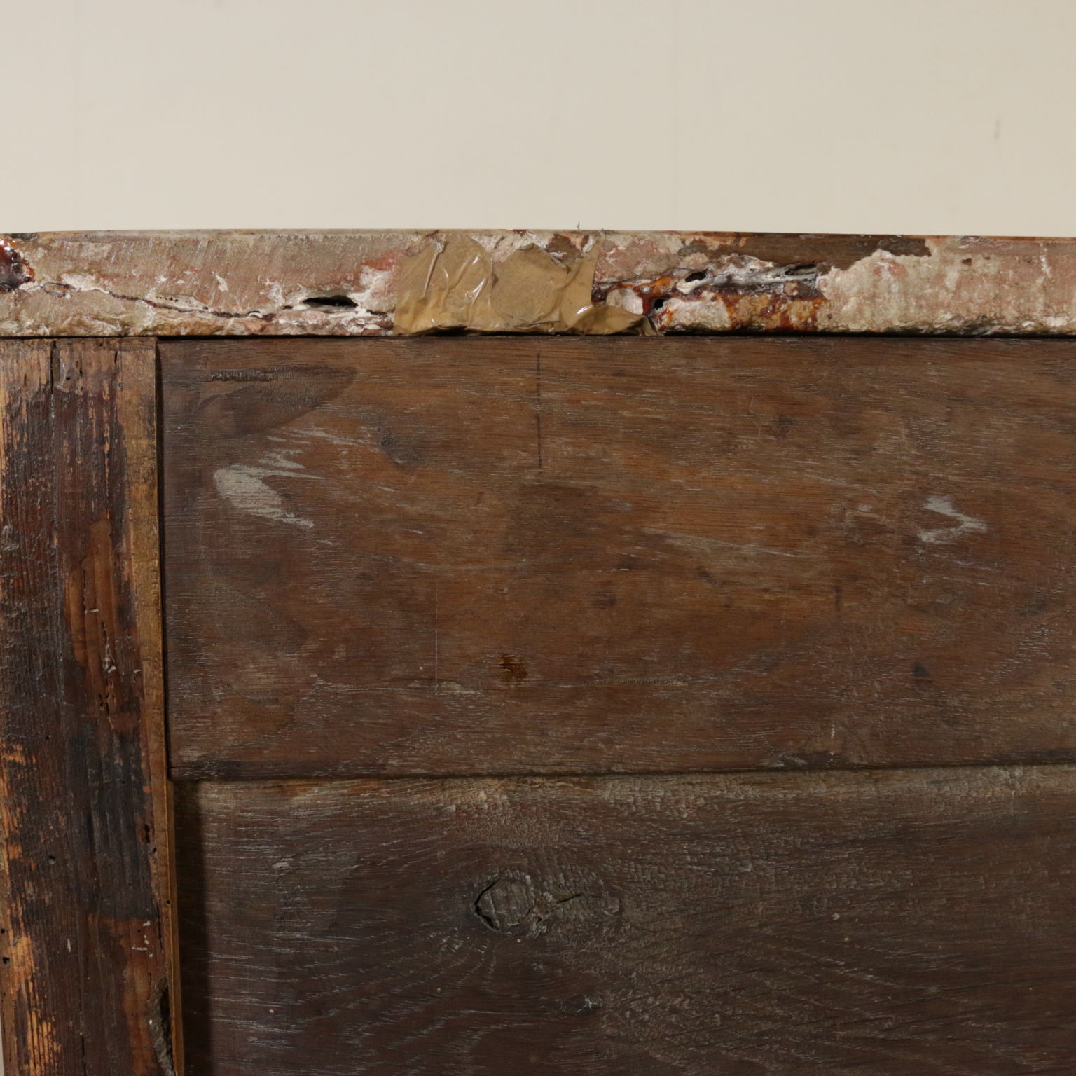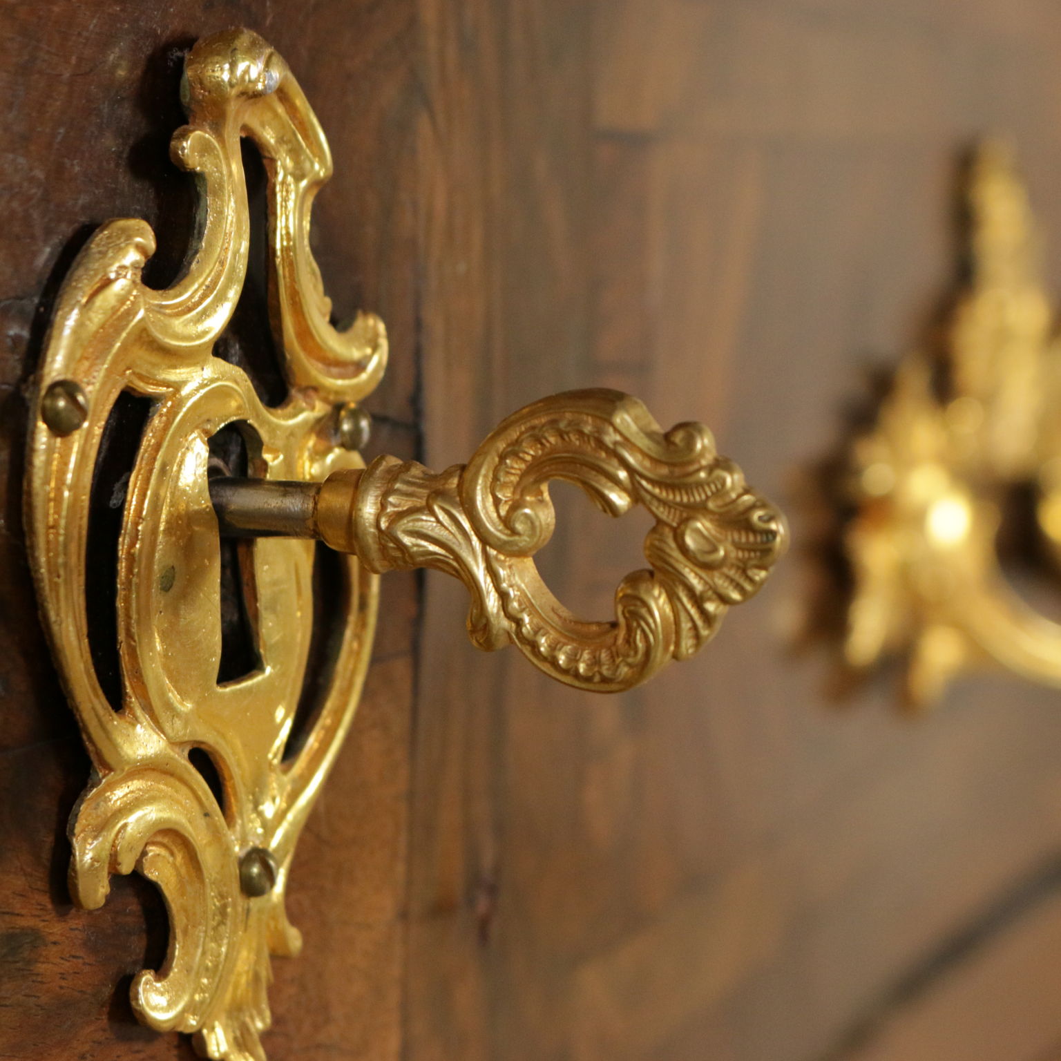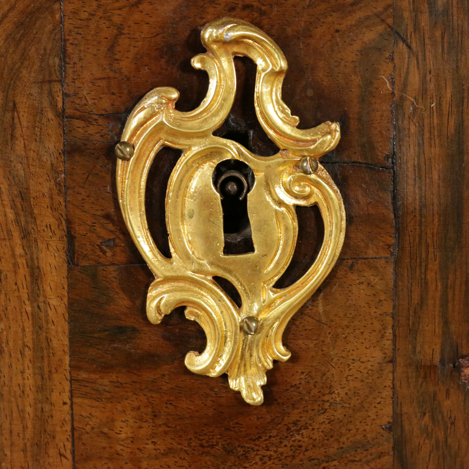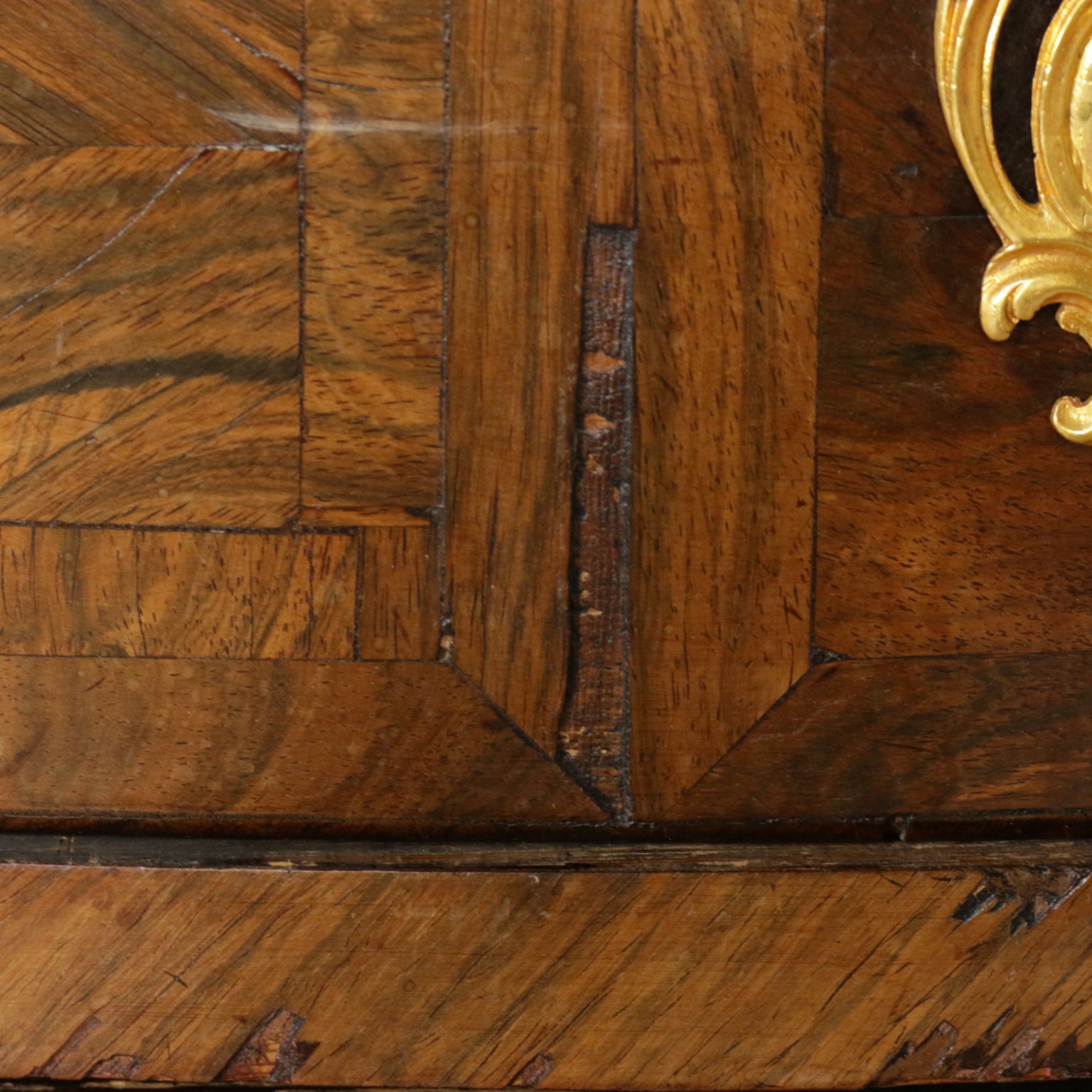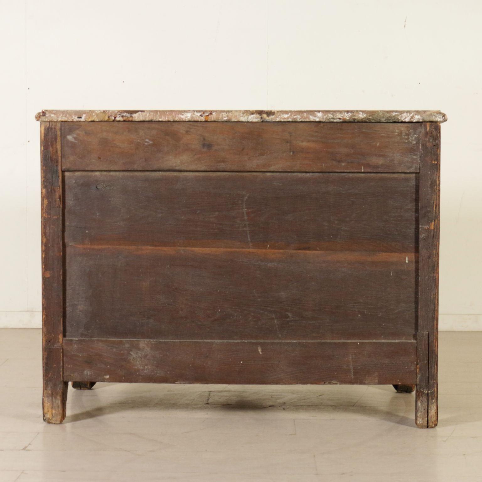 Elegante comò Reggenza mosso sul fronte. Presenta tre cassetti e ampio grembiale. Riserve e bordure in palissandro bi e quadripartito. Arricchito da fregi e manigliera in bronzo dorato in parte sostituita. Piano in marmo sagomato.