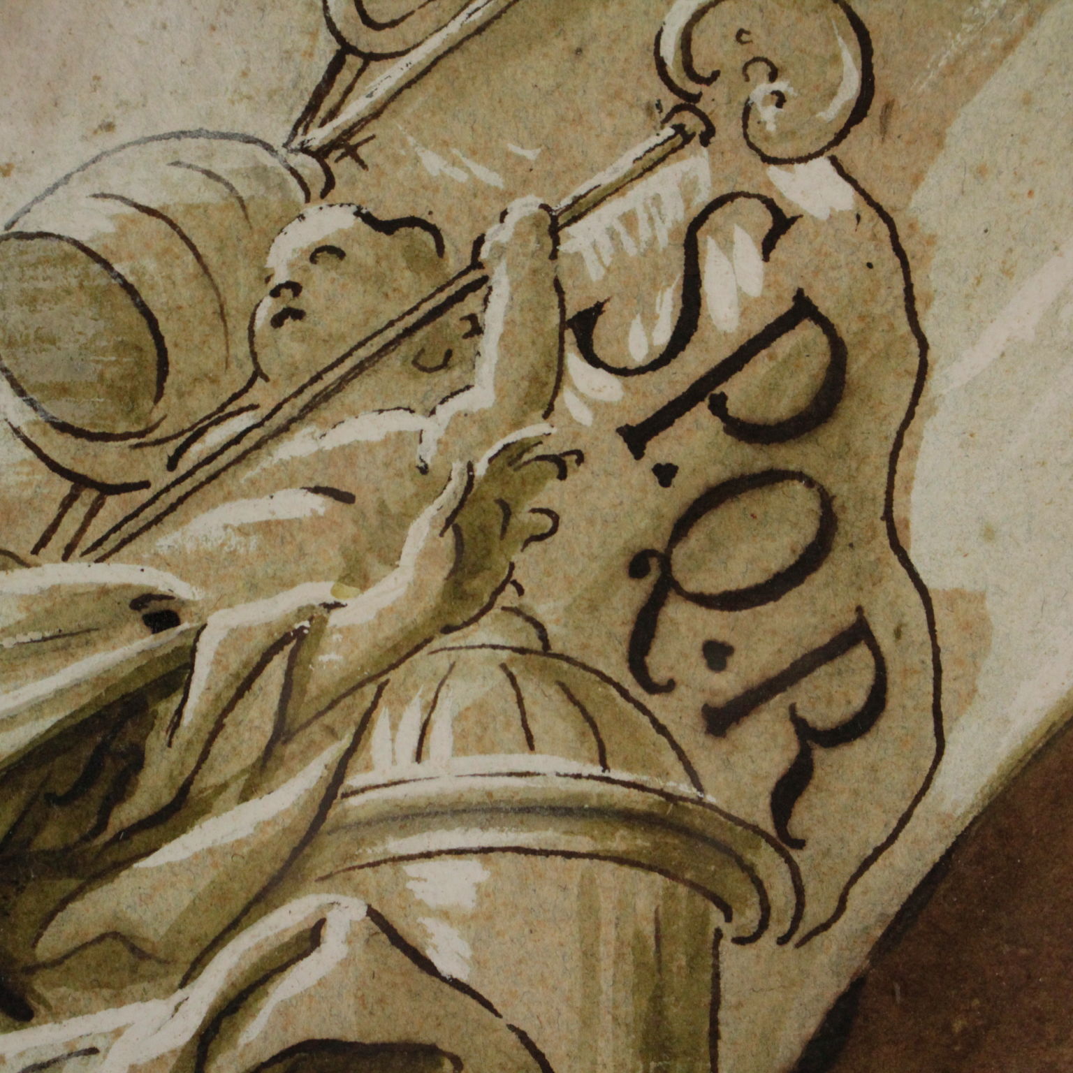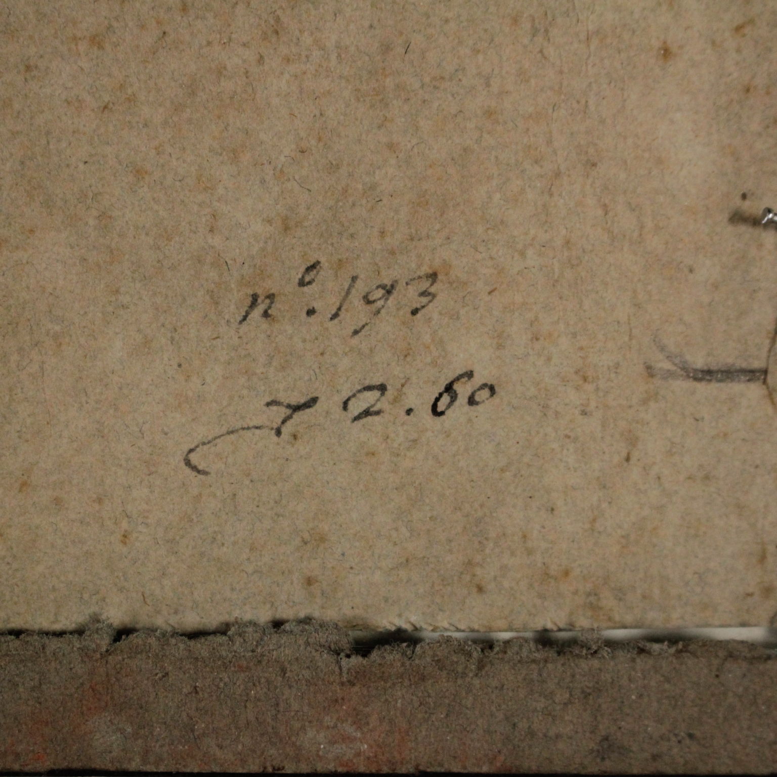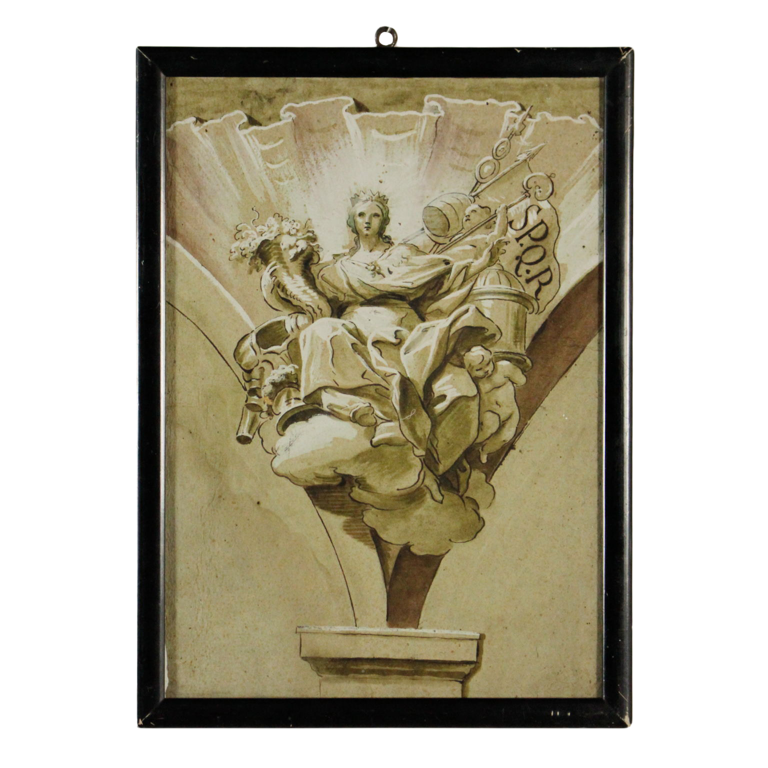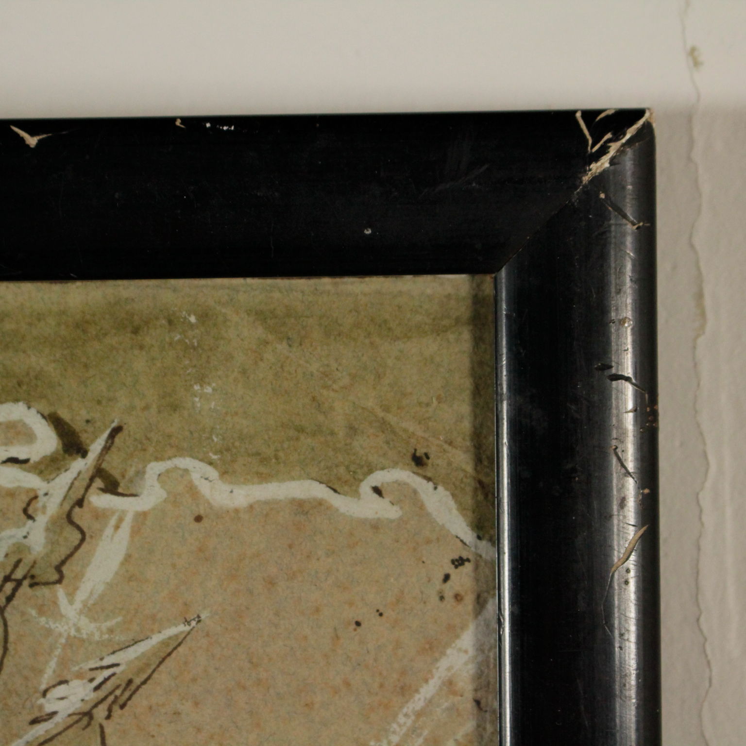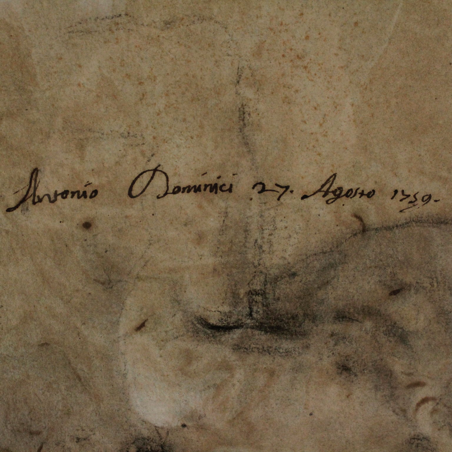 Matita e biacca su carta. Al retro, sovrapposte a bozzetto di figura umana, presenti firma e data (27 agosto 1759); la data ci permette di attribuire lo splendido disegno all'attività giovanile del Dominici. Fra l'attività grafica di questo periodo segnaliamo un foglio con "L'Annunciazione della Vergine", copia da tela del Solimena, firmato e datato Antonio Dominici 18 aprile 1759, conservato alla "Società di storia patria" di Napoli, ed uno studio di figura, con la scritta "Antonio Dominici, 4 dicembre 1759", oggi al Cooper Hewitt Smithsonian Design Museum di New York. In cornice.