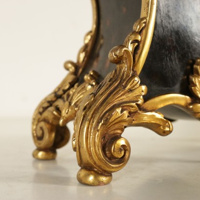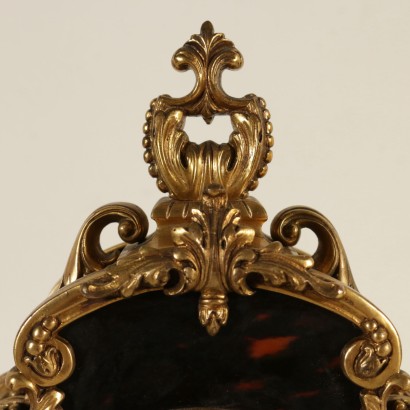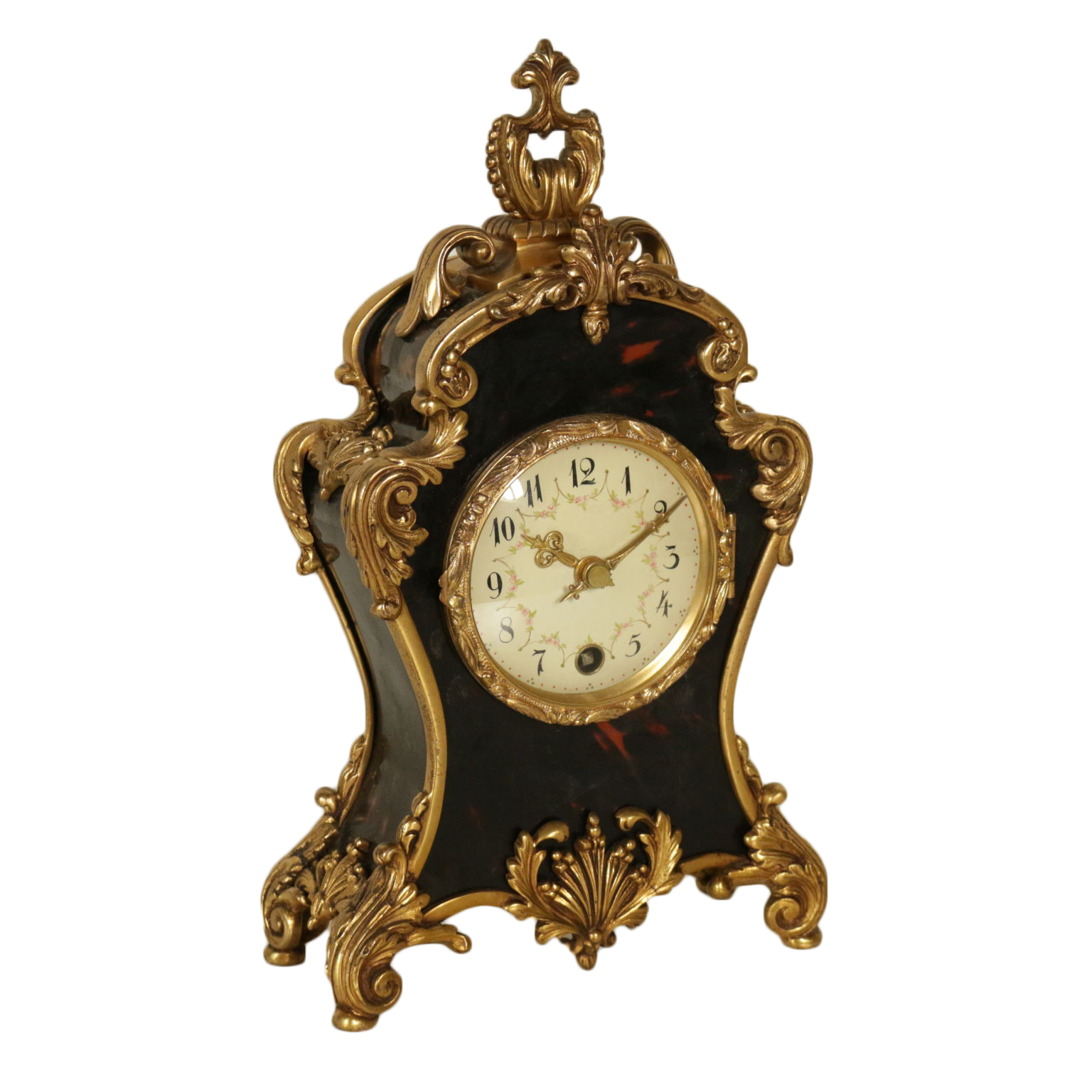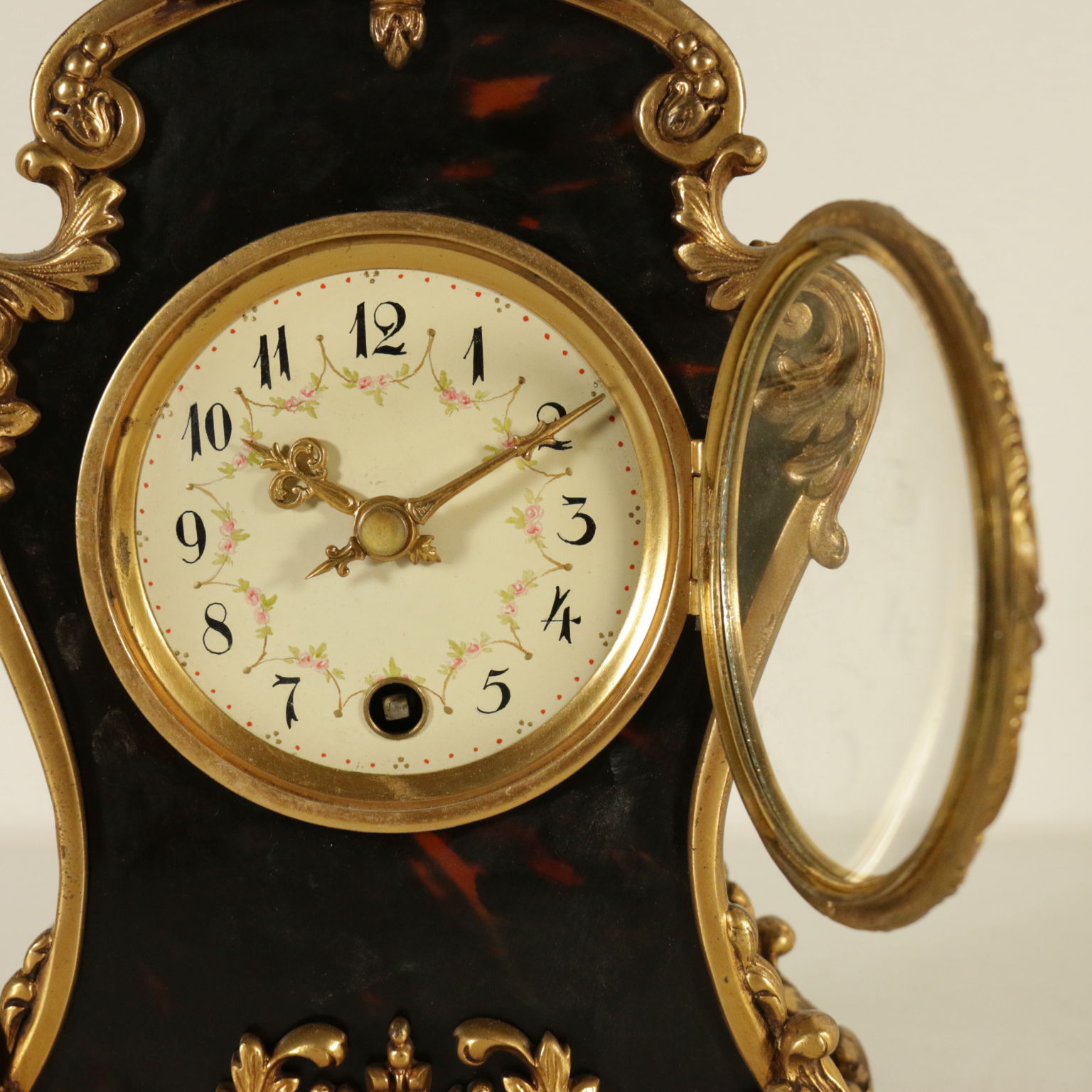 Orologio da tavolo con decoro in bronzo dorato e finta tartaruga. Mostra in metallo dorato con ore disegnate a numeri arabi e lancette in metallo. Meccanismo marcato al suo interno : "Societé industrielle de Moutier".