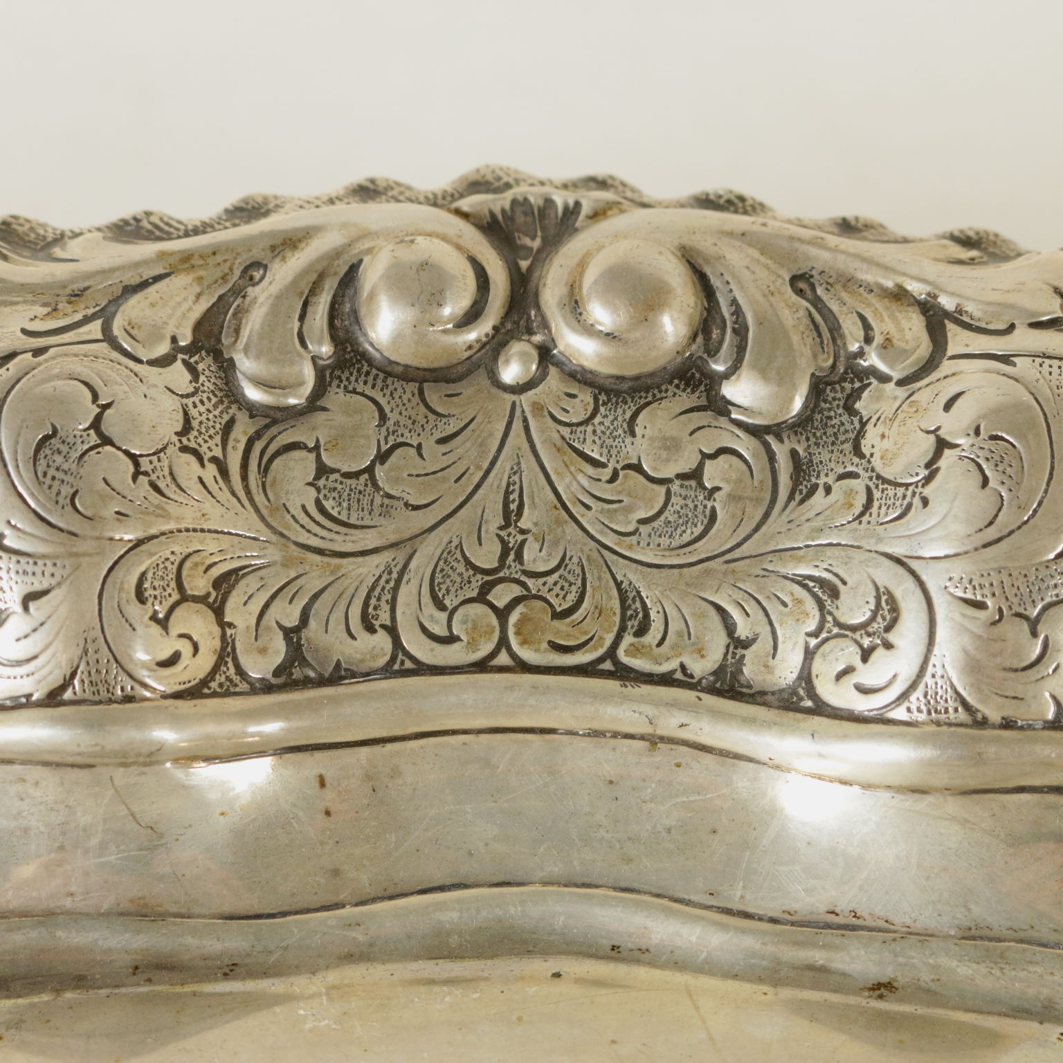 Centrotavola in argento sbalzato. Tesa bacellata con decori a rilievo a carattere vegetale e rifiniture lavorate a bulino. Marchio dell'argento sotto la base. Gr. 726.