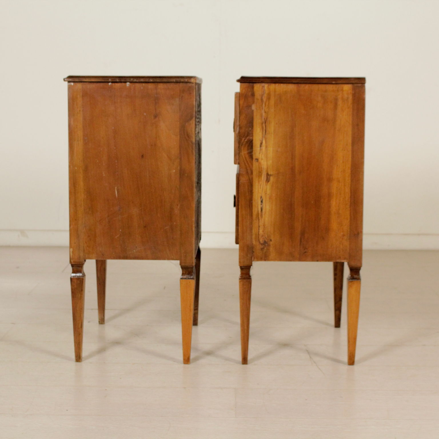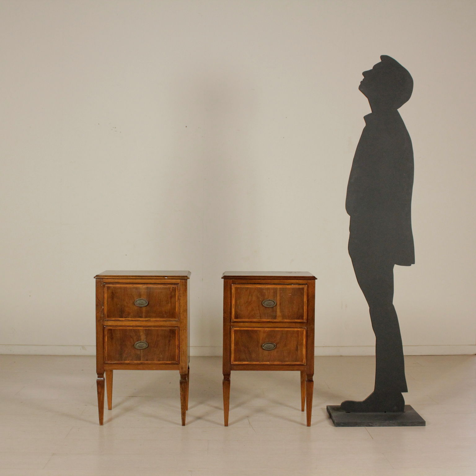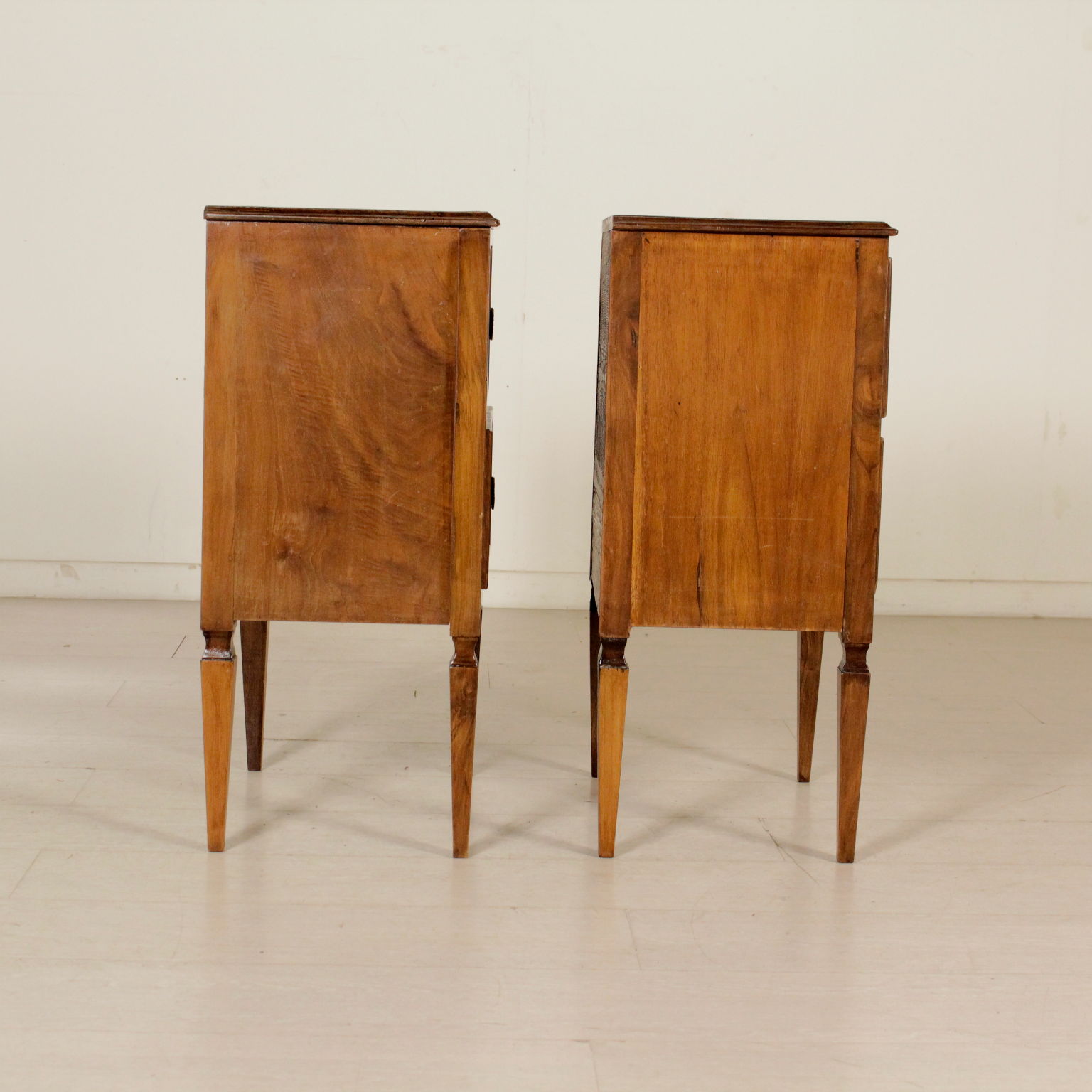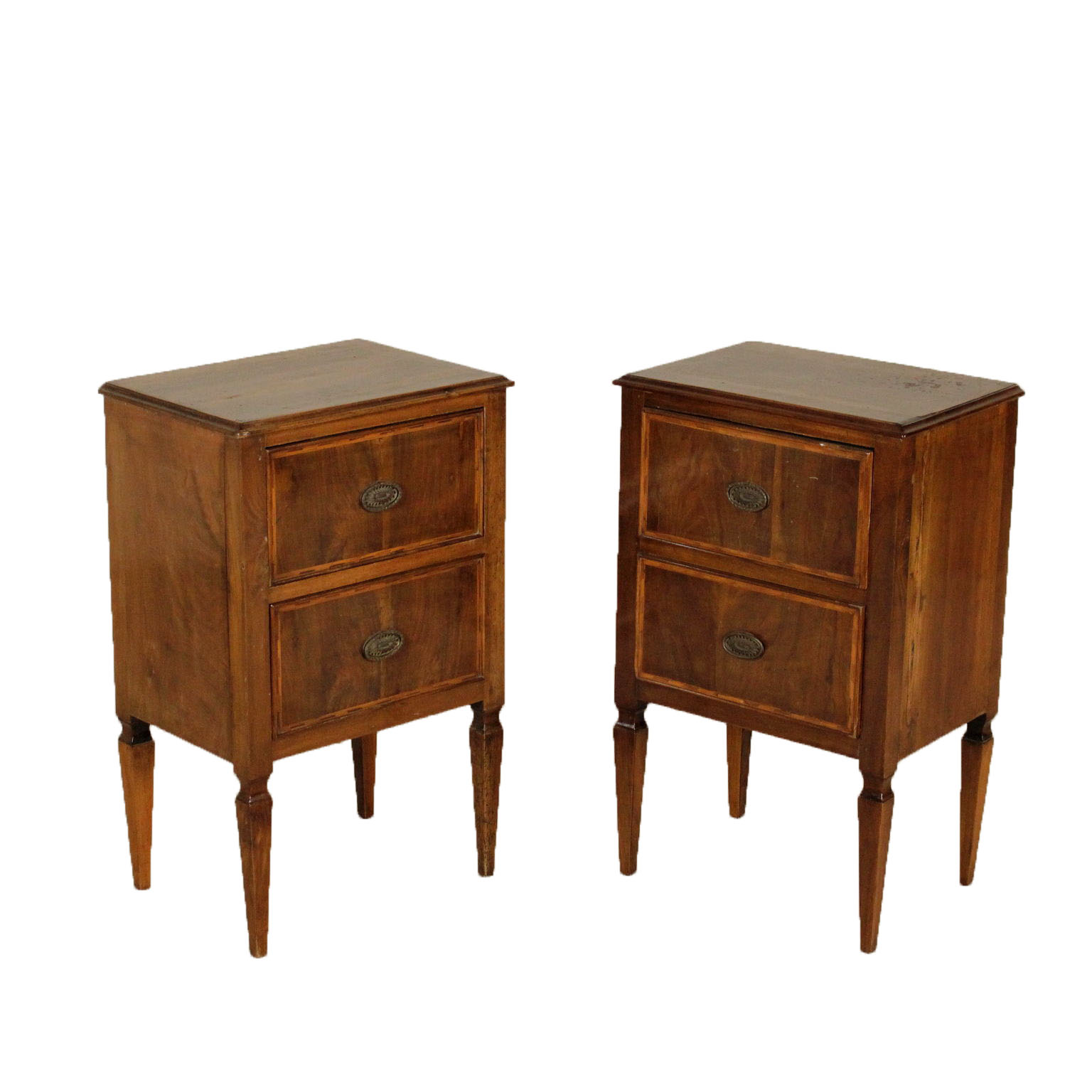 Coppia di comodini assemblati in parte con legni antichi. Presentano due cassetti lastronati in piuma di noce. Piedi troncopiramidali. Presenta filettature.