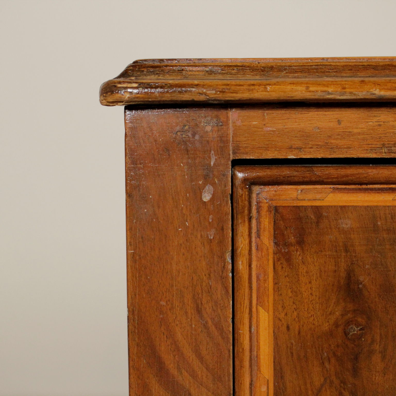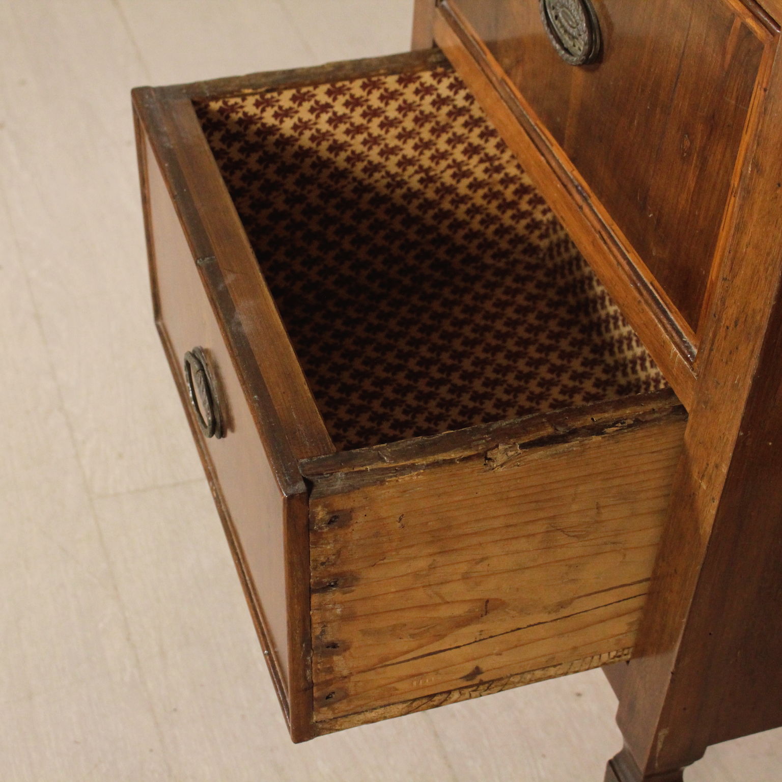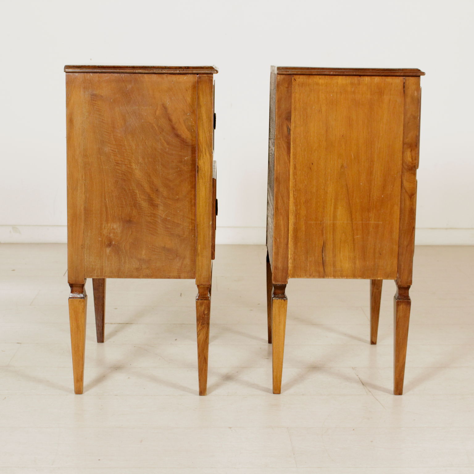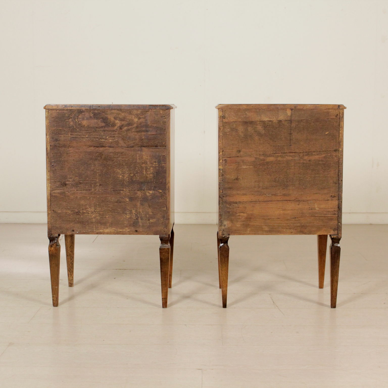 Coppia di comodini assemblati in parte con legni antichi. Presentano due cassetti lastronati in piuma di noce. Piedi troncopiramidali. Presenta filettature.