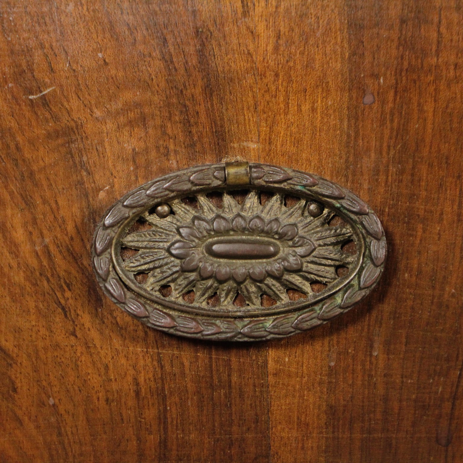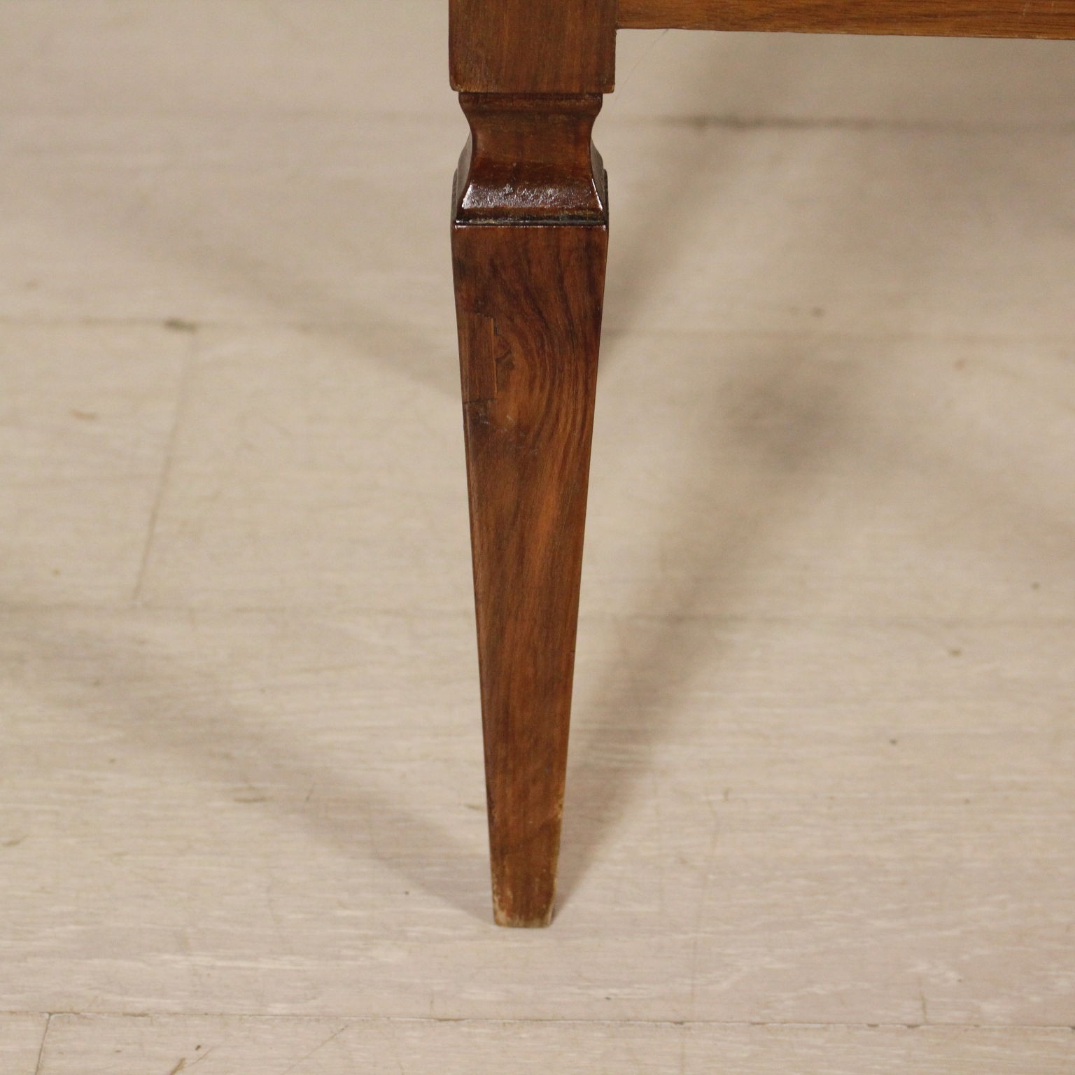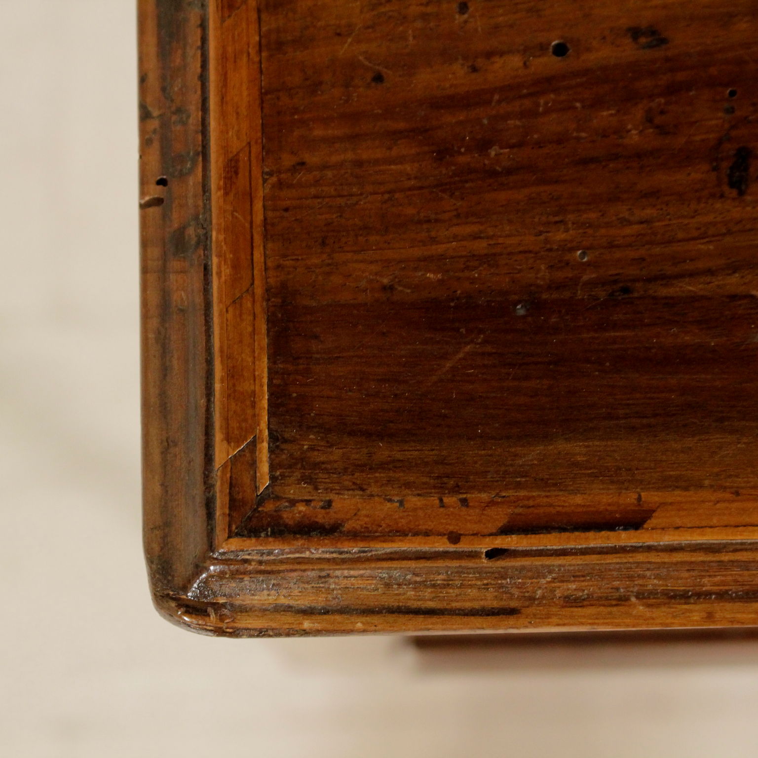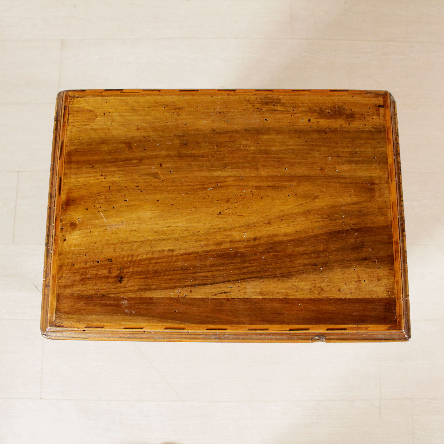 Coppia di comodini assemblati in parte con legni antichi. Presentano due cassetti lastronati in piuma di noce. Piedi troncopiramidali. Presenta filettature.