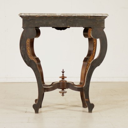 Elegante consolle retta da gambe mosse raccordate da crociera con tornitura. Fascia sagomata e piano in marmo. Impreziosita da raffinati intarsi in acero.