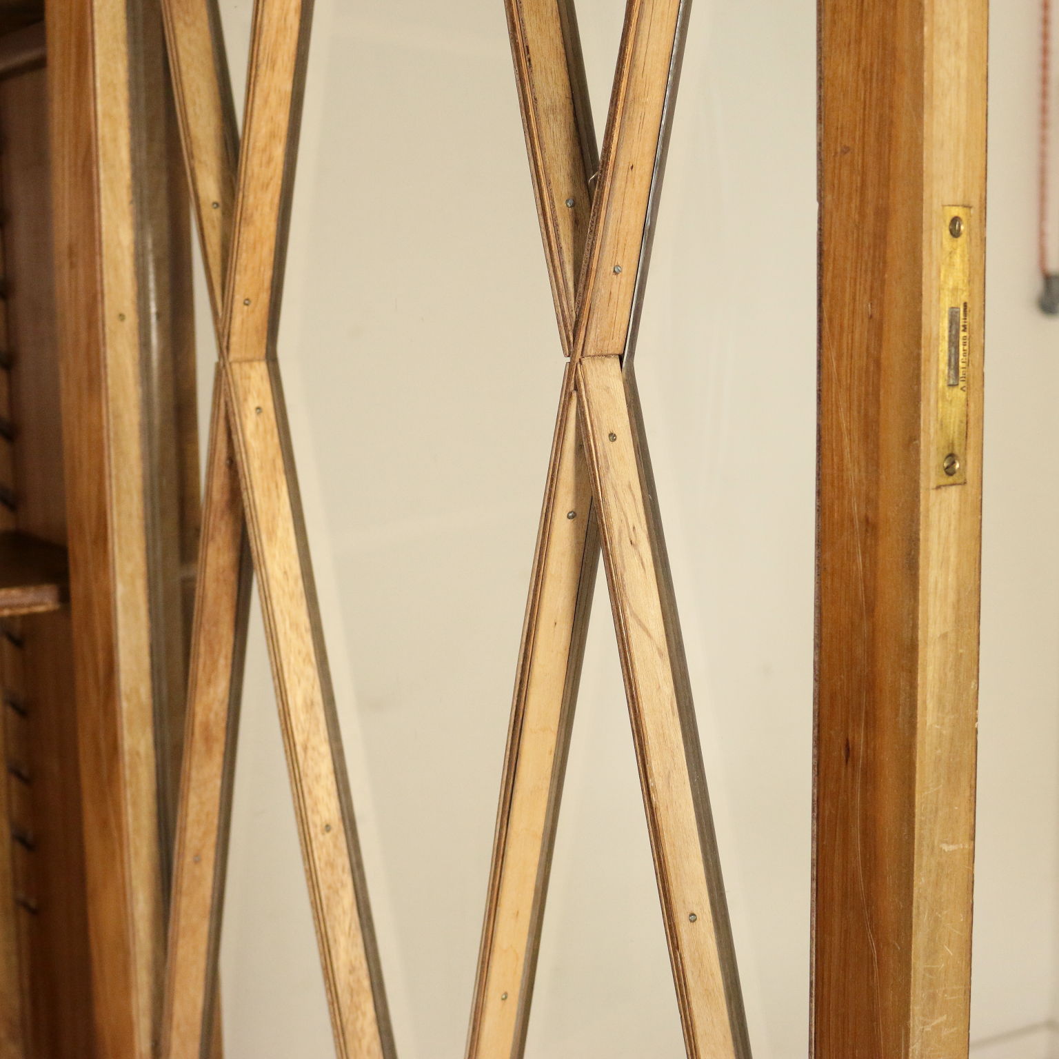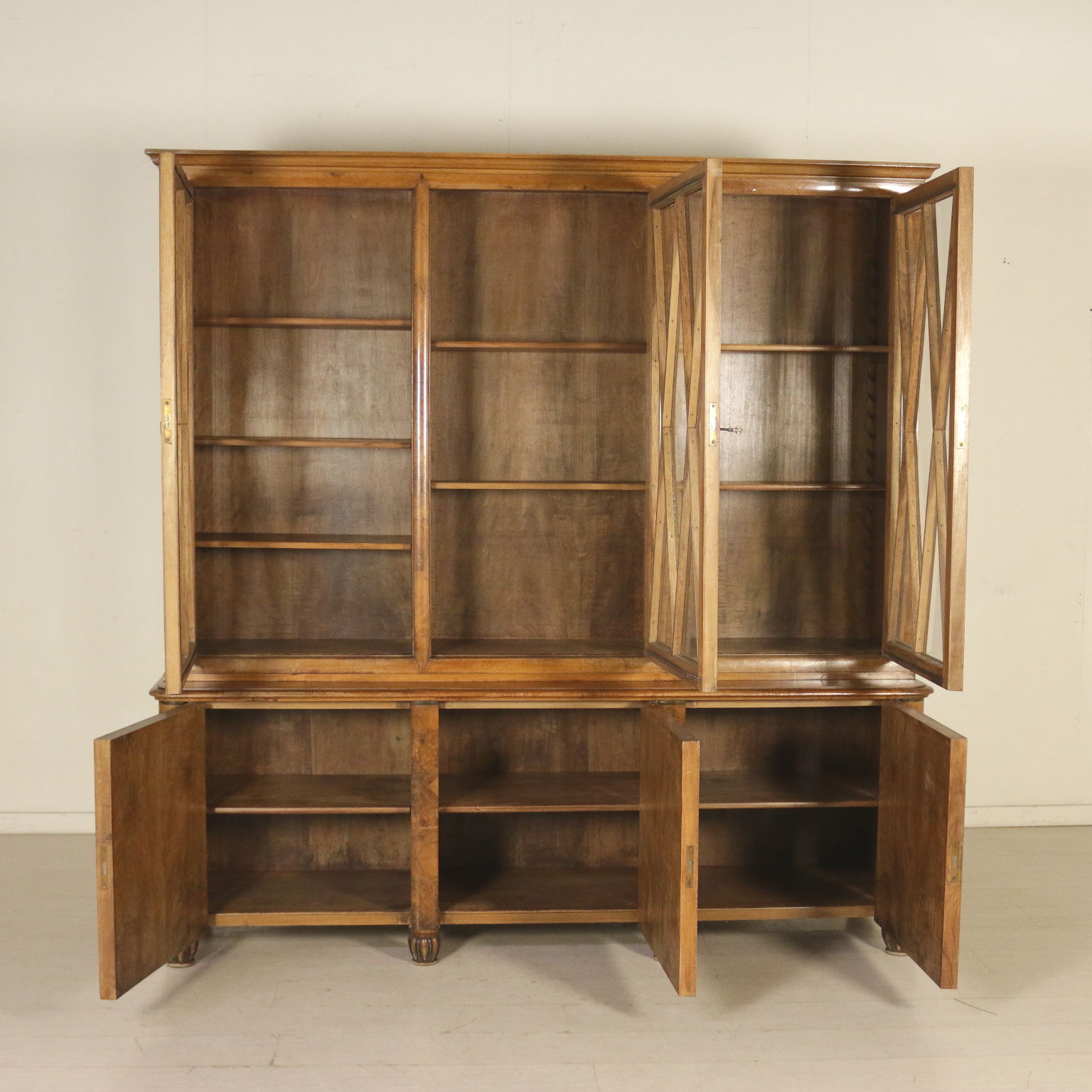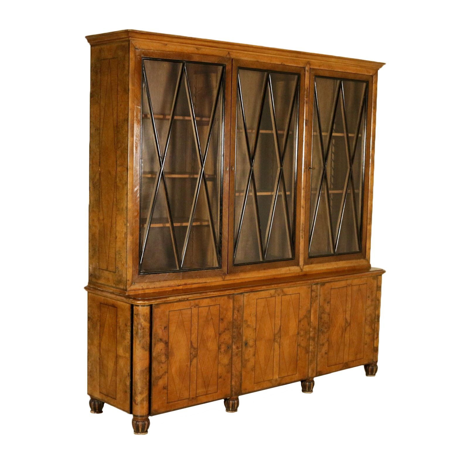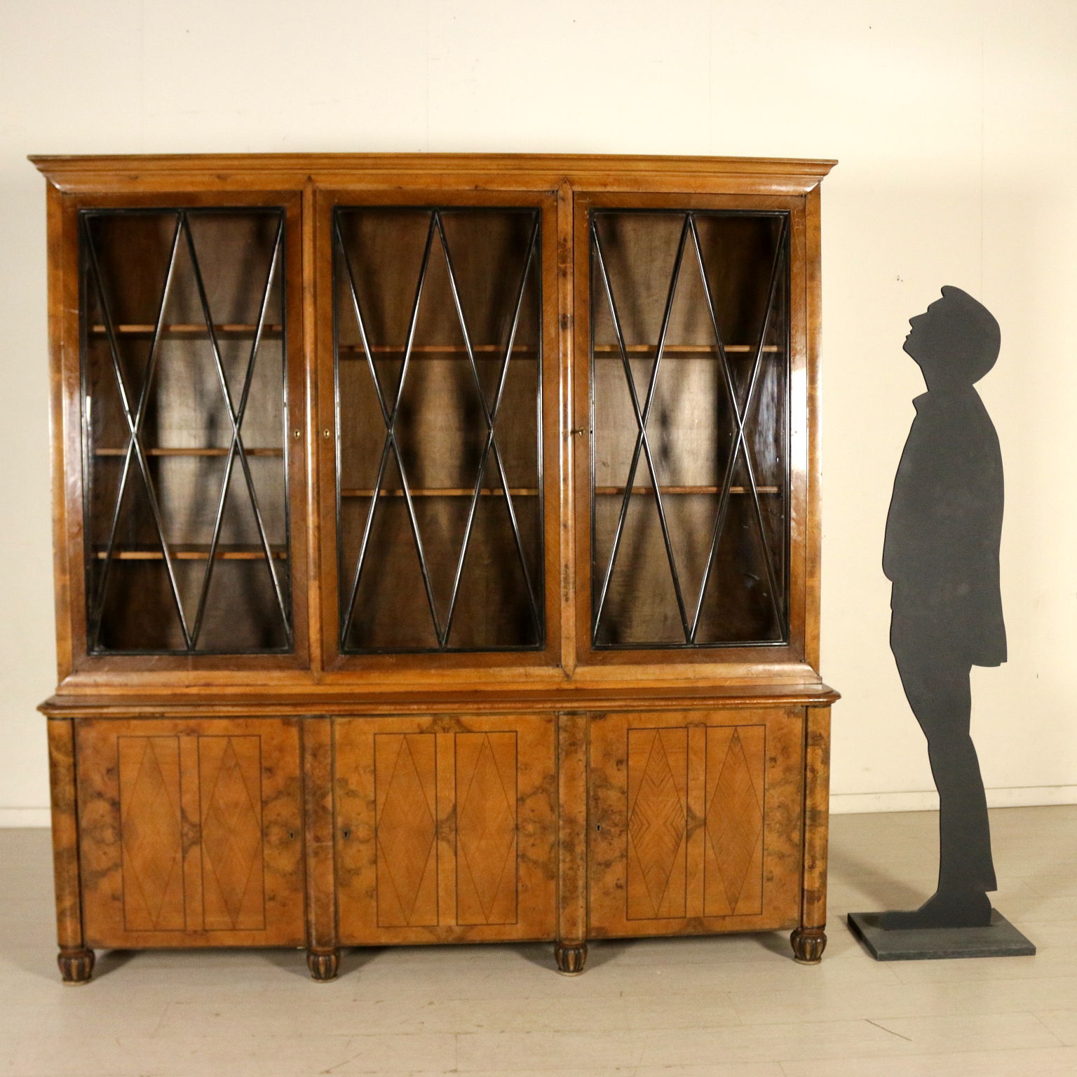 Libreria a due corpi; presenta tre ante con riserve intarsiate e filettature. Tre ante con vetri e griglie in legno. Retta da piedi intagliati.