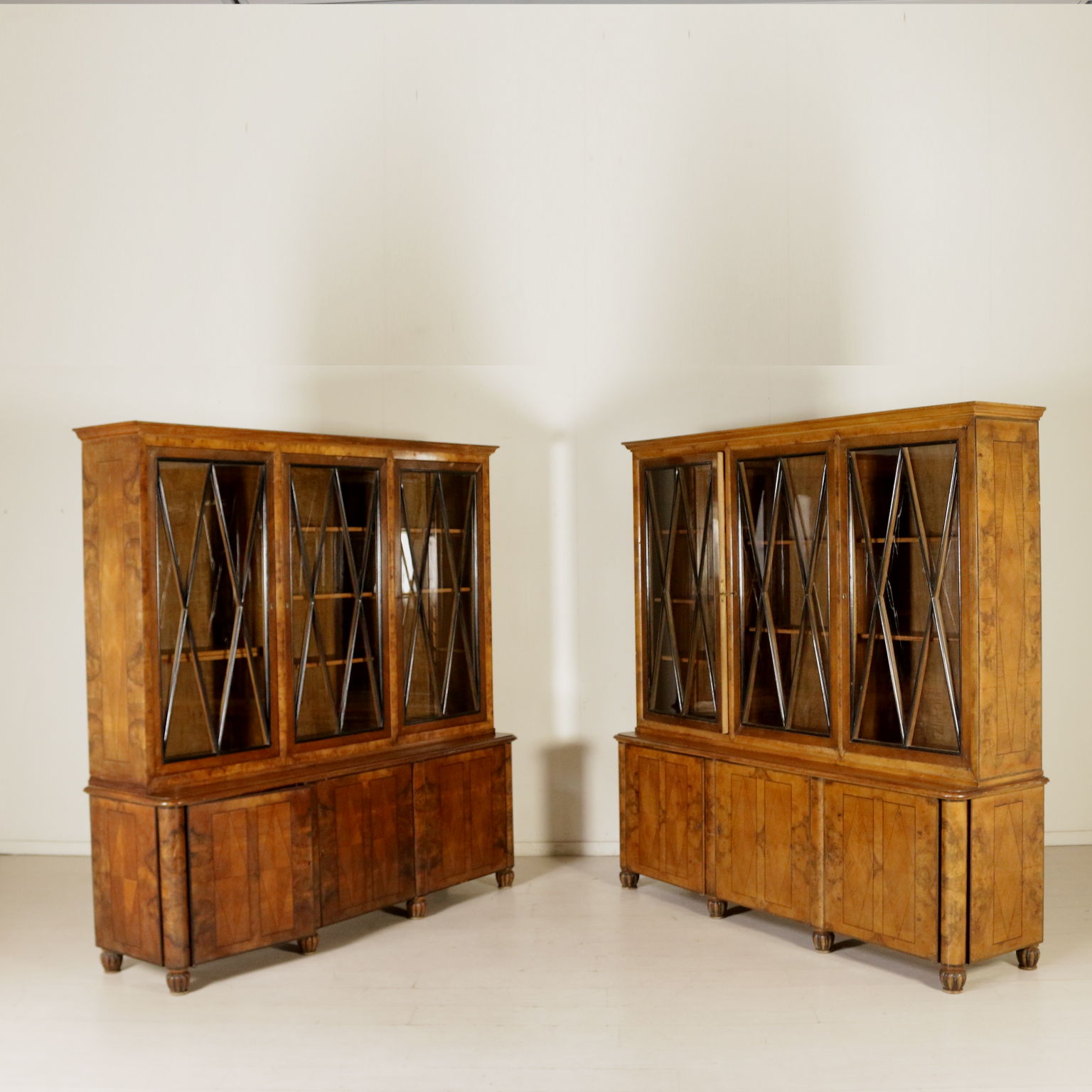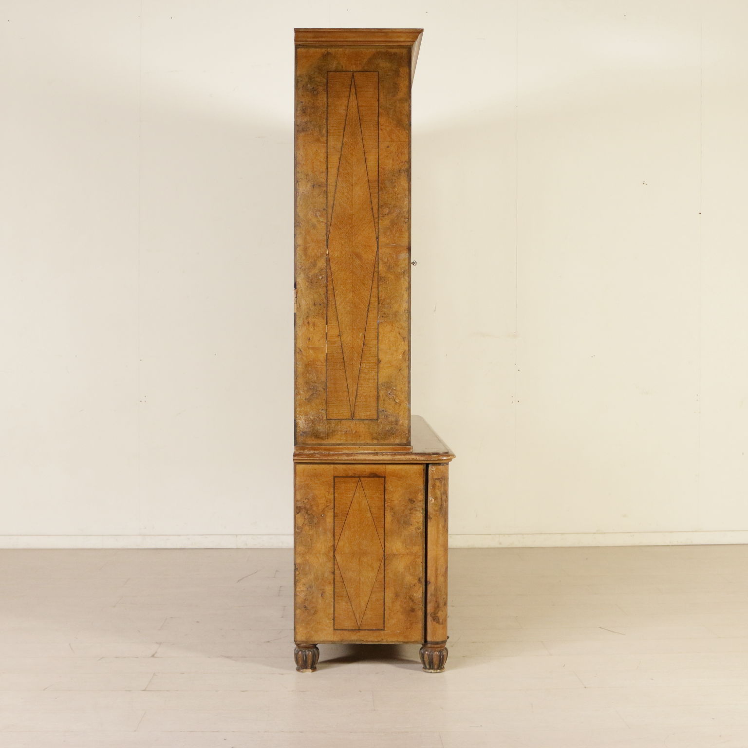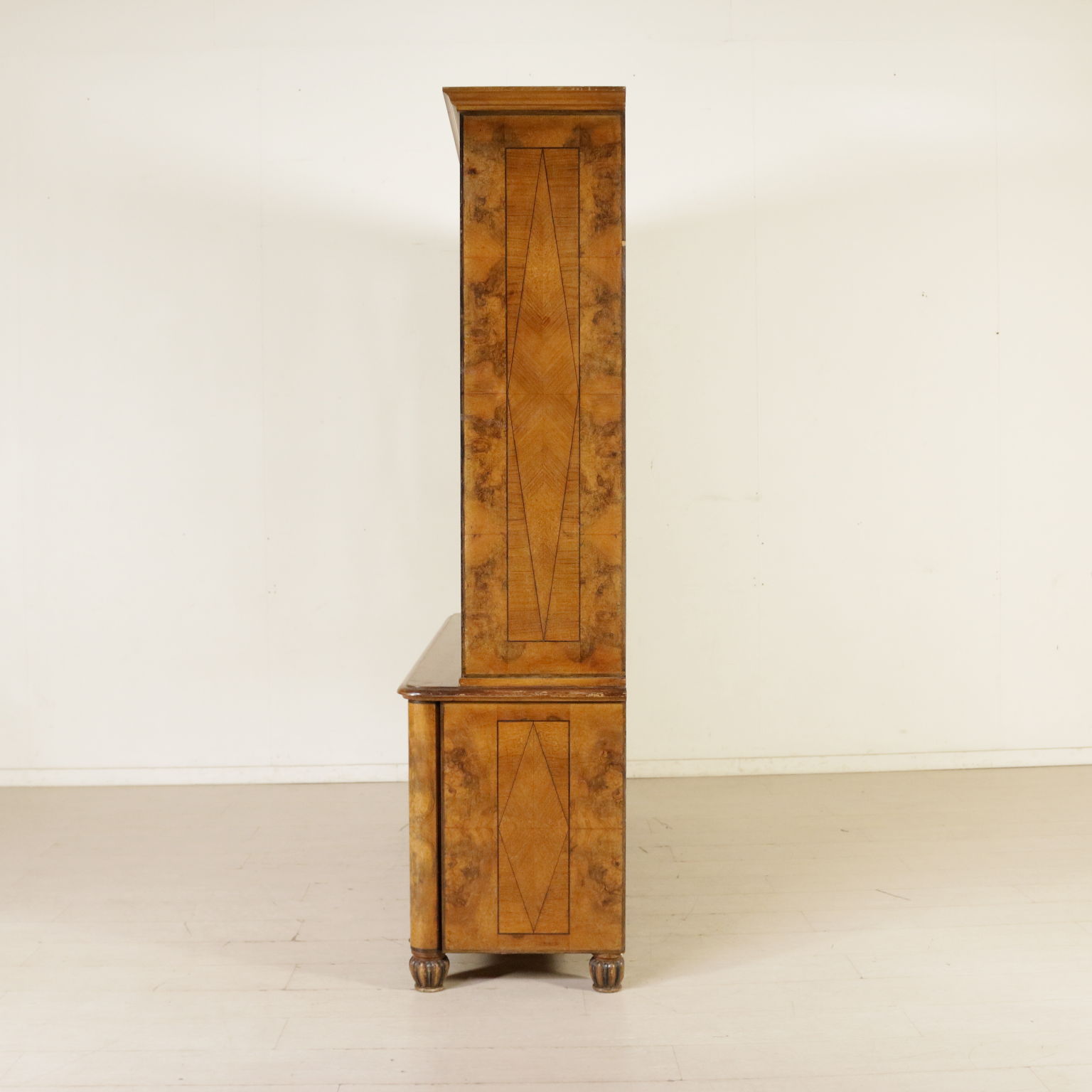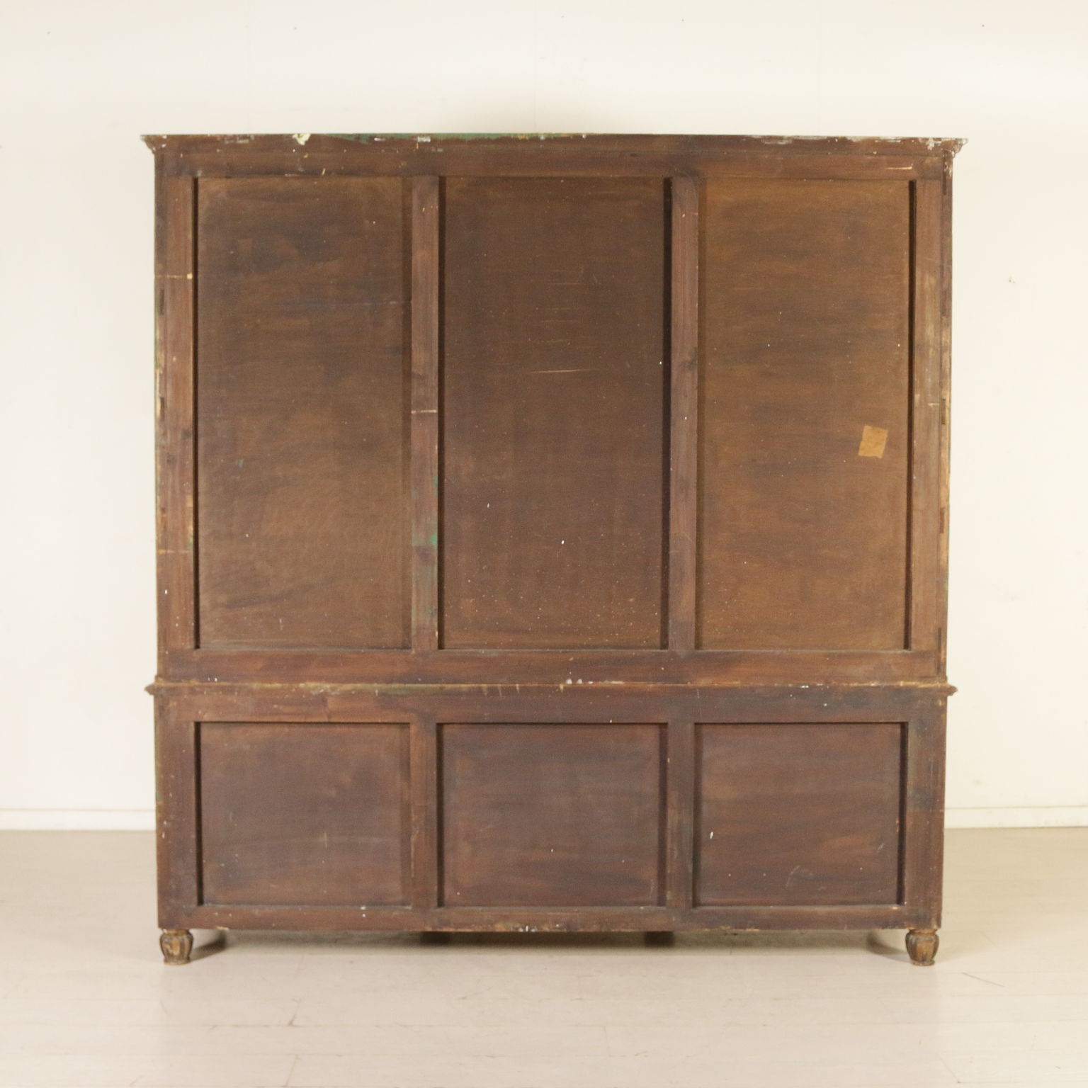 Libreria a due corpi; presenta tre ante con riserve intarsiate e filettature. Tre ante con vetri e griglie in legno. Retta da piedi intagliati.