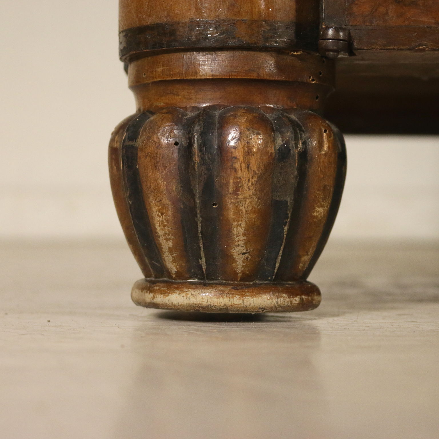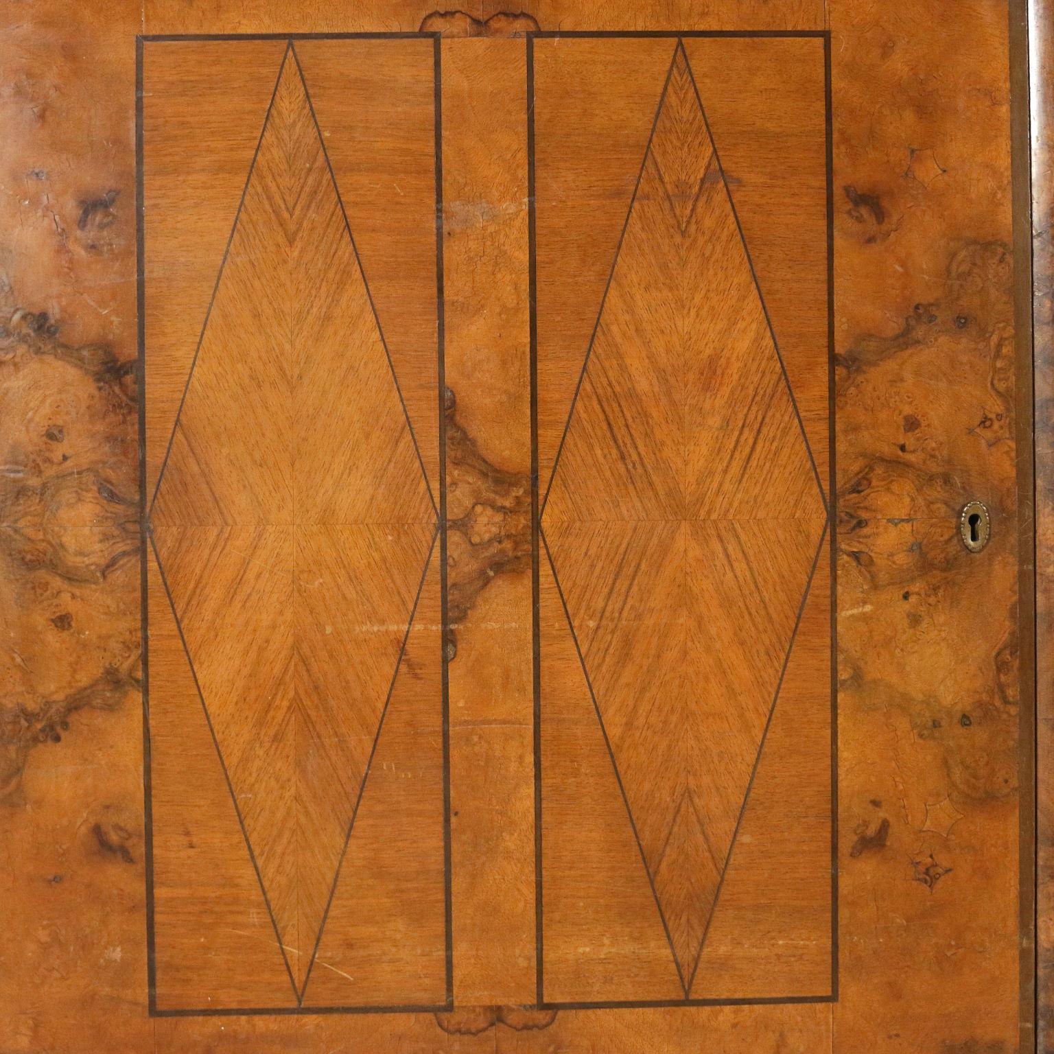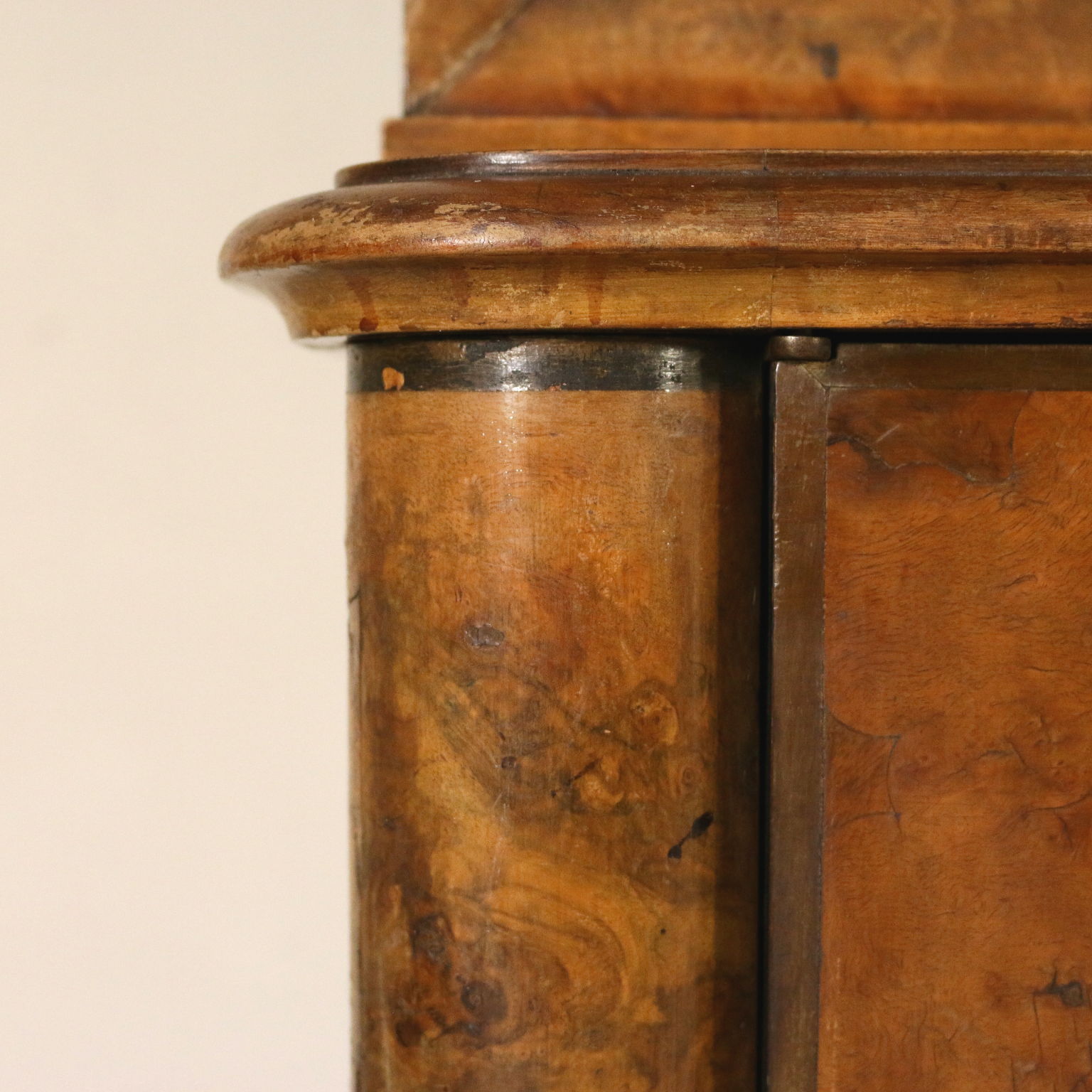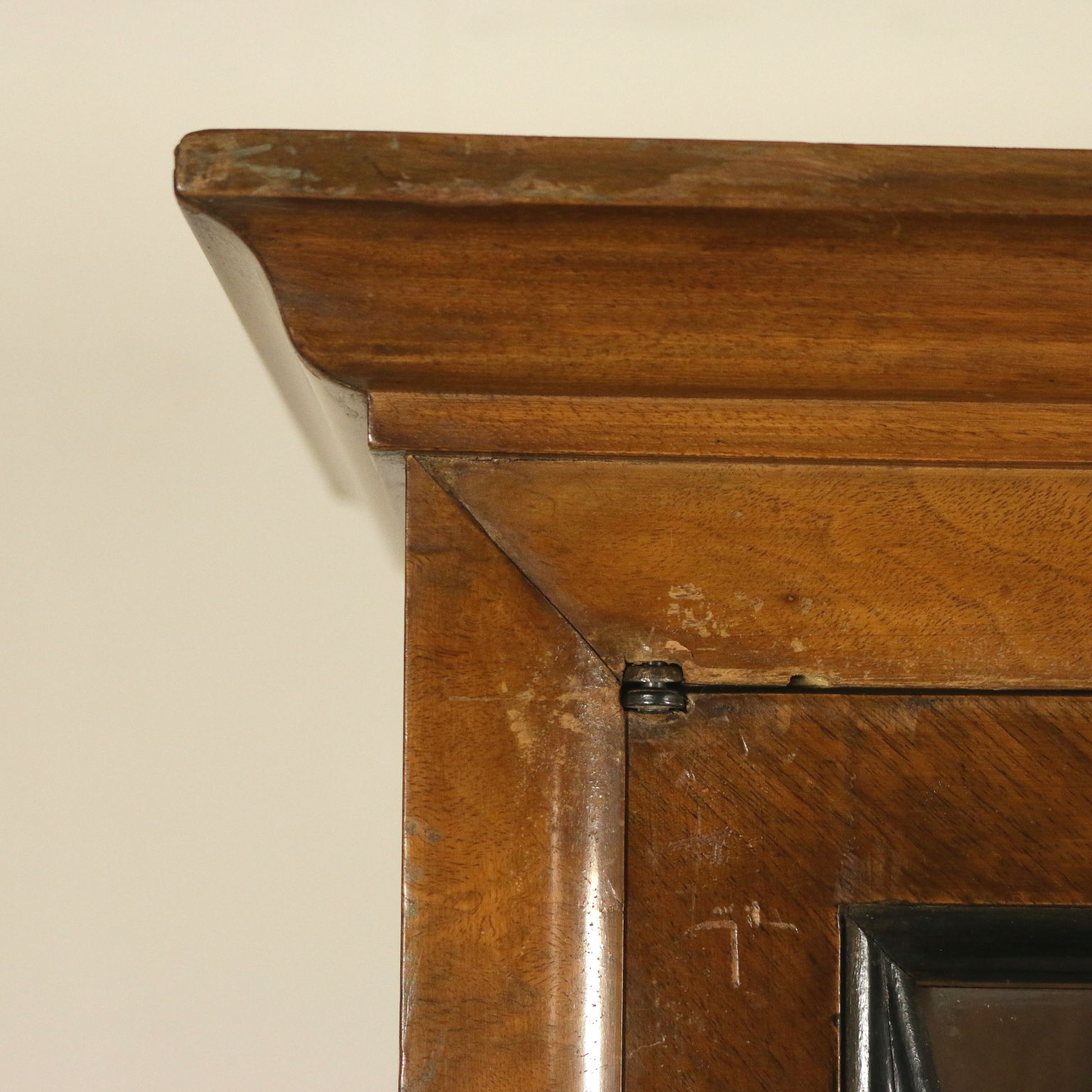 Libreria a due corpi; presenta tre ante con riserve intarsiate e filettature. Tre ante con vetri e griglie in legno. Retta da piedi intagliati.