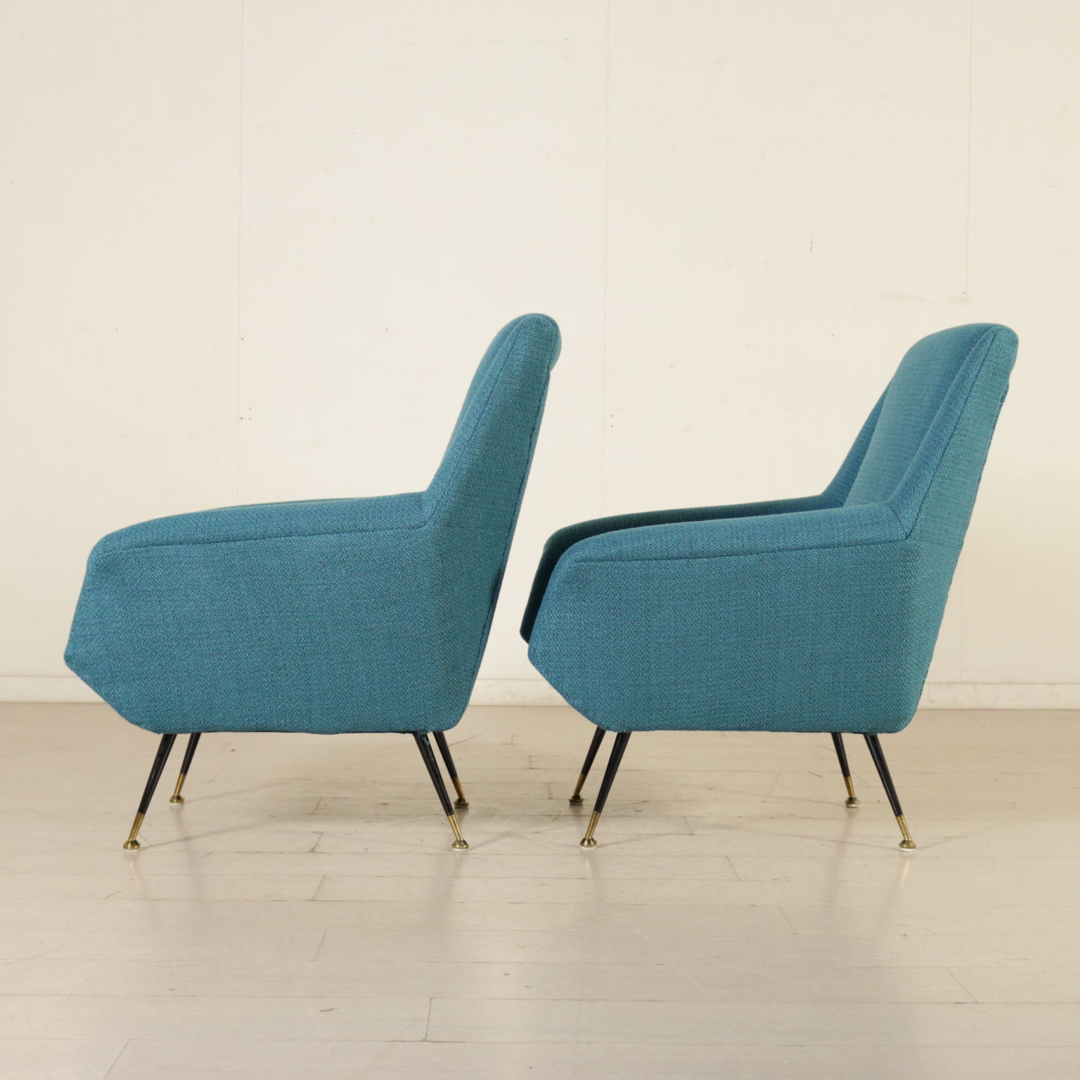Coppia di poltrone; imbottitura in espanso, rivestimento in tessuto, gambe in metallo ed ottone.