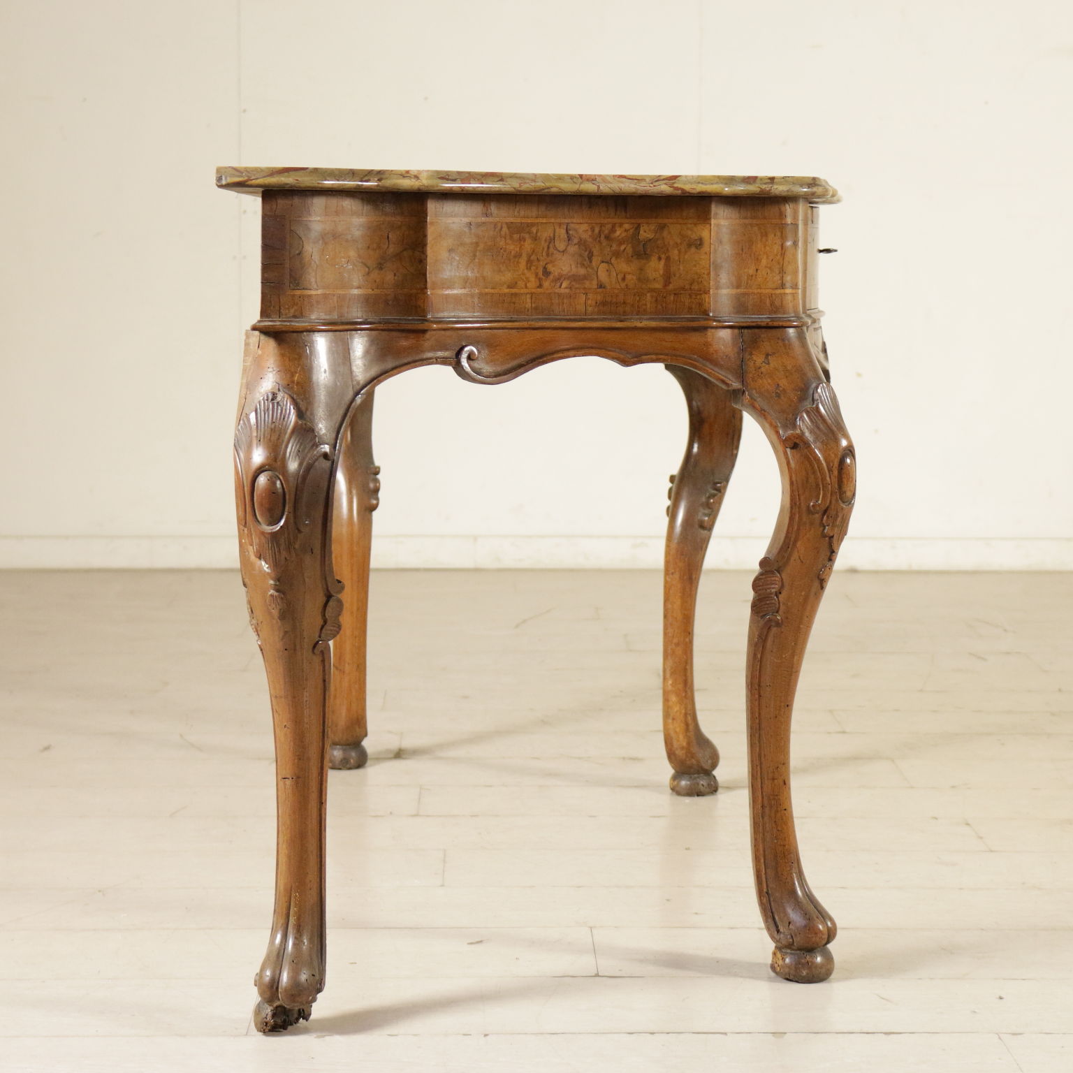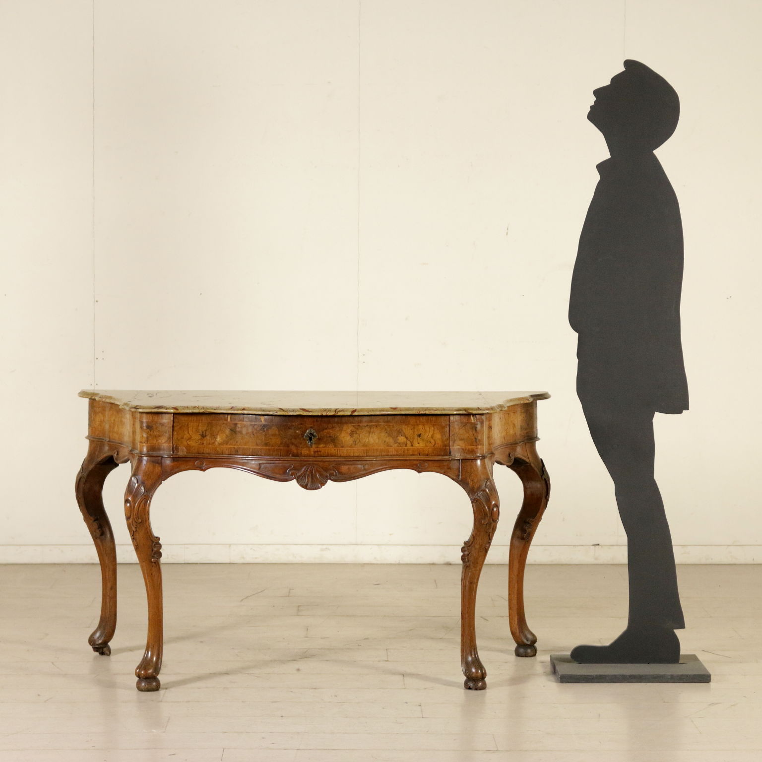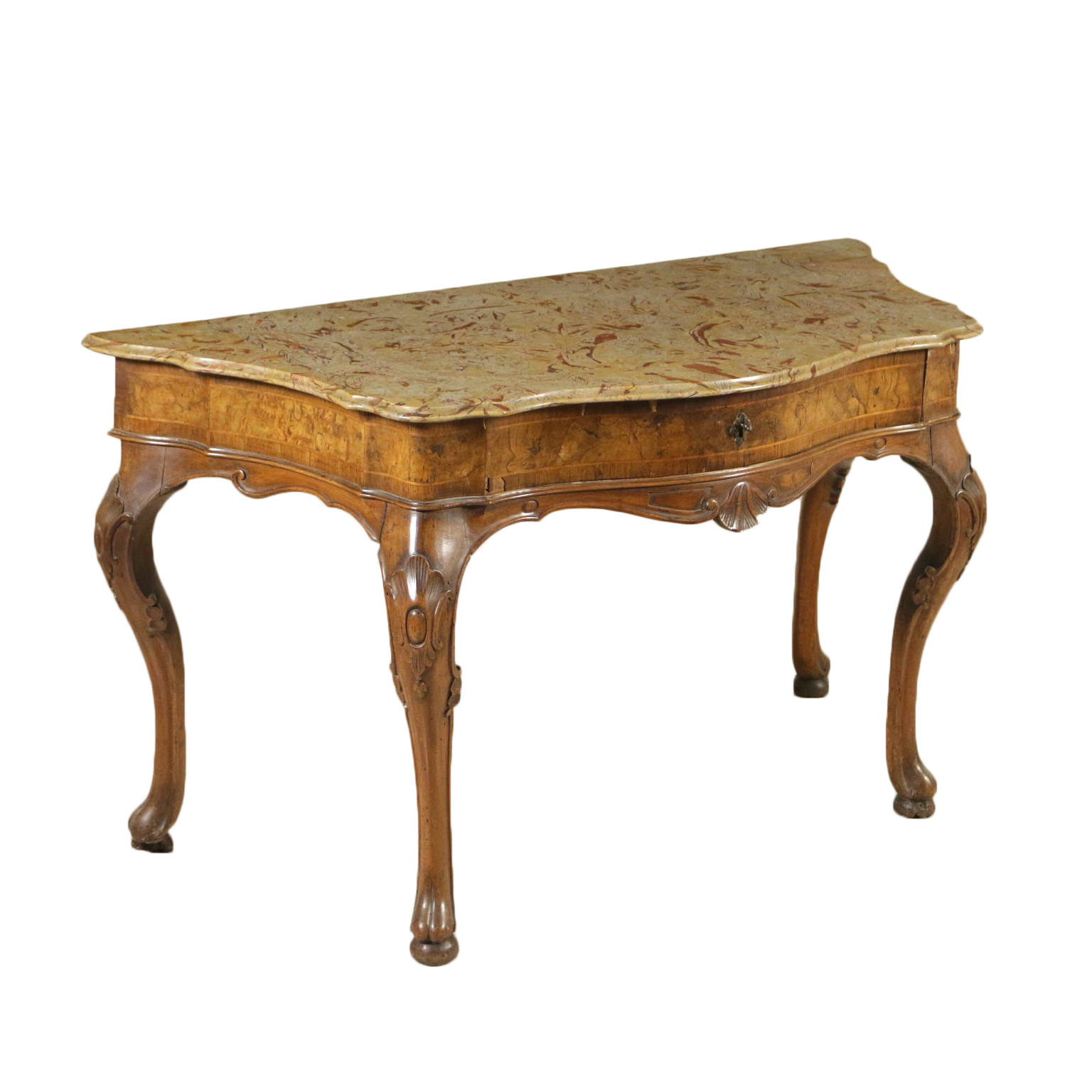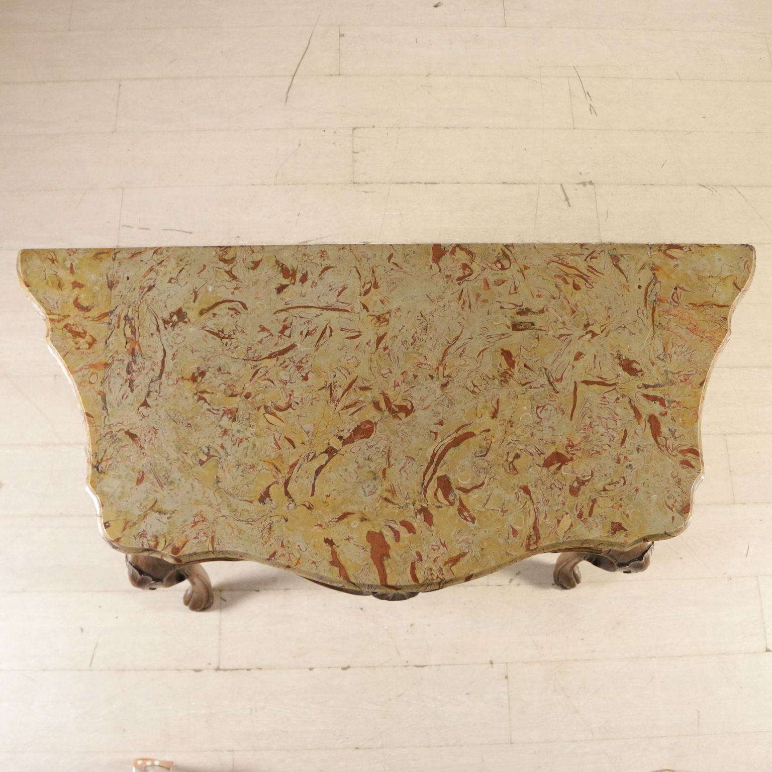 Consolle mossa su fronte e fianchi; retta da gambe mosse, presenta un cassetto nella fascia. Intagli e piano in marmo.