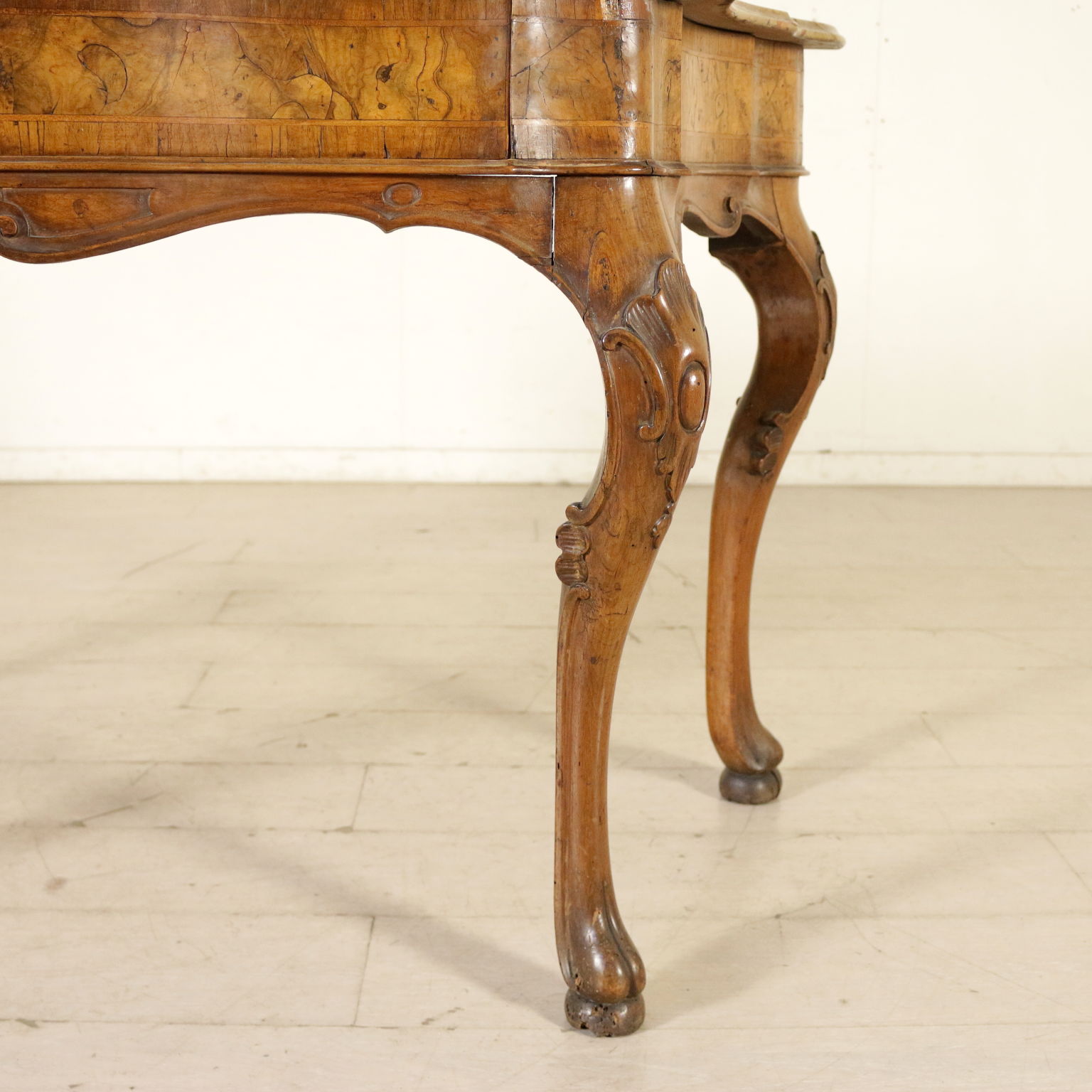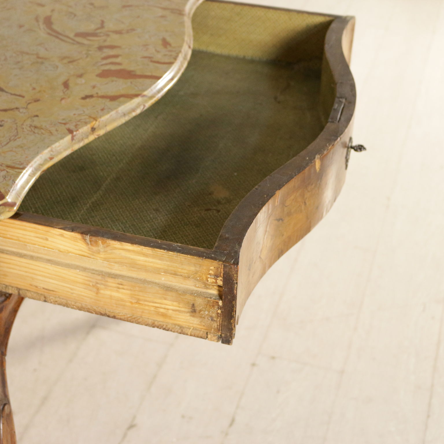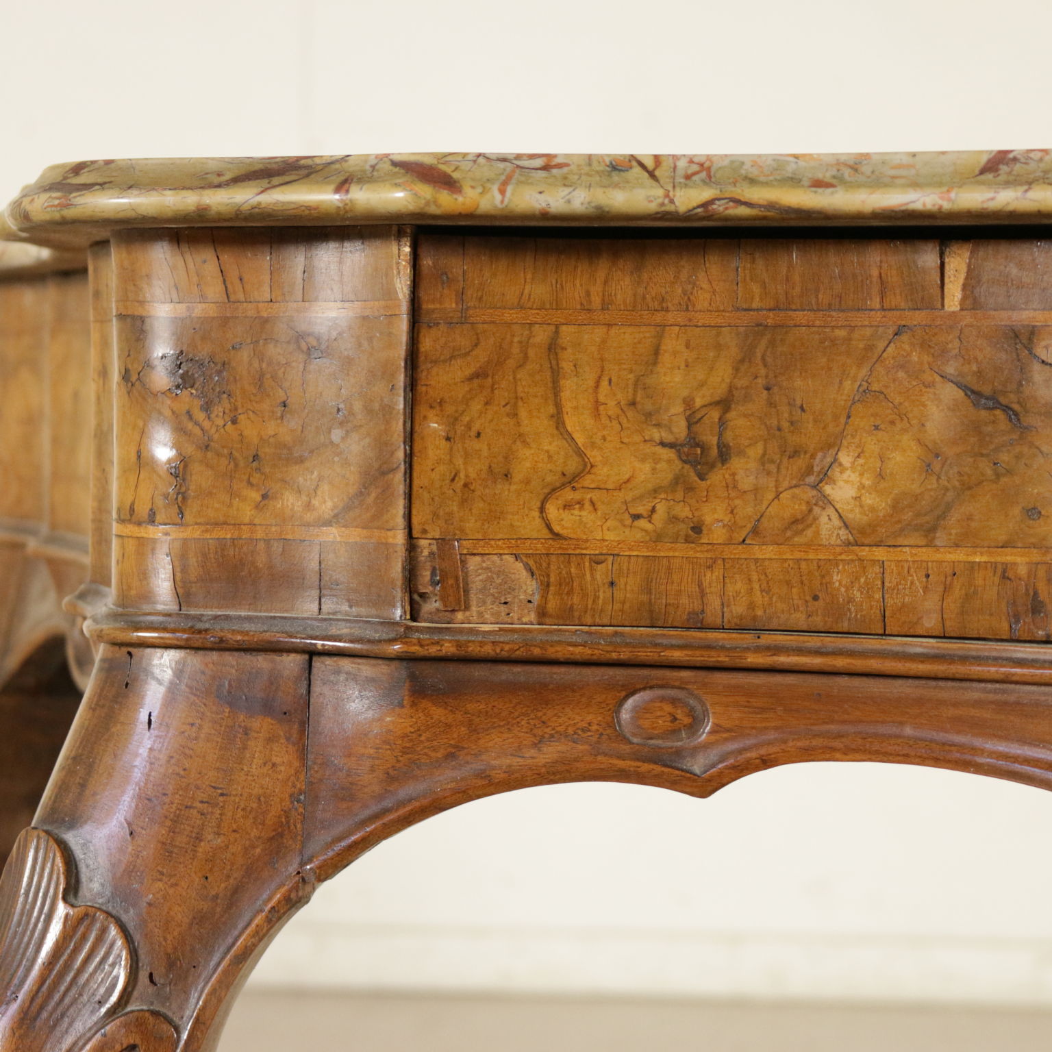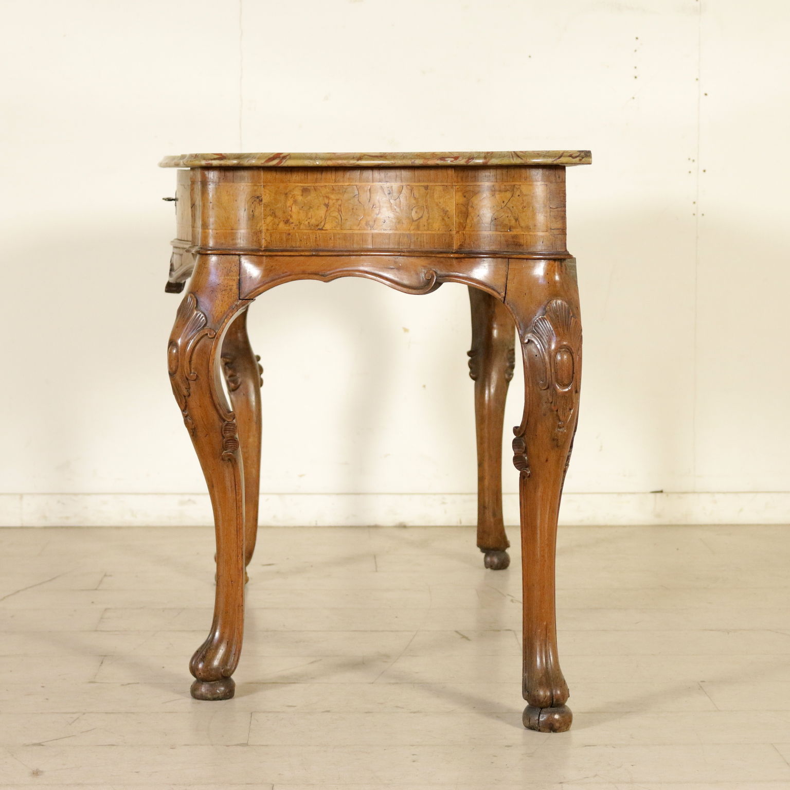 Consolle mossa su fronte e fianchi; retta da gambe mosse, presenta un cassetto nella fascia. Intagli e piano in marmo.