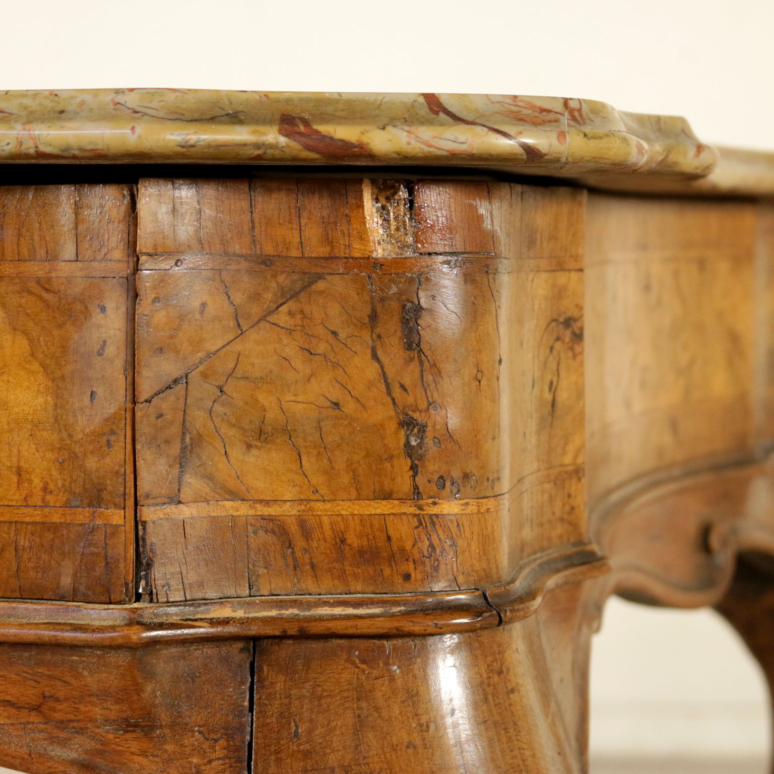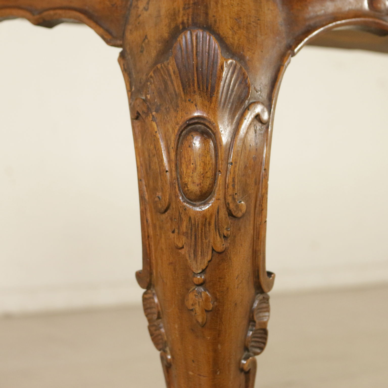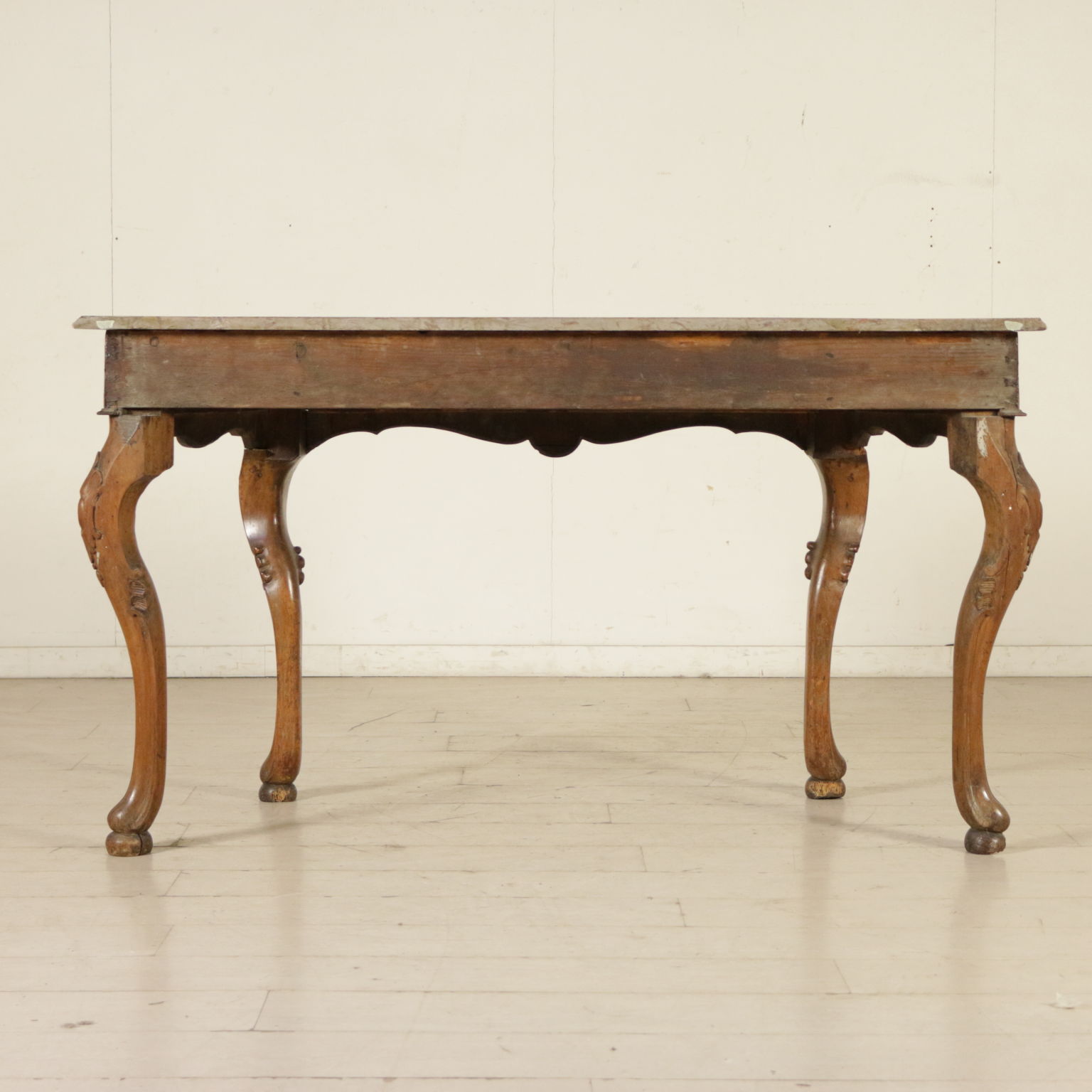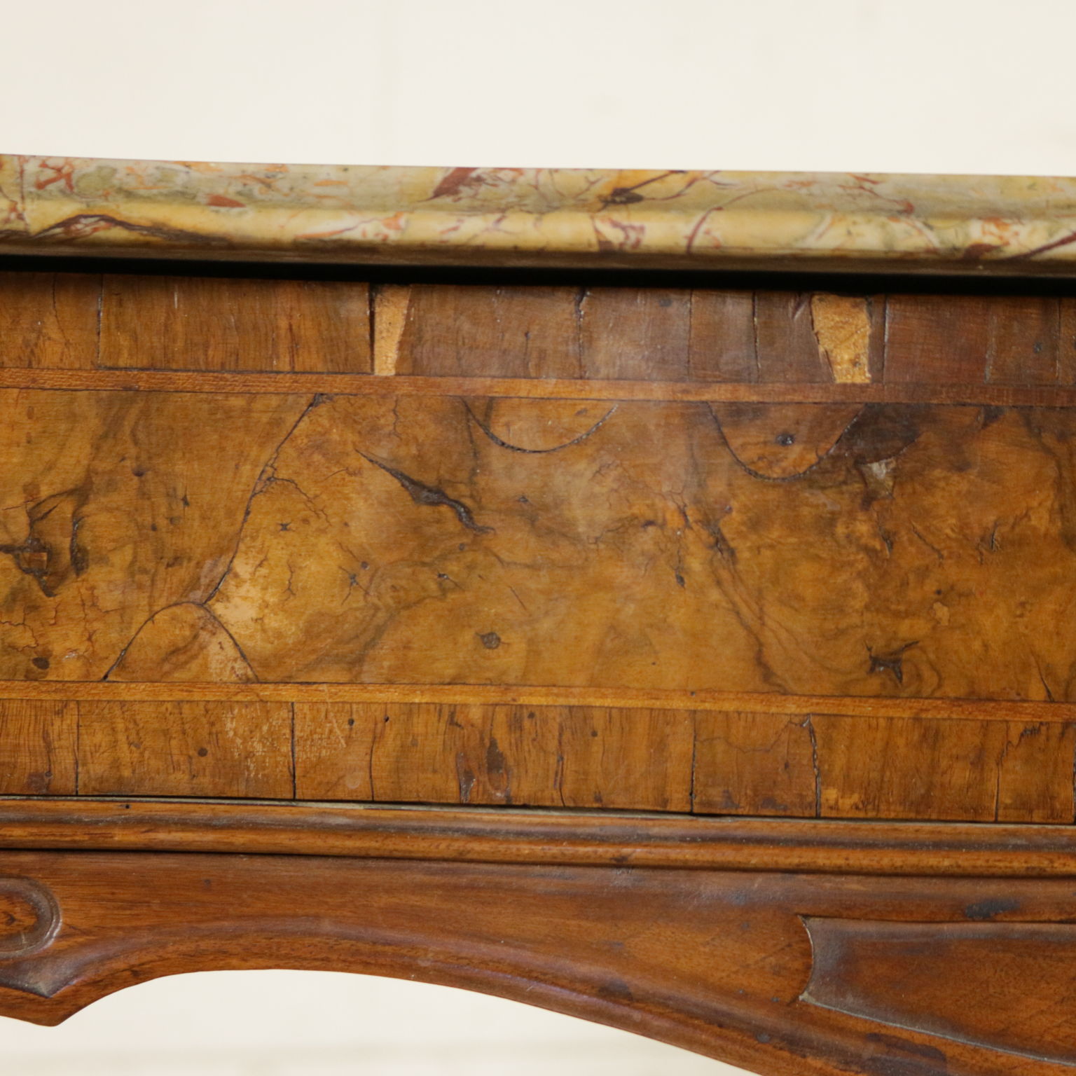 Consolle mossa su fronte e fianchi; retta da gambe mosse, presenta un cassetto nella fascia. Intagli e piano in marmo.