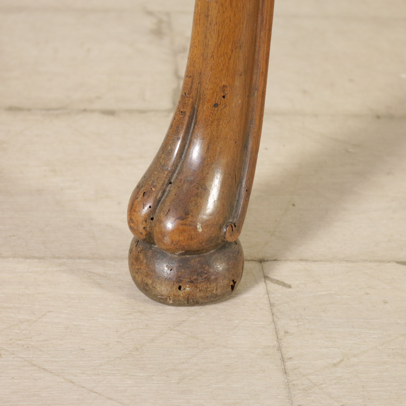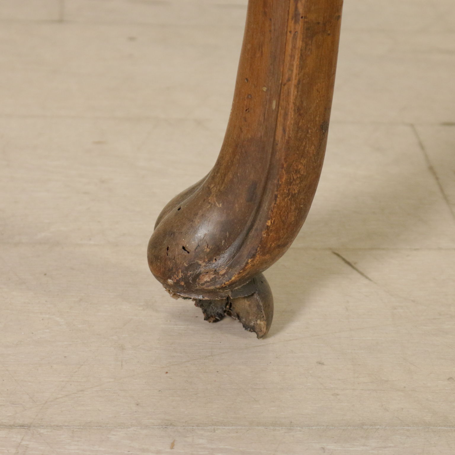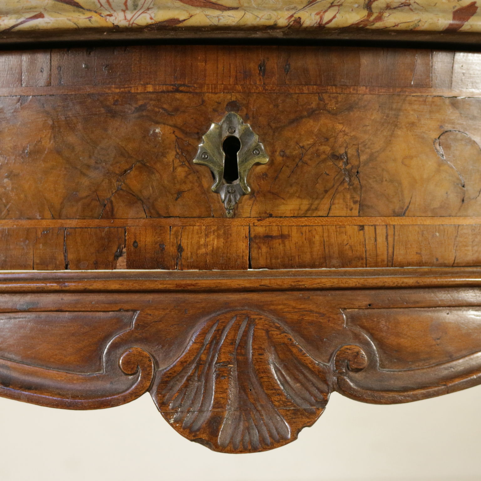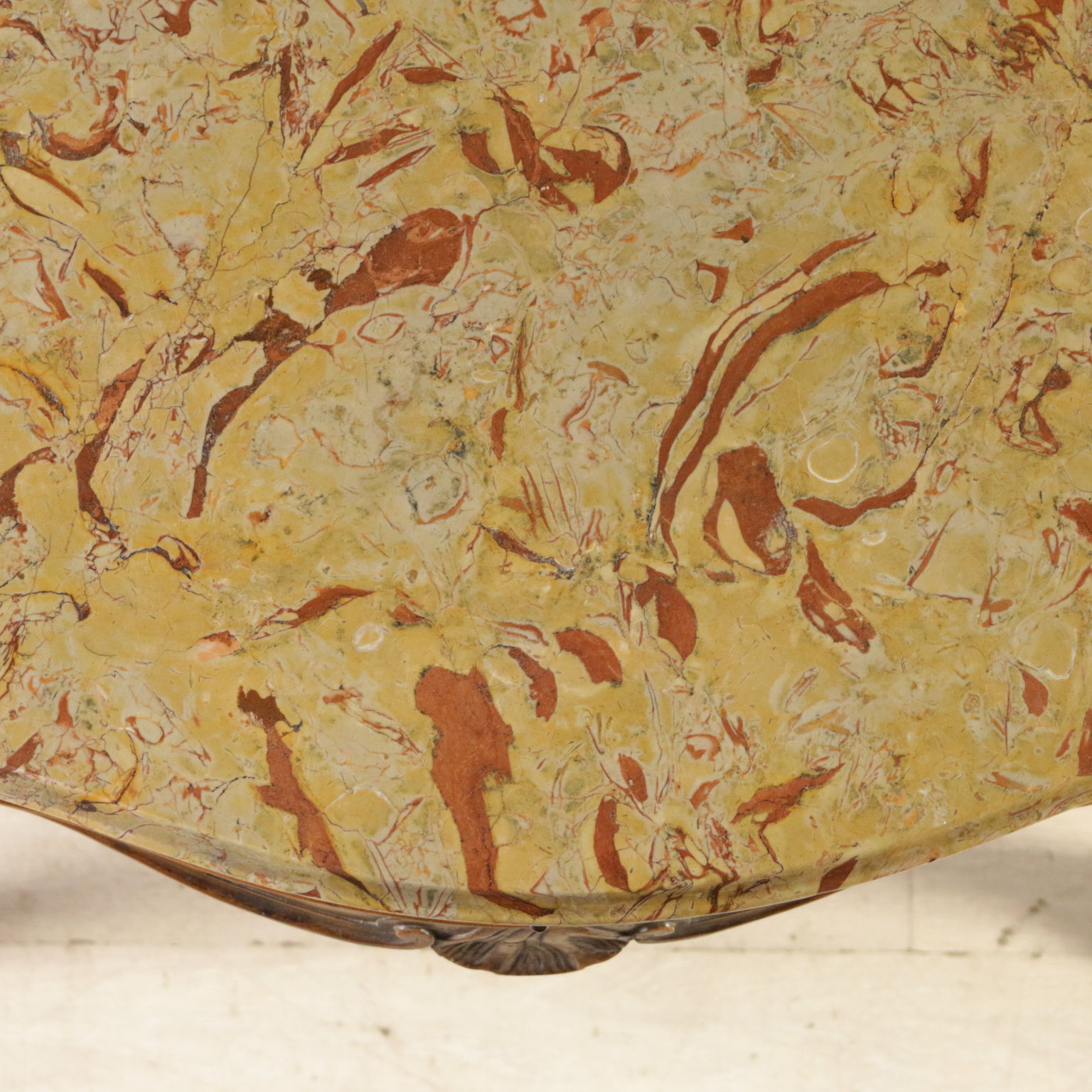 Consolle mossa su fronte e fianchi; retta da gambe mosse, presenta un cassetto nella fascia. Intagli e piano in marmo.