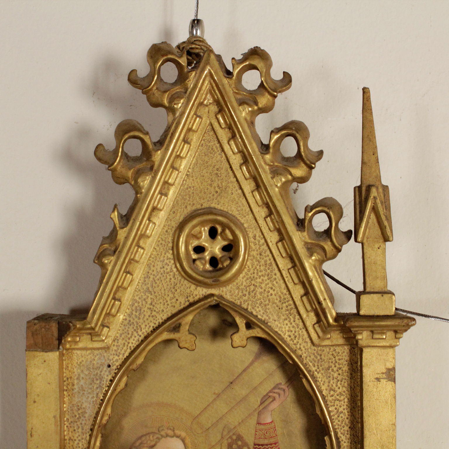 Cornice in legno intagliato e dorato in stile gotico. All'interno stampa raffigurante angelo suonante.