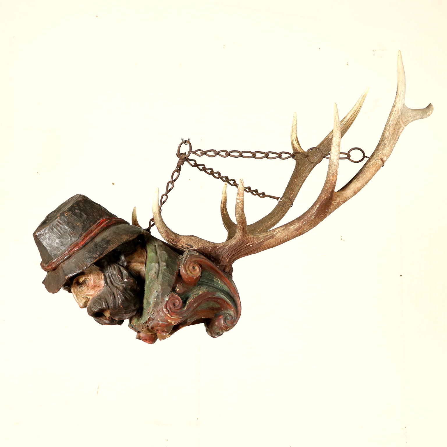 Luster tirolese con corna di cervo e volto di uomo in legno intagliato a patina policroma. La scultura è solitamente appesa al soffitto e utilizzata come lampada.