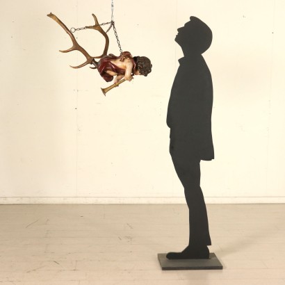 Luster tirolese con corna di cervo e putto musicante in legno intagliato a patinatura policroma. La scultura è solitamente appesa al soffitto e sfruttata come lampadario.