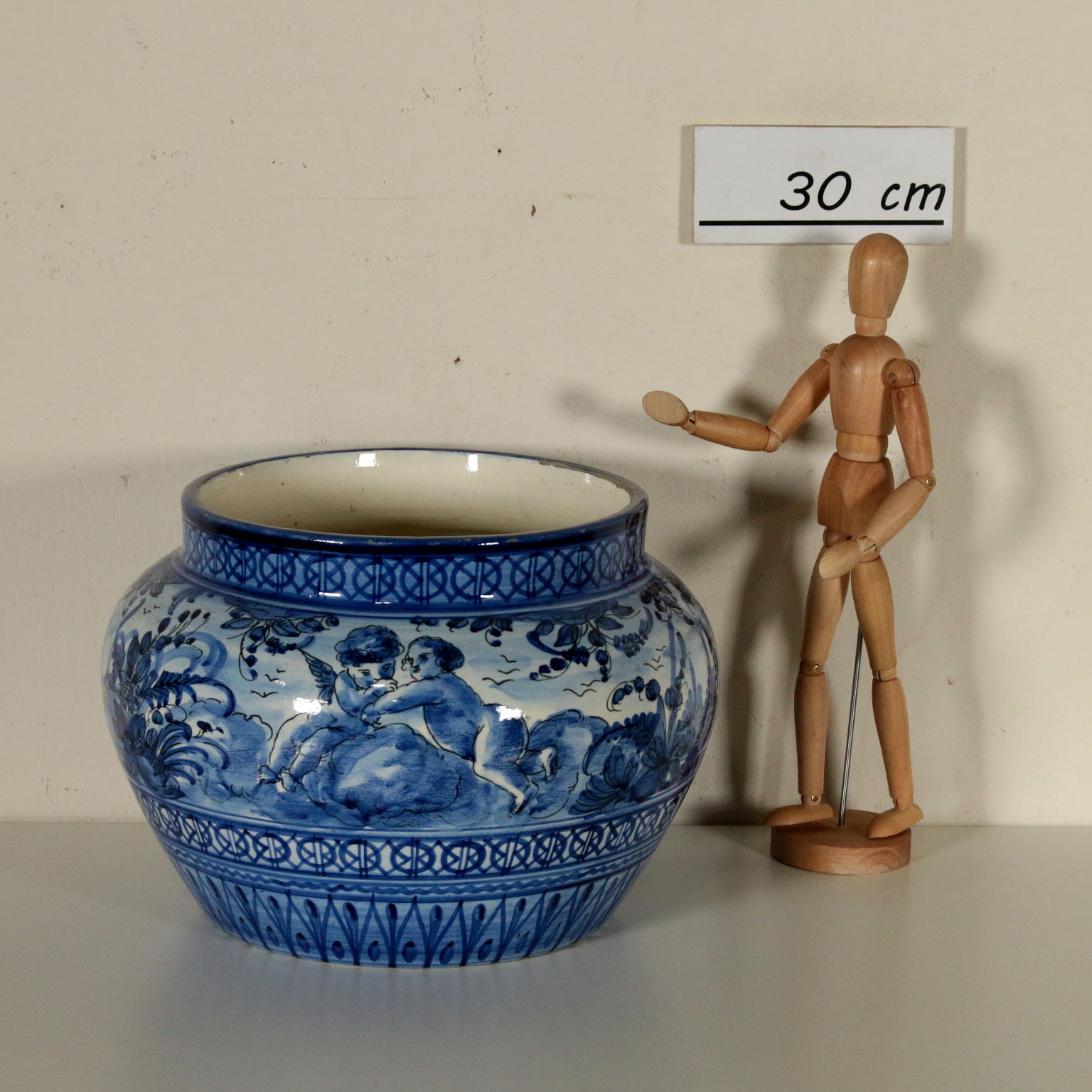 Cachepot in maiolica bianca e blu con decori a motivi geometrici, paesaggio e putti. Marchio della manifattura sotto la base.