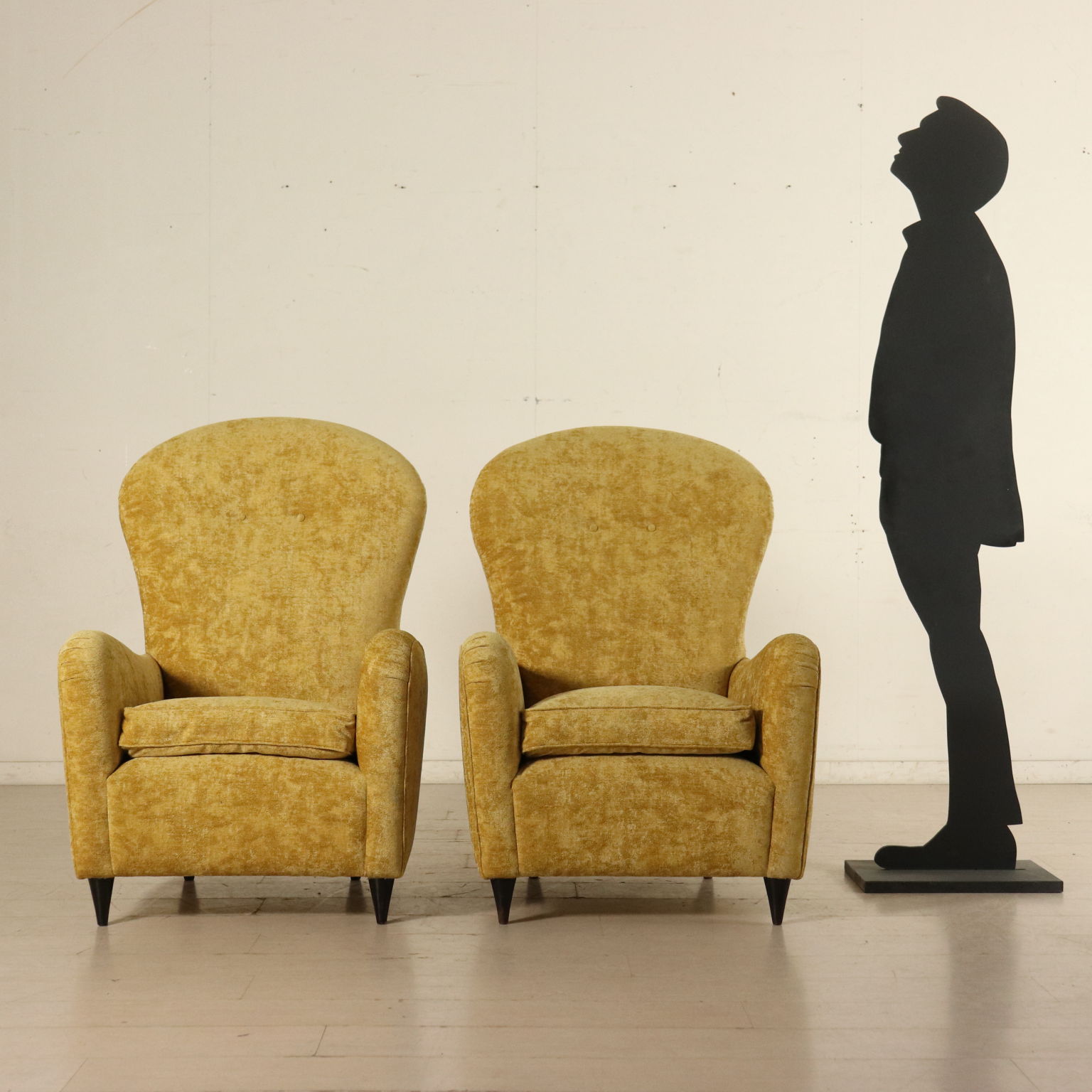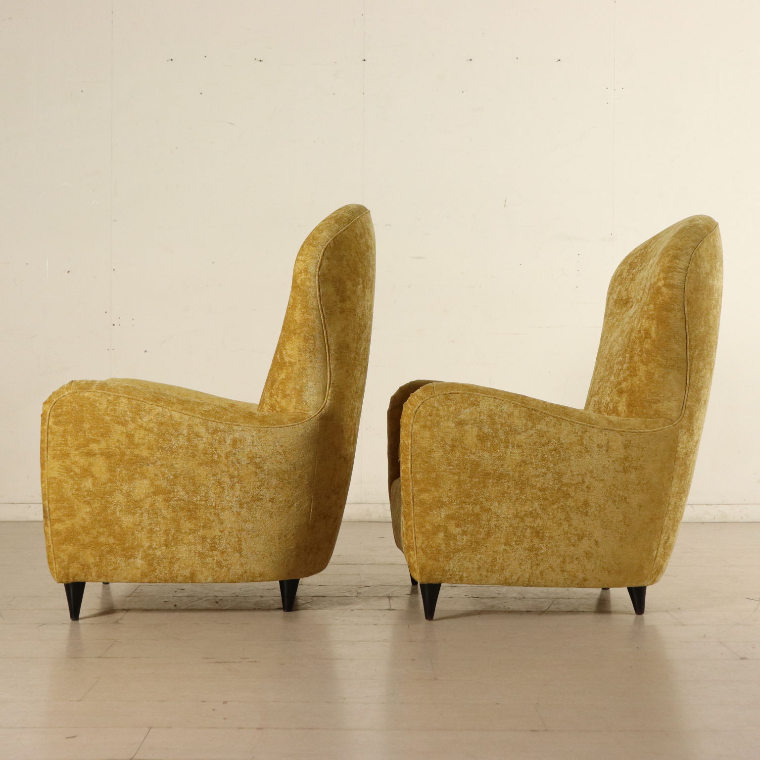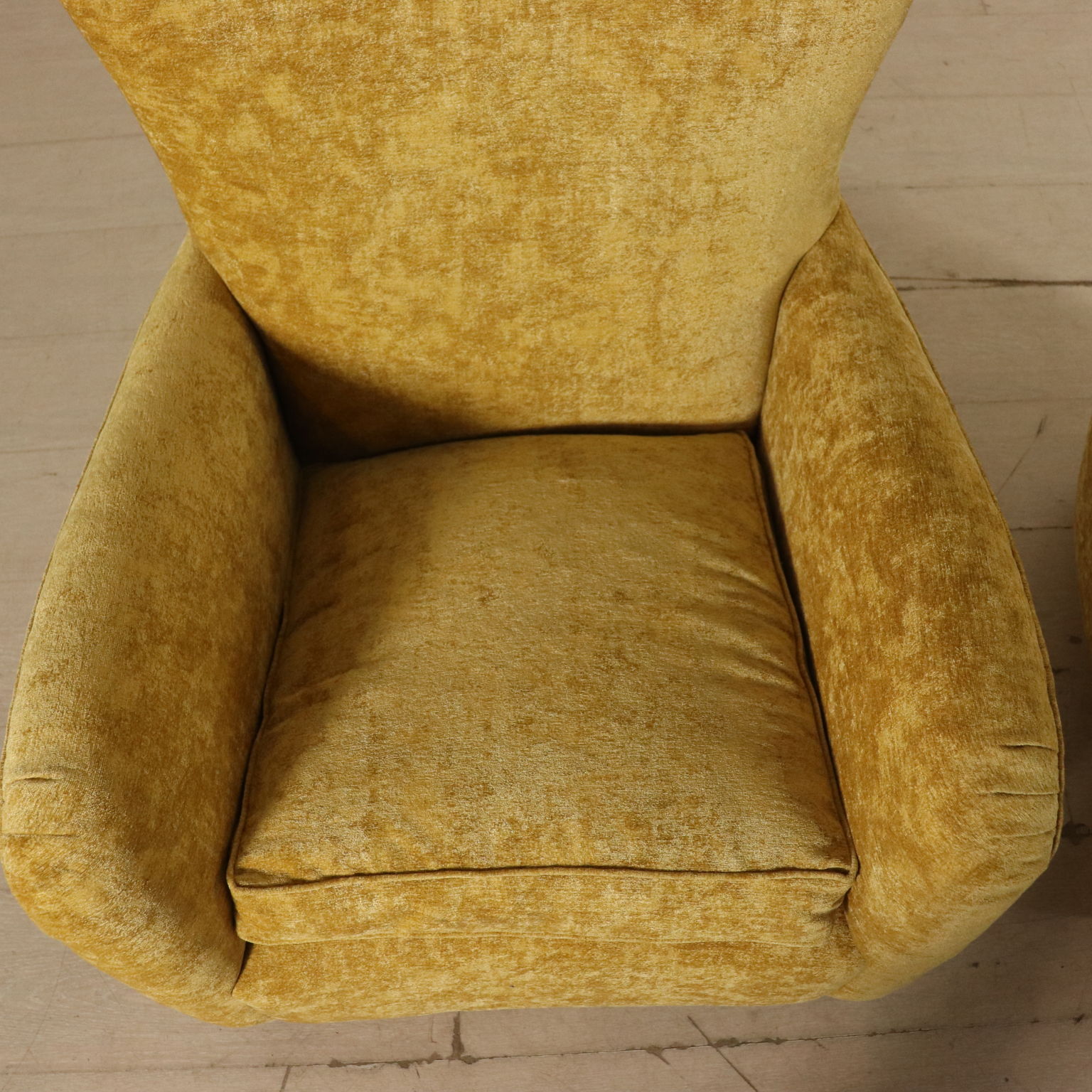 Coppia di poltrone; imbottitura a molle, cuscini in piuma. Rivestimento in velluto.