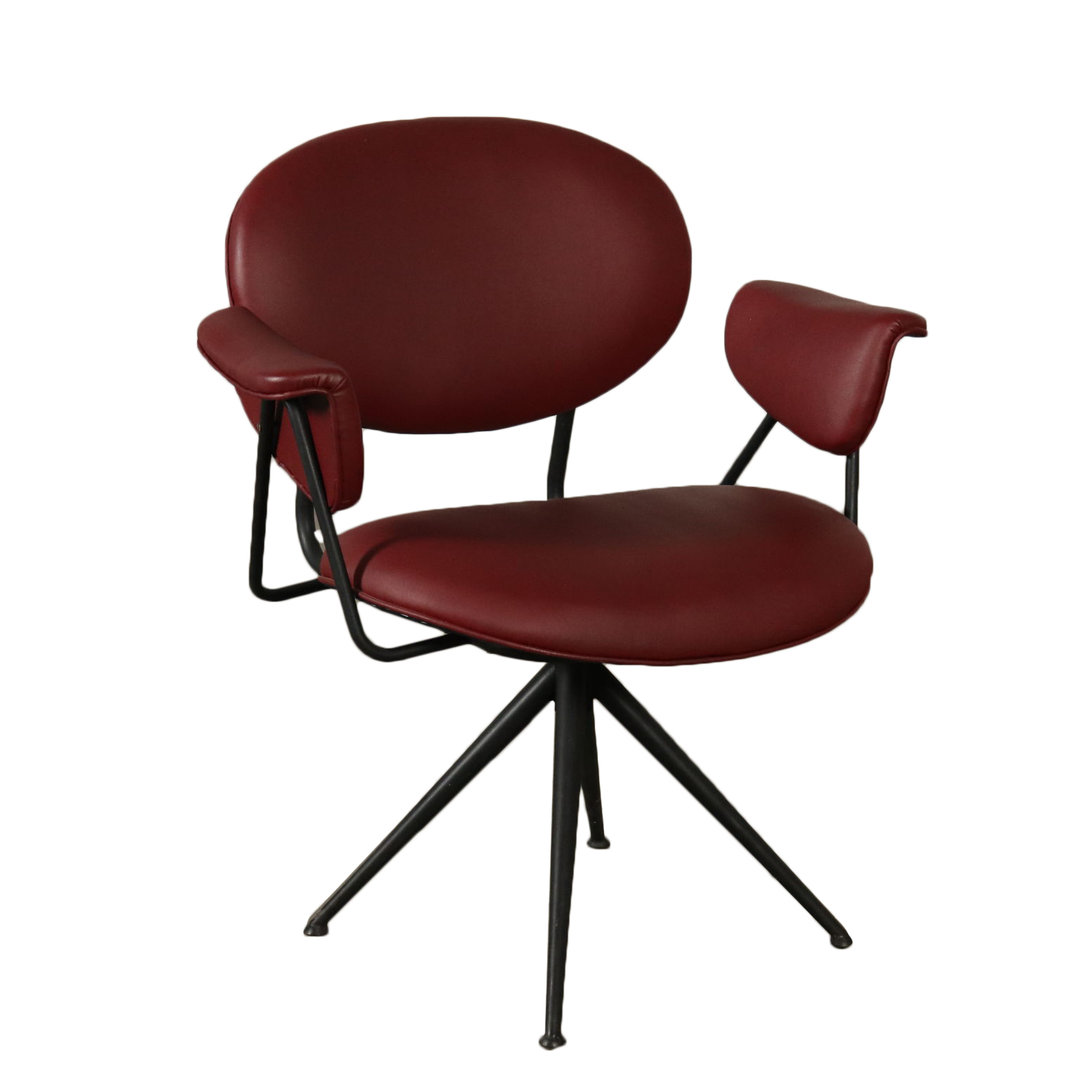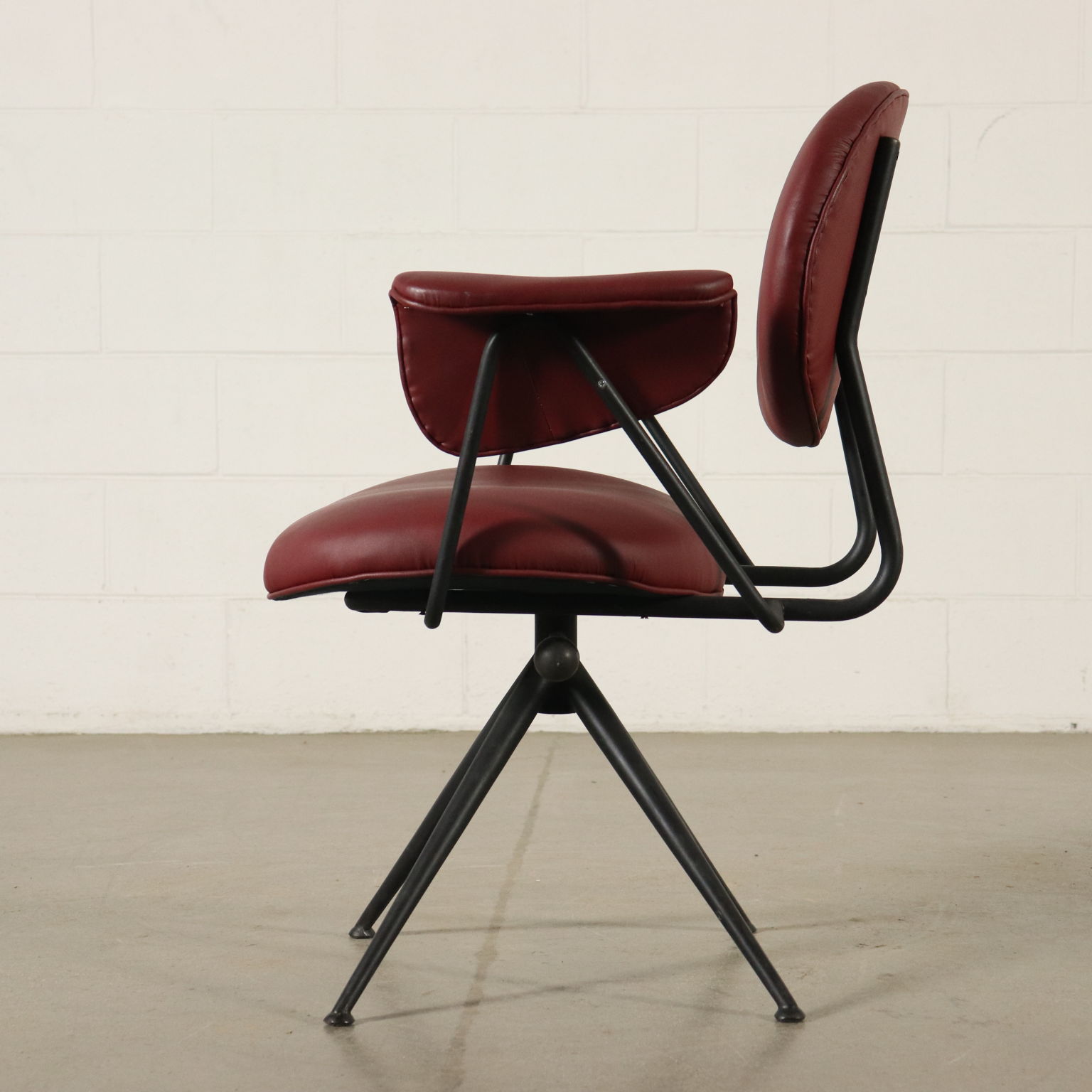 Sedia girevole con braccioli, imbottitura espanso, rivestimento in similpelle, gambe in metallo.