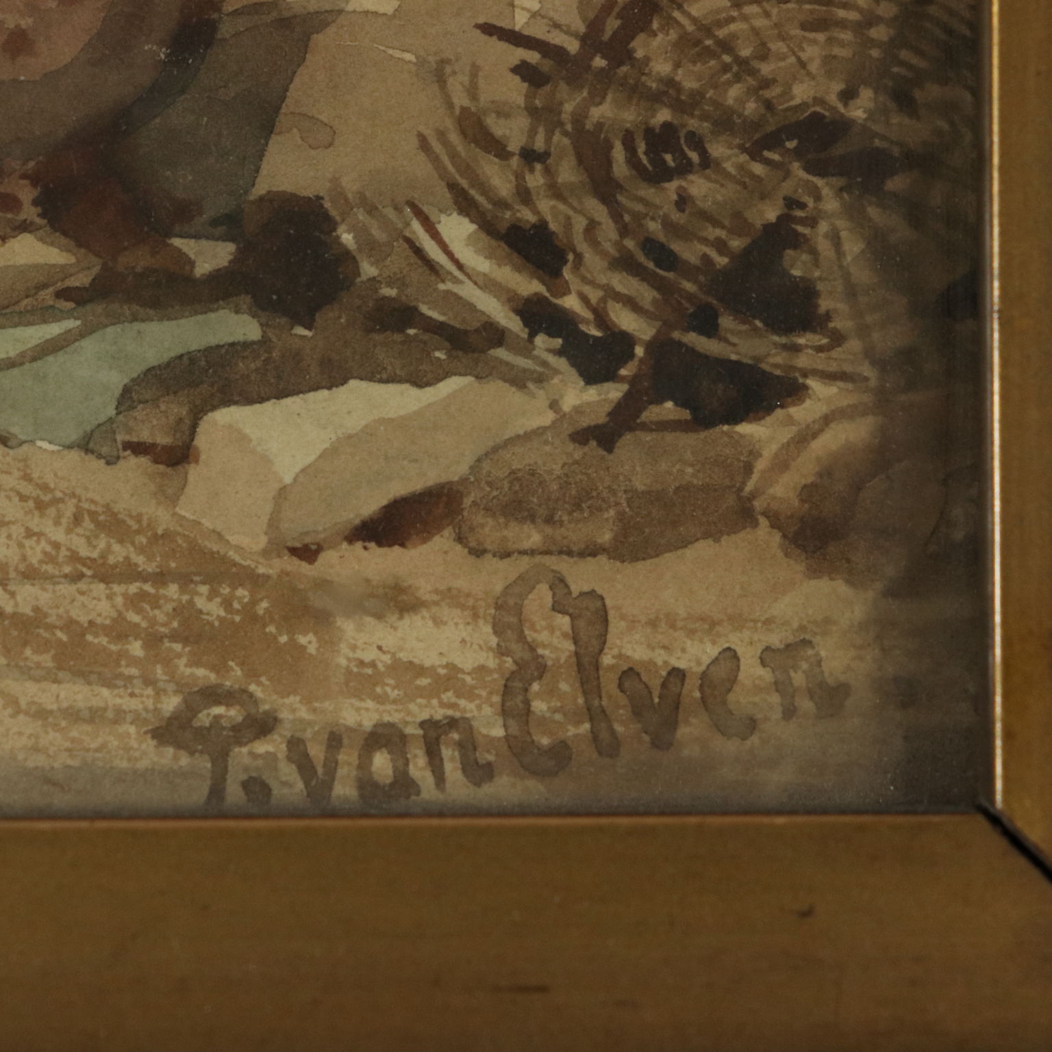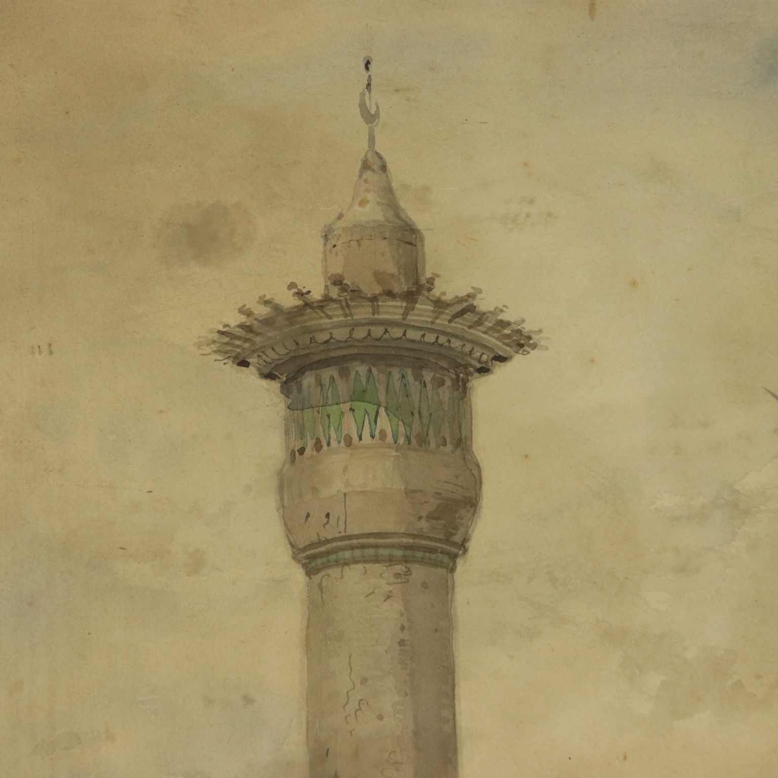 Acquerello su carta, firmato in basso a destra. Rappresentazione di ambiente rurale orientale con minareto ed abitazioni. L'artista olandese è specializzato in paesaggistica di matrice romantica, ispirata a luoghi conosciuti, che conservano una vena realistica. In cornice.