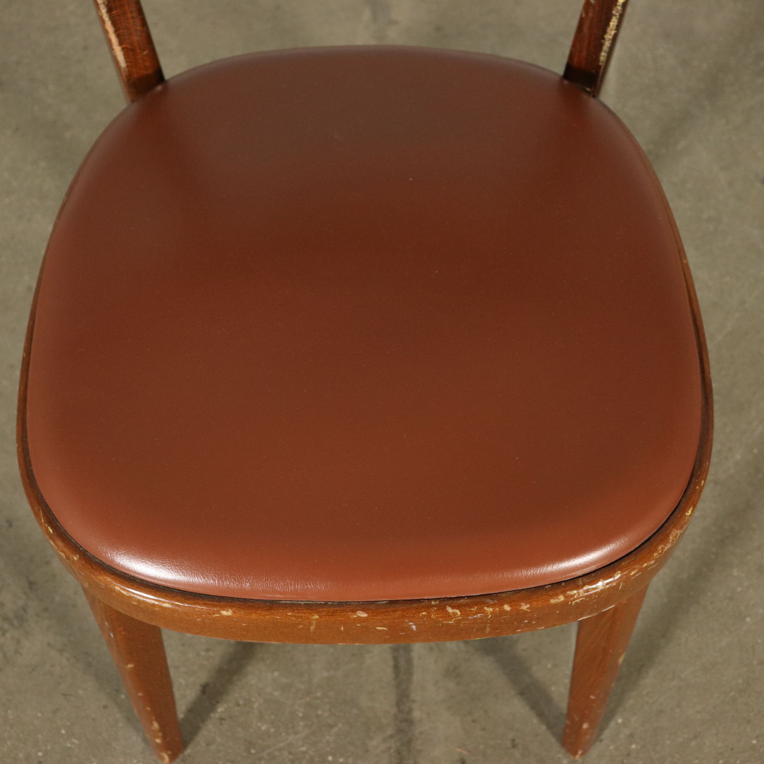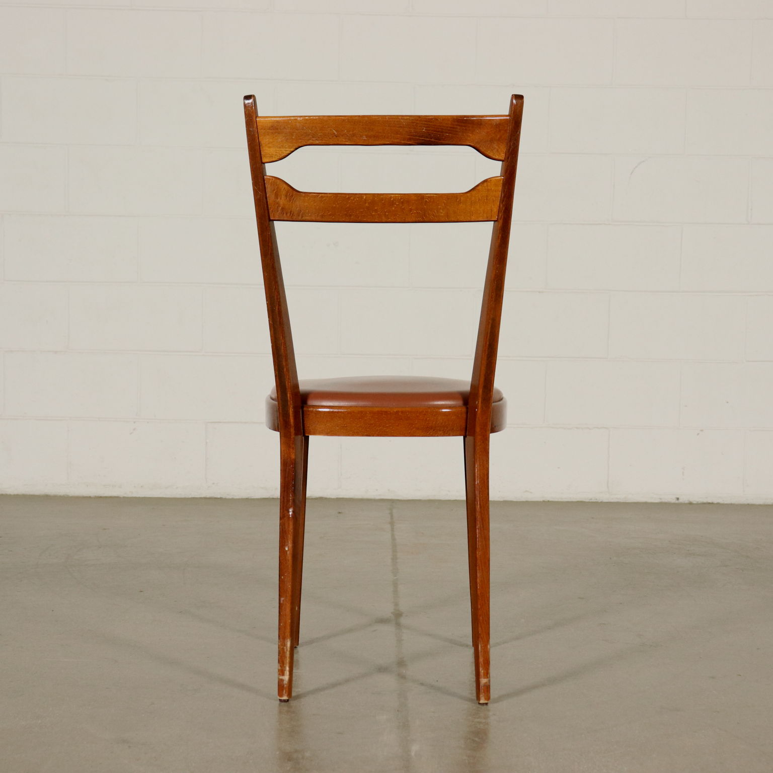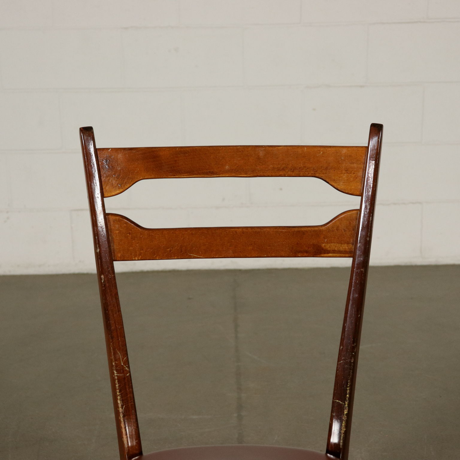 Gruppo di quattro sedie; legno di faggio tinto, seduta in espanso con rivestimento in similpelle.