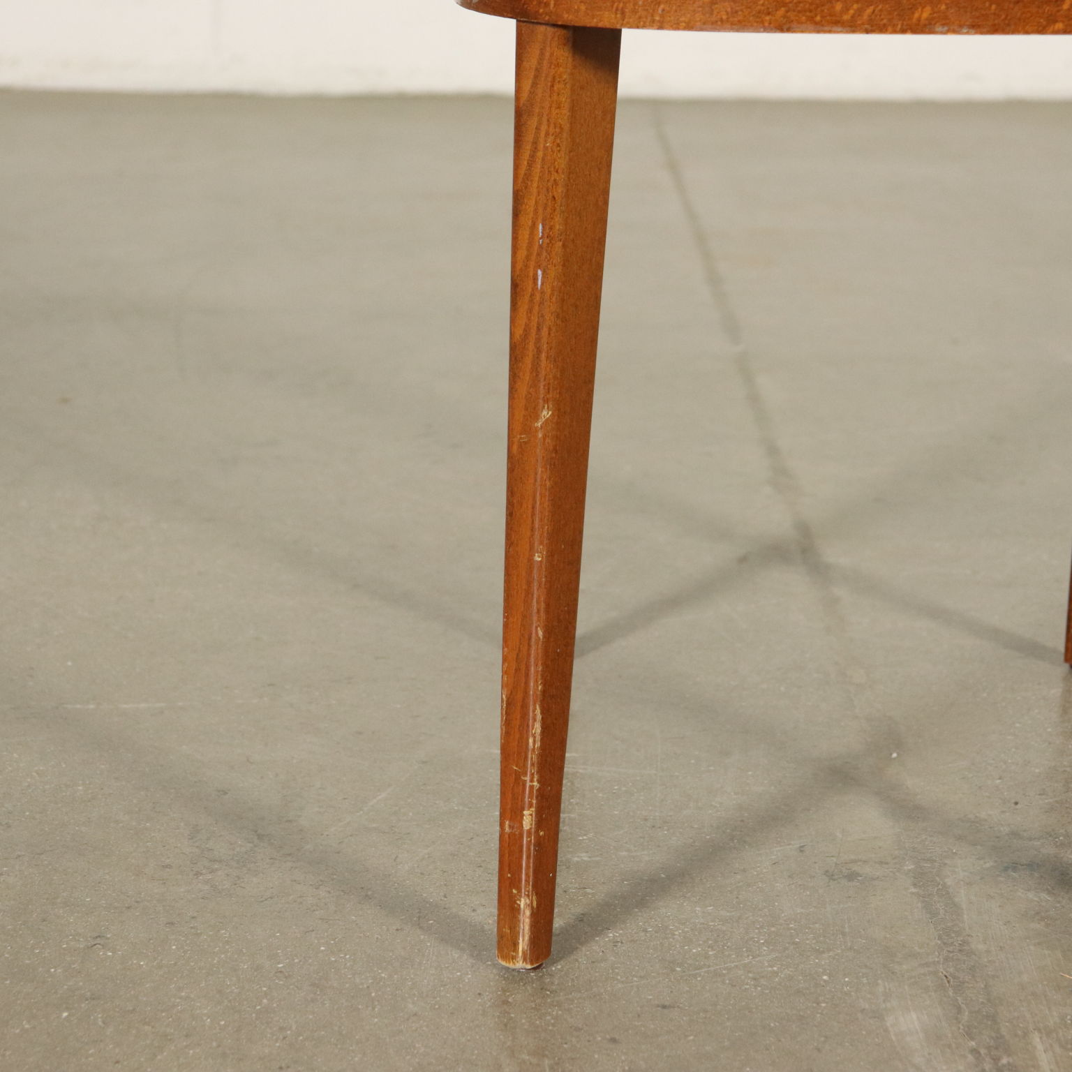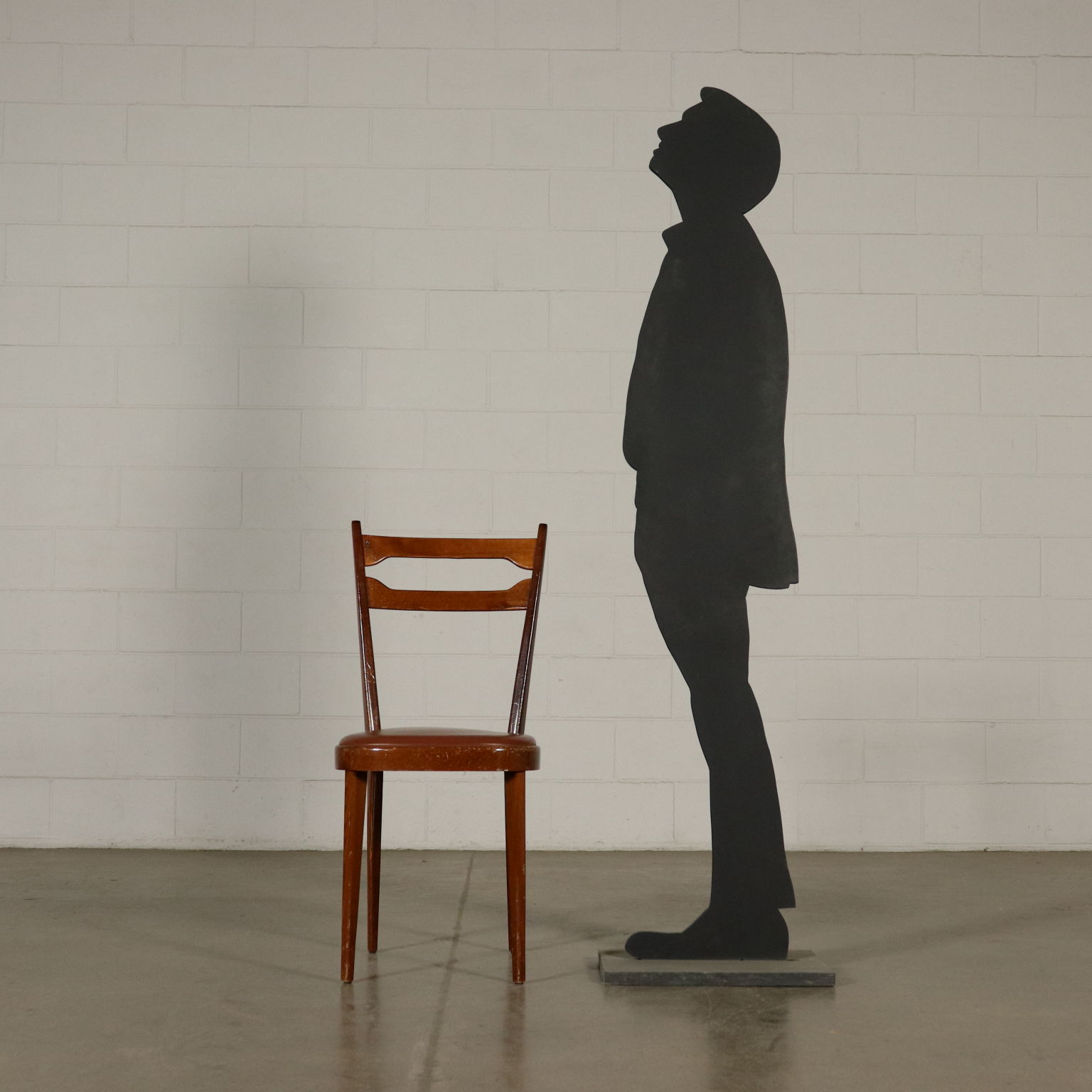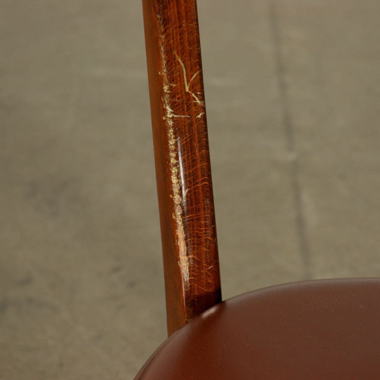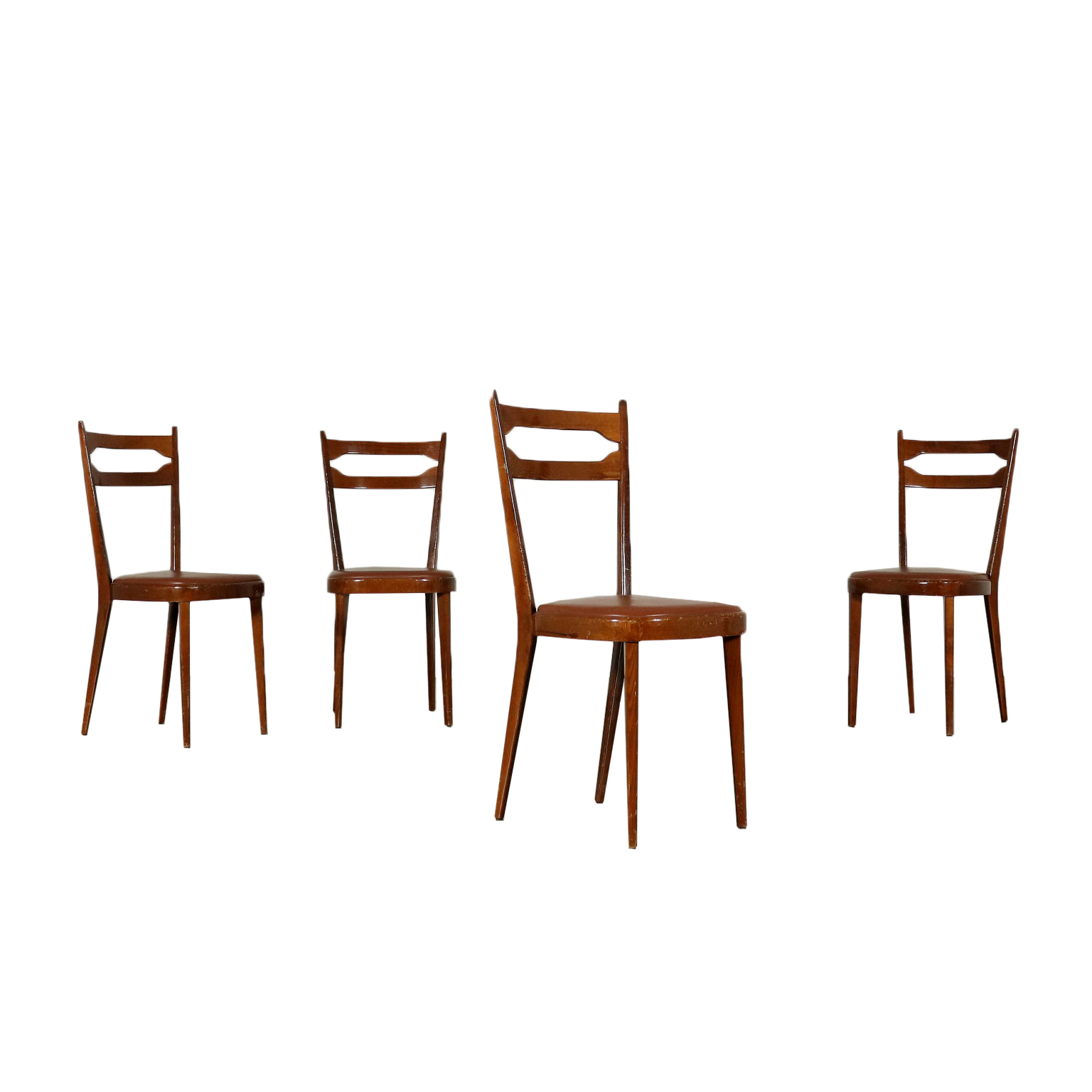 Gruppo di quattro sedie; legno di faggio tinto, seduta in espanso con rivestimento in similpelle.