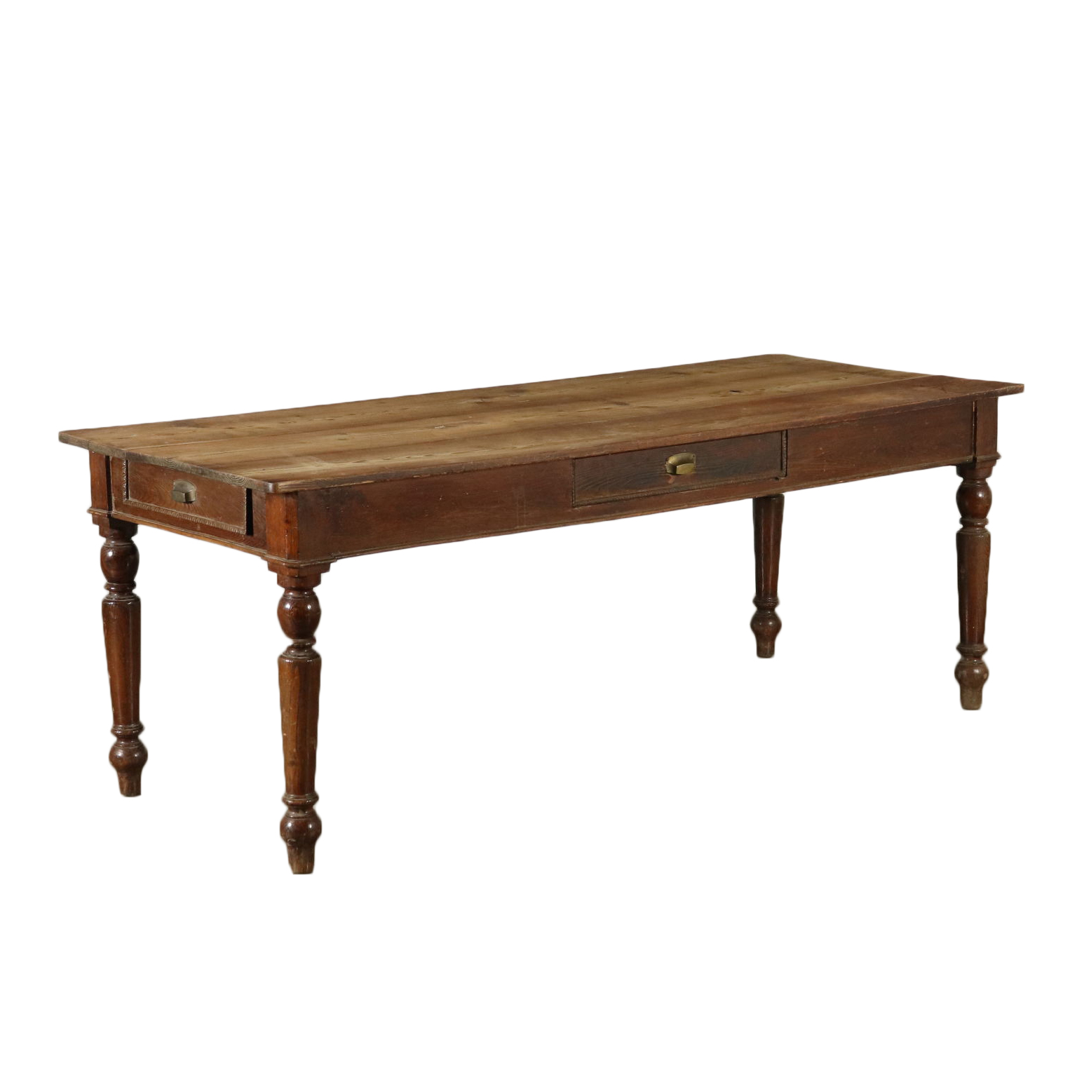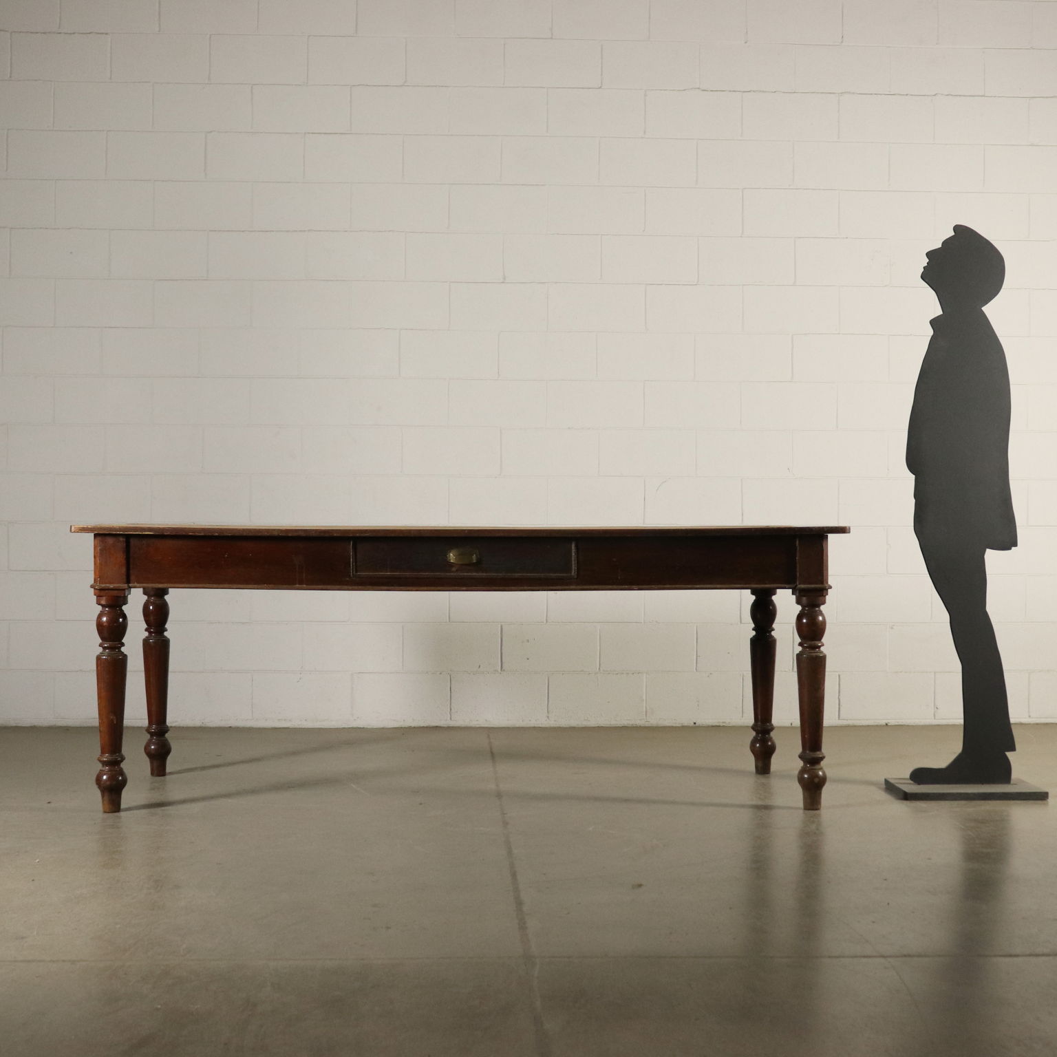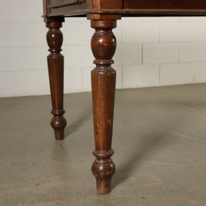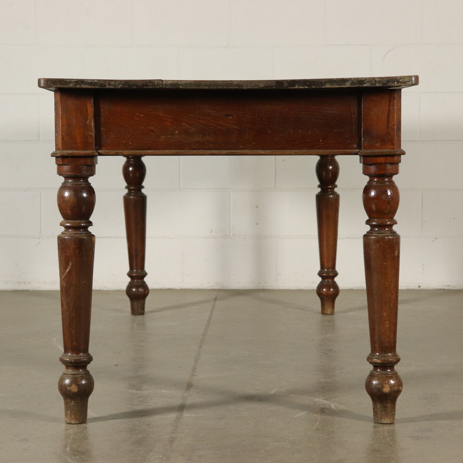 Tavolo di grandi dimensioni retto da gambe tornite. Presenta un cassetto nella fascia e piano scorniciato.