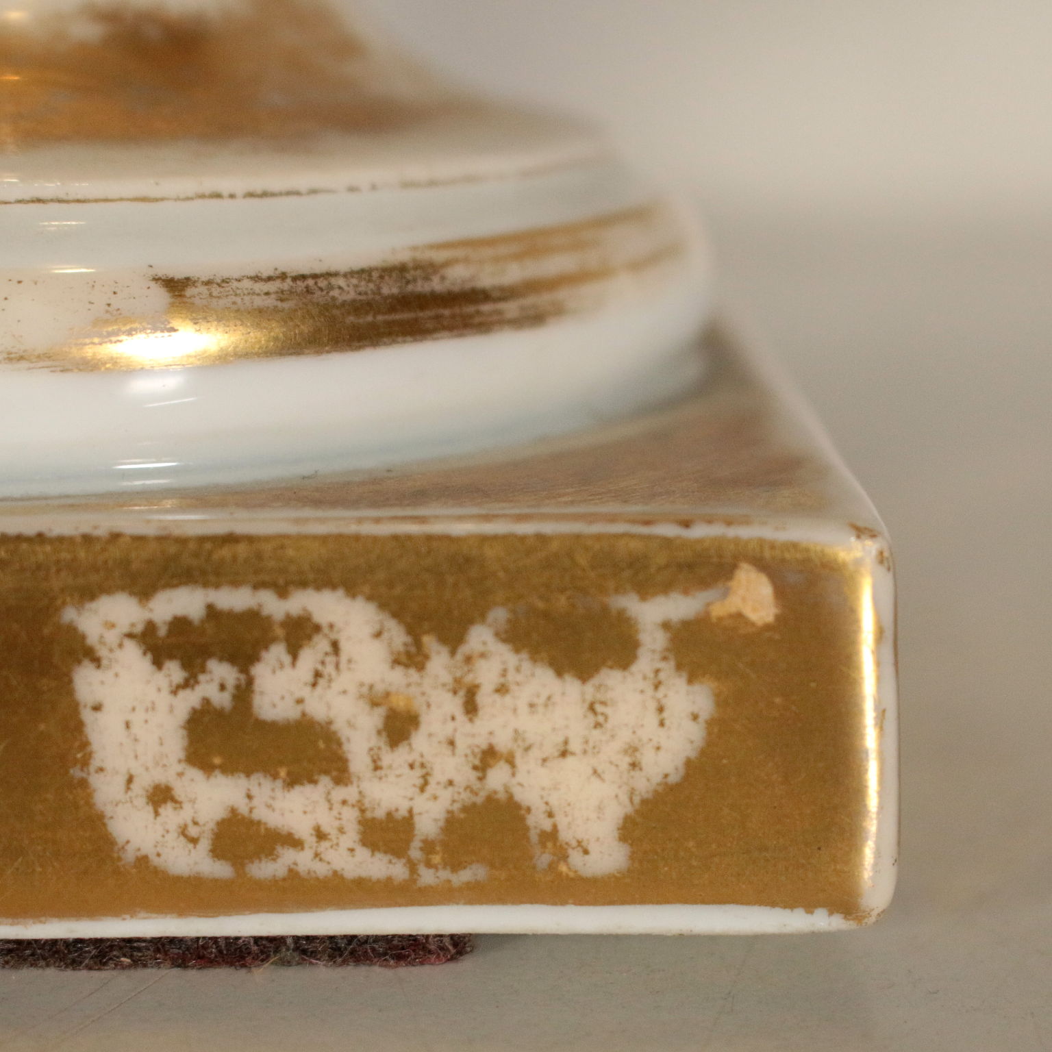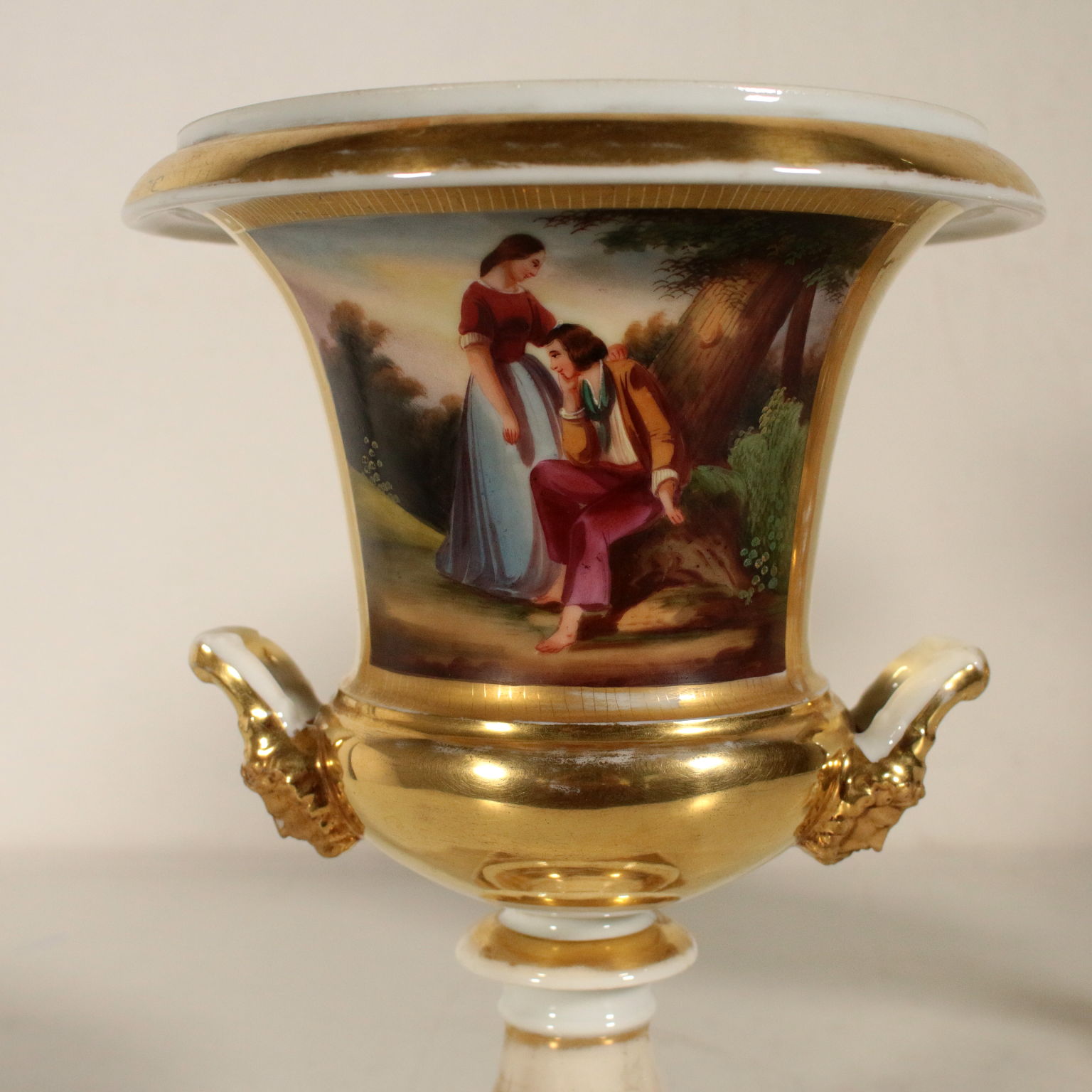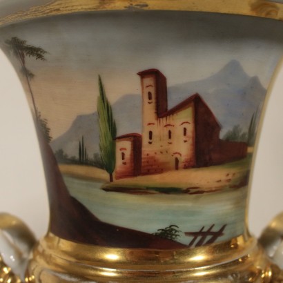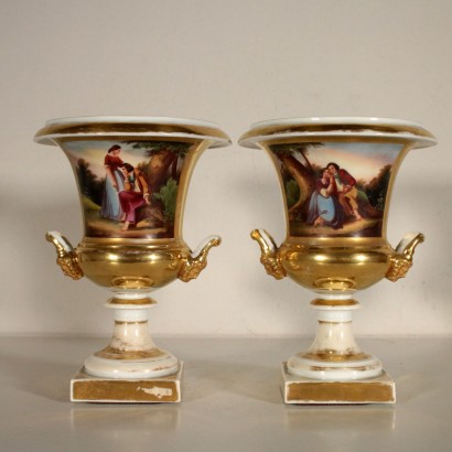 Coppia di vasi in porcellana decorati in oro zecchino; nelle riserve dipinti a paesaggio e scene amorose. I vasi presentano piccole anse con mascheroni.